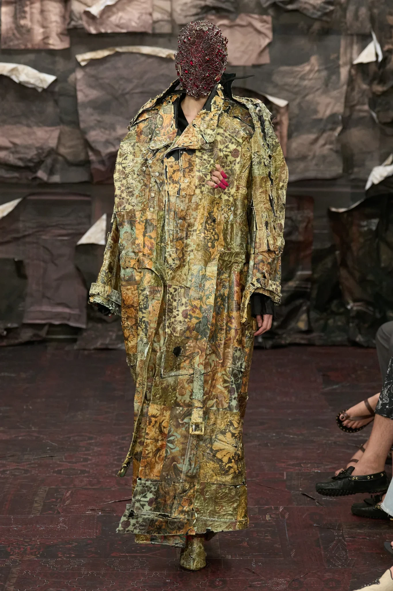 Αυτή η επίδειξη της σειράς Artisanal ήρθε περίπου 18 μήνες μετά τον θριαμβευτικό αποχαιρετισμό του Gallian, με κάποια ρούχα να μοιάζουν σαν να είχαν θαφτεί για καιρό, με τα λουλουδάτα μοτίβα σε στυλ παλιάς ταπετσαρίας να είναι ξεθωριασμένα, λερωμένα και σκασμένα.