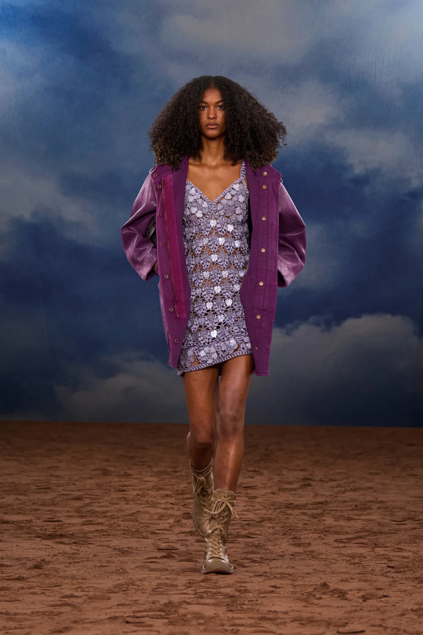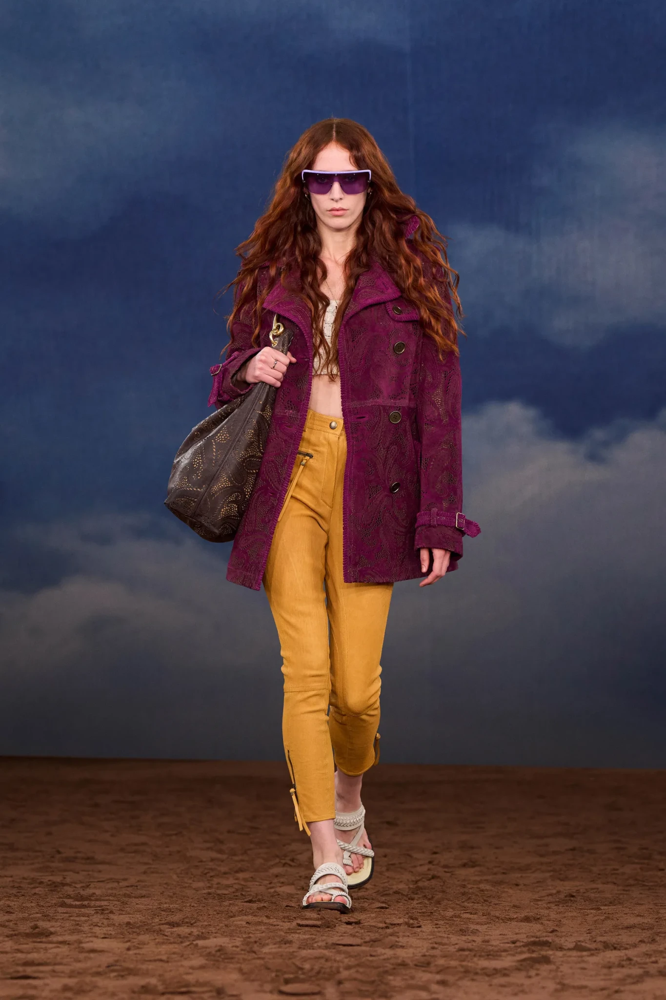 Η εναλλαγή ανάμεσα σε αυστηρά κοψίματα και ρευστές φόρμες έδωσε στη συλλογή μια δυναμική ισορροπία. Από τη μία είδαμε ρετρό κοστούμια που παραπέμπουν στα '60s, με έντονες γραμμές και επιβλητική παρουσία, κι από την άλλη crochet φορέματα, μίνι με κρόσσια, ριχτές ζακέτες και oversized duffle bags που ανέδιδαν μια πιο χαλαρή ενέργεια. Οι λεπτομέρειες στο styling – skinny scarves, μεγάλες ζώνες, μπότες με rock διάθεση – ενίσχυσαν το concept του φεστιβάλ και απέδειξαν ότι η Burberry μπορεί να μεταφράσει την έννοια της «ανεπιτήδευτης πολυτέλειας» σε κάτι άμεσα αναγνωρίσιμο.