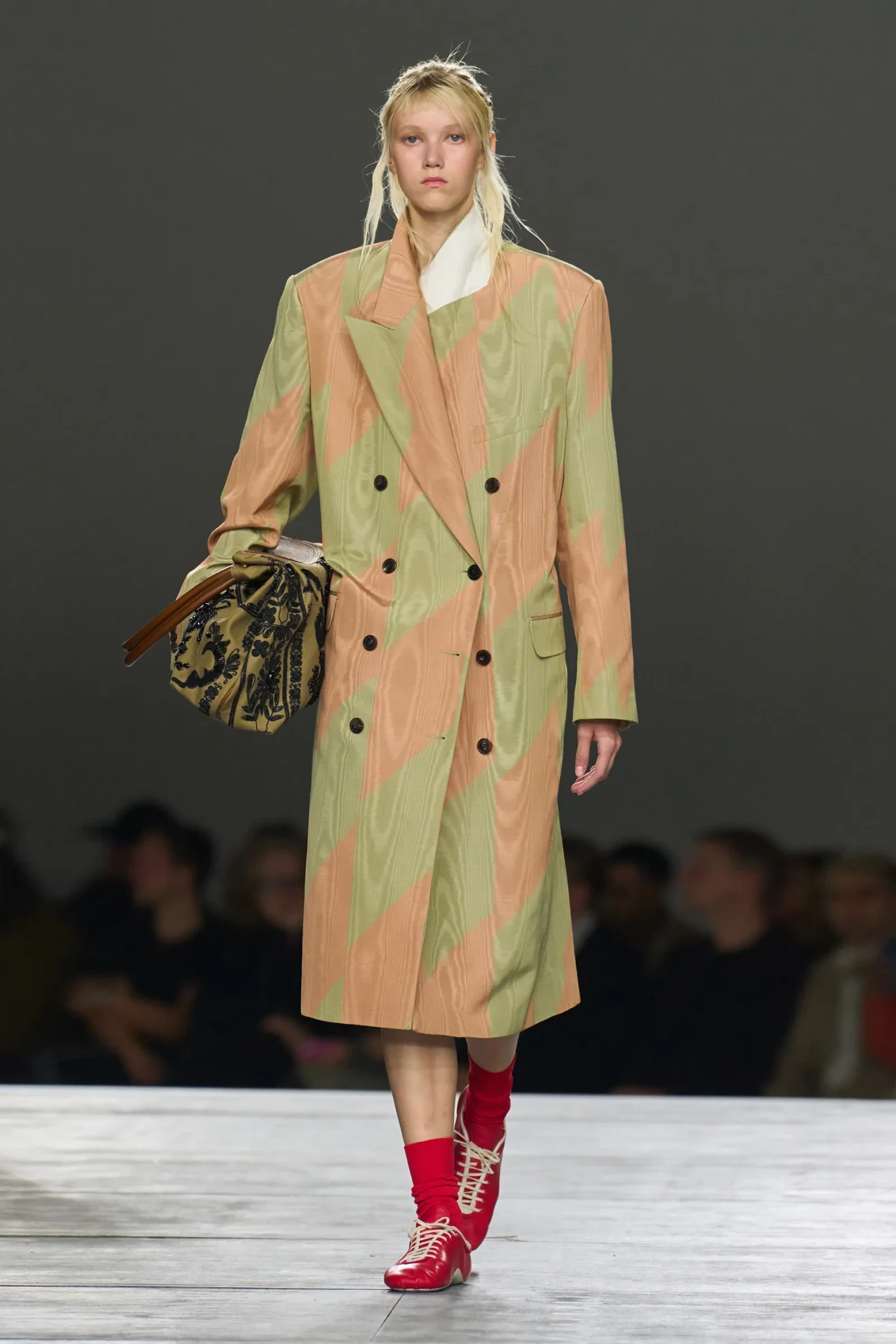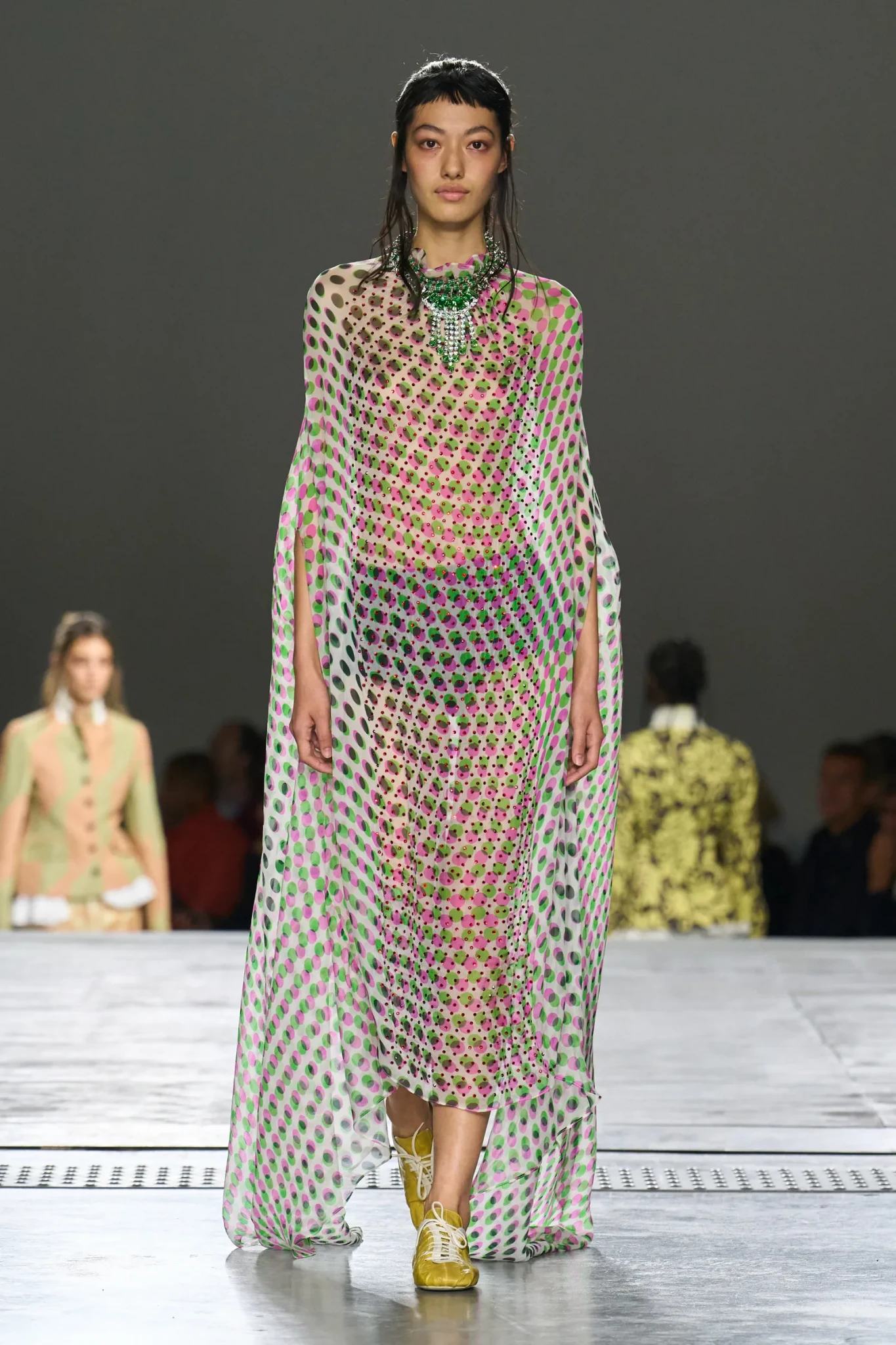 Η παρουσίαση του Dries Van Noten, υπό τη δημιουργική διεύθυνση του Julian Klausner, ανέδειξε την τέχνη του layering και των εκτυφλωτικών prints. Η συλλογή για την Spring/Summer 2025 season ήταν γεμάτη έντονες αντιθέσεις, συνδυάζοντας το tailoring με τις χαλαρές σιλουέτες.
