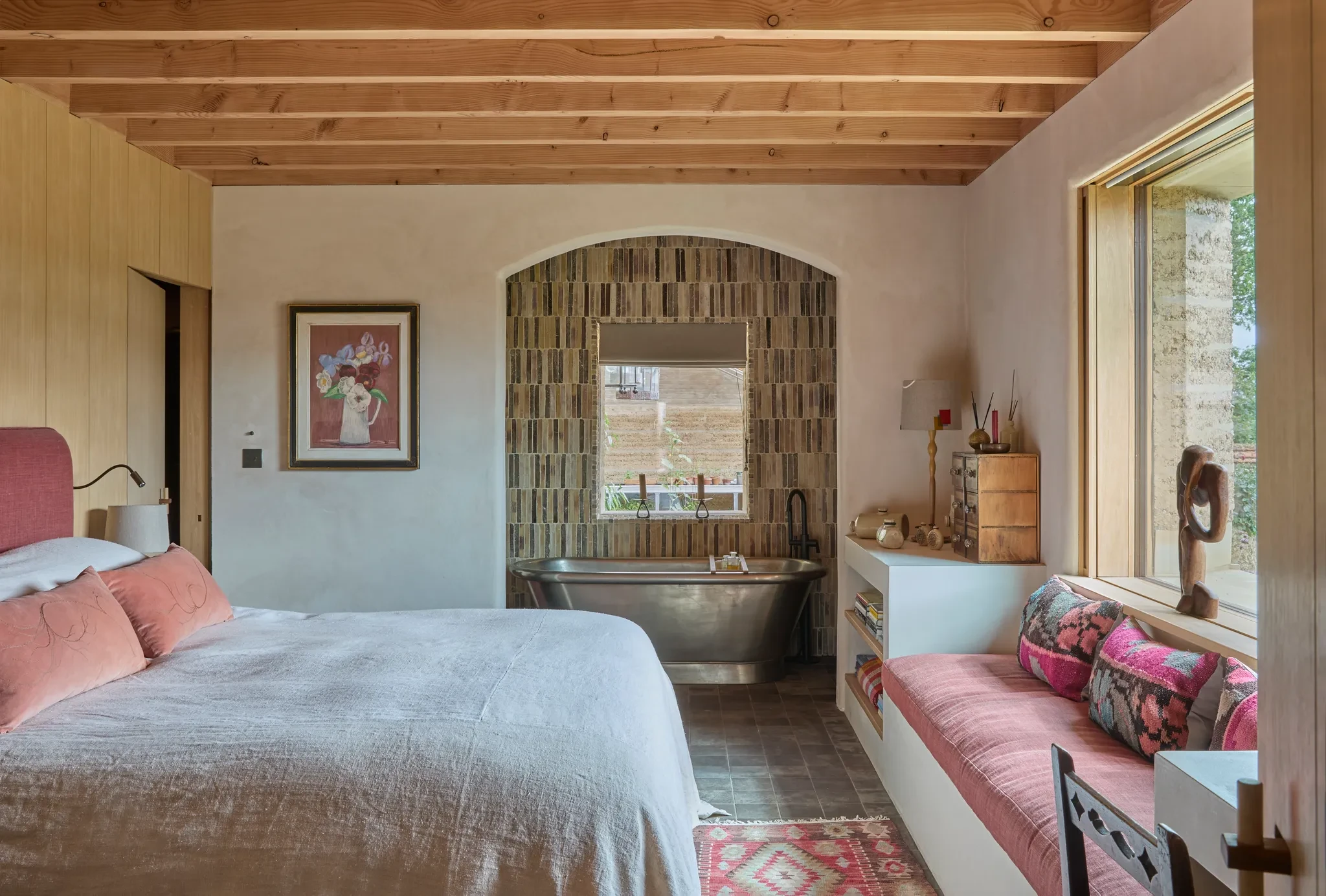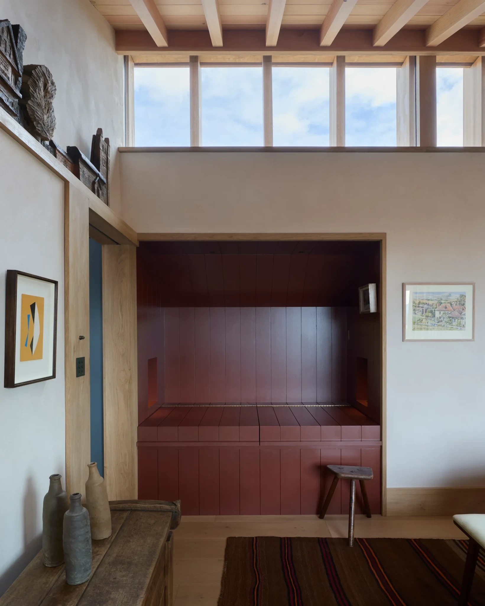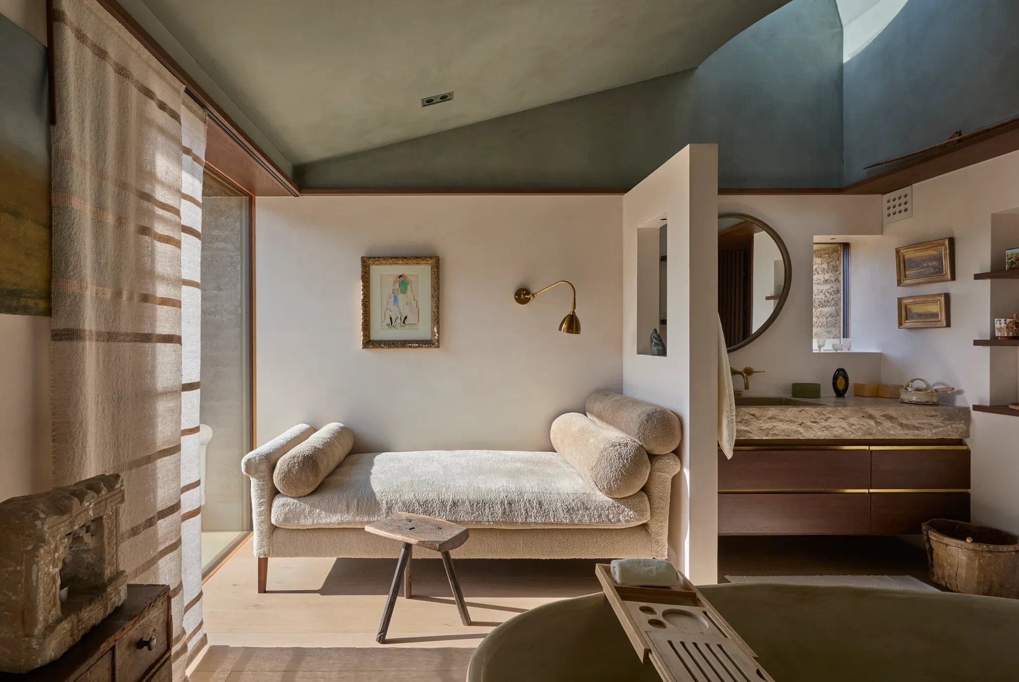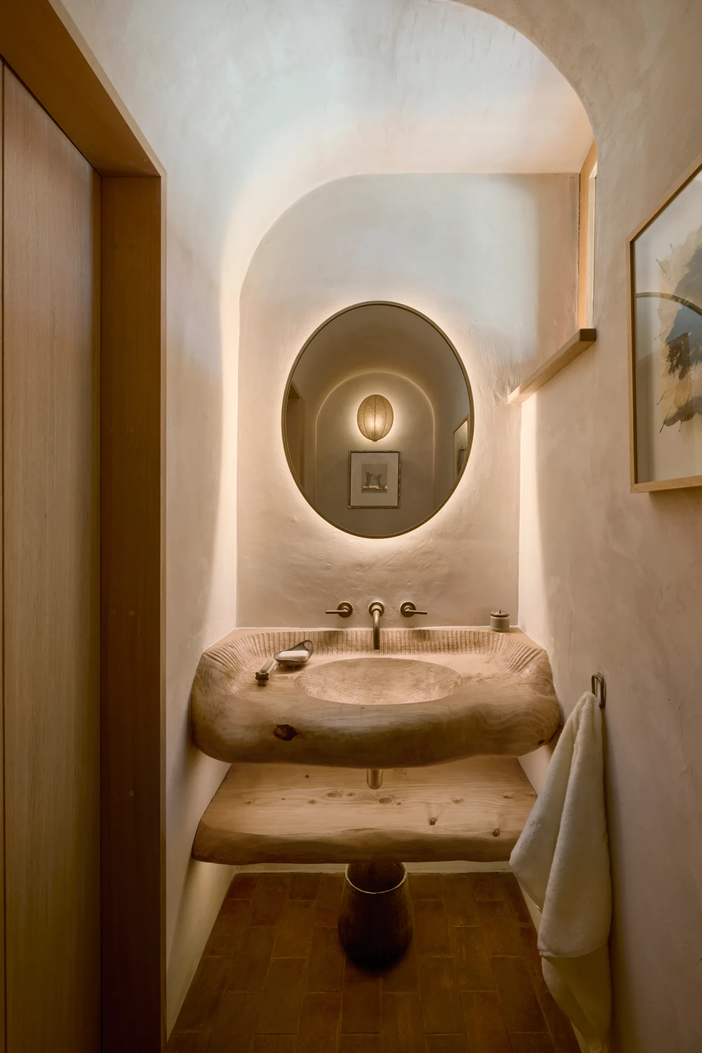 Στο εσωτερικό, η εμπειρία συνεχίζεται με την ίδια υλικότητα όπως και στο εξωτερικό. Οι τοίχοι από “rammed earth” δημιουργούν ένα περιβάλλον σχεδόν σπηλαιώδες, με απαλή, διάχυτη φωτεινότητα, η οποία αλλάζει μέσα στη διάρκεια της ημέρας. Τα έπιπλα παραμένουν λιτά, με φυσικό ξύλο, λινά υφάσματα και πέτρινες λεπτομέρειες να ενισχύουν τη γήινη παλέτα του χώρου. Η διακόσμηση δεν λειτουργεί ως αντίθεση, αλλά ως προέκταση της αρχιτεκτονικής γλώσσας, επιτρέποντας στο υλικό να παραμένει πρωταγωνιστής της εικόνας.