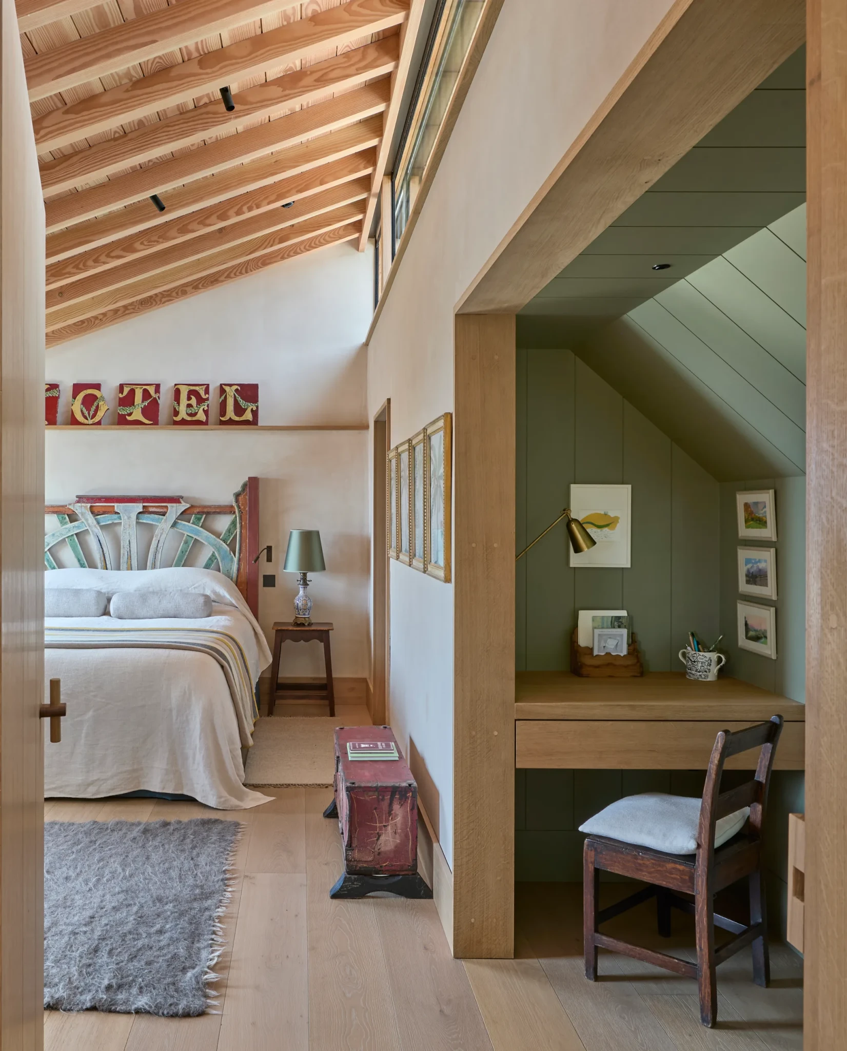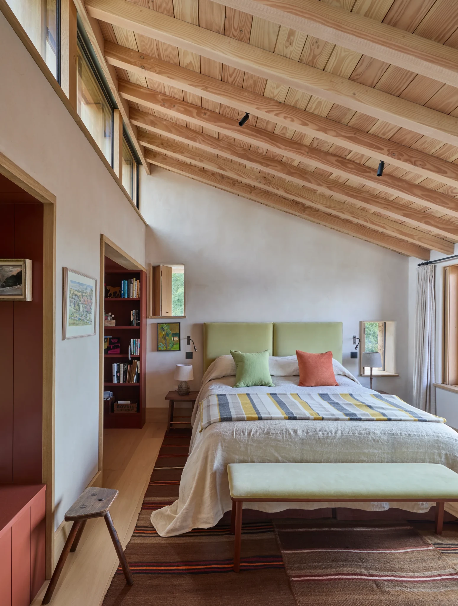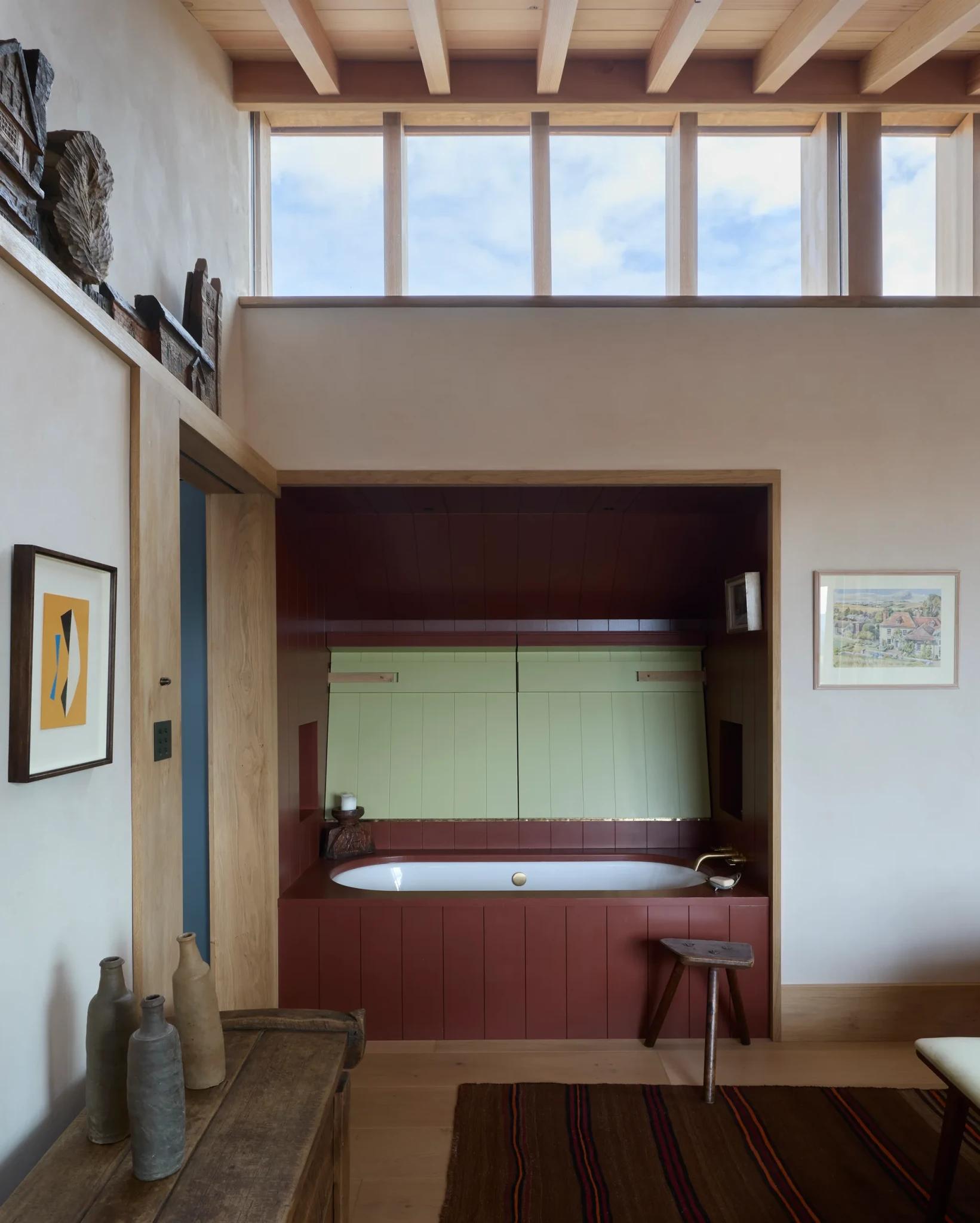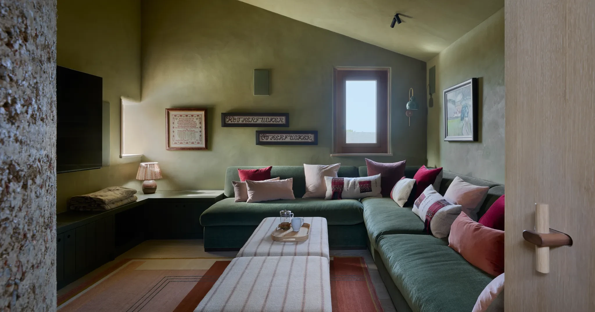 Στο εσωτερικό, η εμπειρία συνεχίζεται με την ίδια υλικότητα όπως και στο εξωτερικό. Οι τοίχοι από “rammed earth” δημιουργούν ένα περιβάλλον σχεδόν σπηλαιώδες, με απαλή, διάχυτη φωτεινότητα, η οποία αλλάζει μέσα στη διάρκεια της ημέρας. Τα έπιπλα παραμένουν λιτά, με φυσικό ξύλο, λινά υφάσματα και πέτρινες λεπτομέρειες να ενισχύουν τη γήινη παλέτα του χώρου. Η διακόσμηση δεν λειτουργεί ως αντίθεση, αλλά ως προέκταση της αρχιτεκτονικής γλώσσας, επιτρέποντας στο υλικό να παραμένει πρωταγωνιστής της εικόνας.