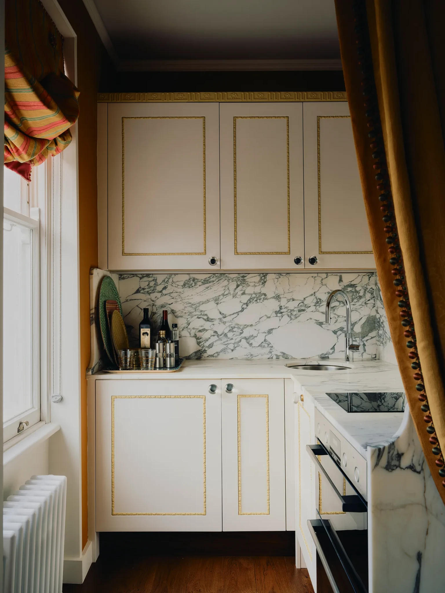 Ταυτόχρονα, τα ιστορικά στοιχεία του κτιρίου, όπως τα γύψινα διακοσμητικά και τα παλιά τζάκια, λειτουργούν ως φόντο για τις πιο σύγχρονες επιλογές. Αυτή η συνύπαρξη παλιού και νέου είναι ένα από τα χαρακτηριστικά που κάνουν το σπίτι τόσο ιδιαίτερο.
