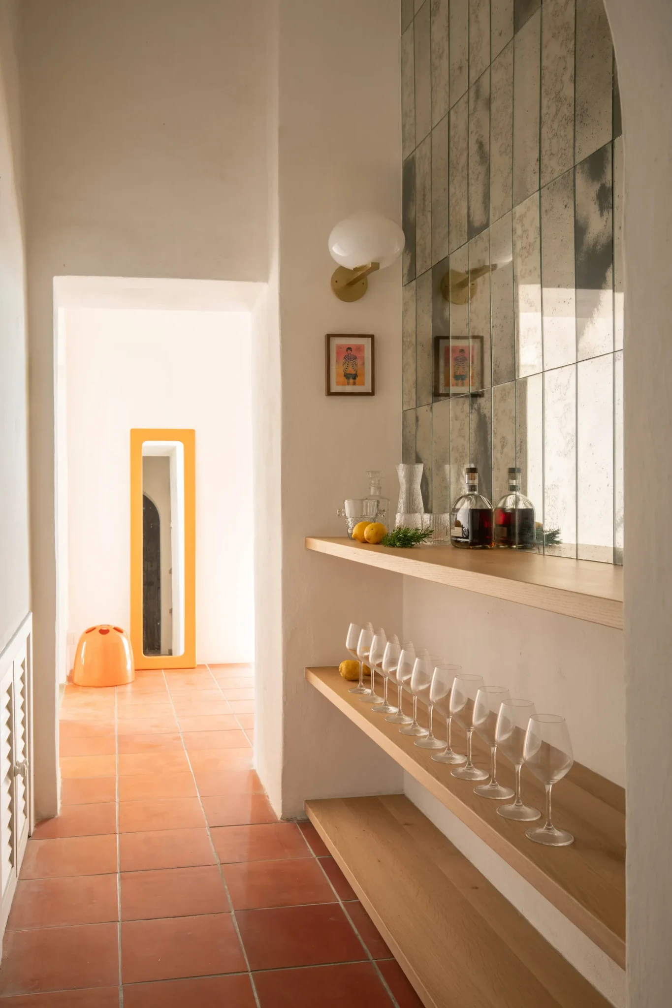 Το μικρό αλλά κομψό bar, με καθρέφτες γυαλιού, προσθέτει μια νότα πολυτέλειας, ενώ οι λεπτομέρειες στα υλικά και τα έπιπλα κατά παραγγελία αναδεικνύουν την ιδιαίτερη προσοχή στη σύνθεση του χώρου. Η χρωματική παλέτα είναι επιλεγμένη με φειδώ για να επιτρέπει στο μάτι να περιηγείται φυσικά από γωνιά σε γωνιά, δημιουργώντας μια αίσθηση ρυθμού και αρμονίας.