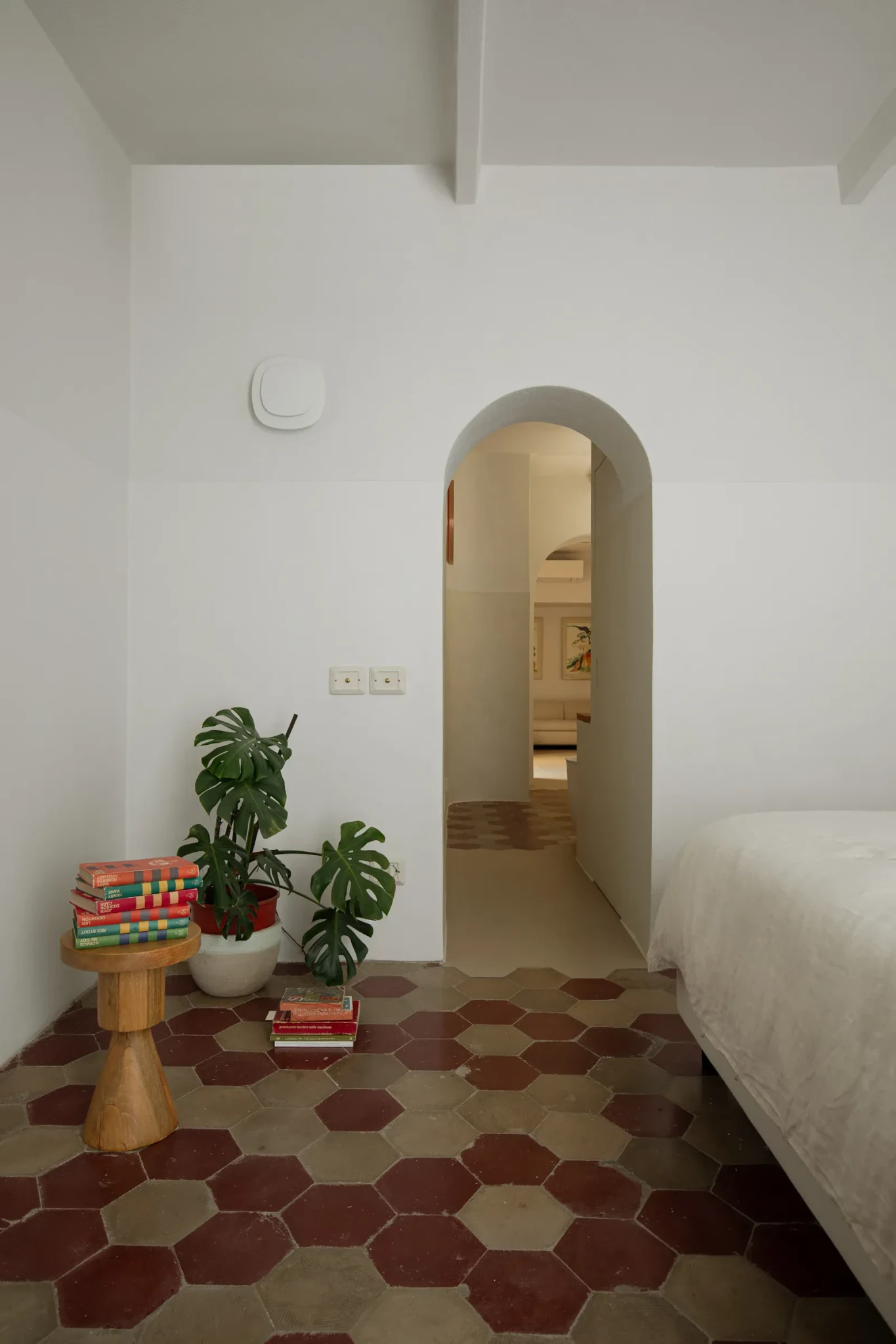 Η κύρια κρεβατοκάμαρα αντιμετωπίζεται ως ένα μοναδικό σκηνικό, με θέα στη θάλασσα από το κρεβάτι και χώρους που ρέουν χωρίς σαφή όρια. Η πρόσφατα ανακαινισμένη επέκταση του σπιτιού διαμορφώνει μια ενιαία διαδρομή, όπου τα ανοίγματα και οι διάδρομοι δημιουργούν σταδιακά την αίσθηση ενός θεατρικού χώρου. Το μπάνιο λειτουργεί ταυτόχρονα σαν πέρασμα και σύνδεση με το γραφείο, αποδεικνύοντας τη δημιουργική σκέψη πίσω από κάθε λεπτομέρεια. Το αποτέλεσμα είναι ένας χώρος που συνδυάζει τη μνήμη του παρελθόντος με μια σύγχρονη, ευρηματική ανάγνωση του οικιακού περιβάλλοντος.