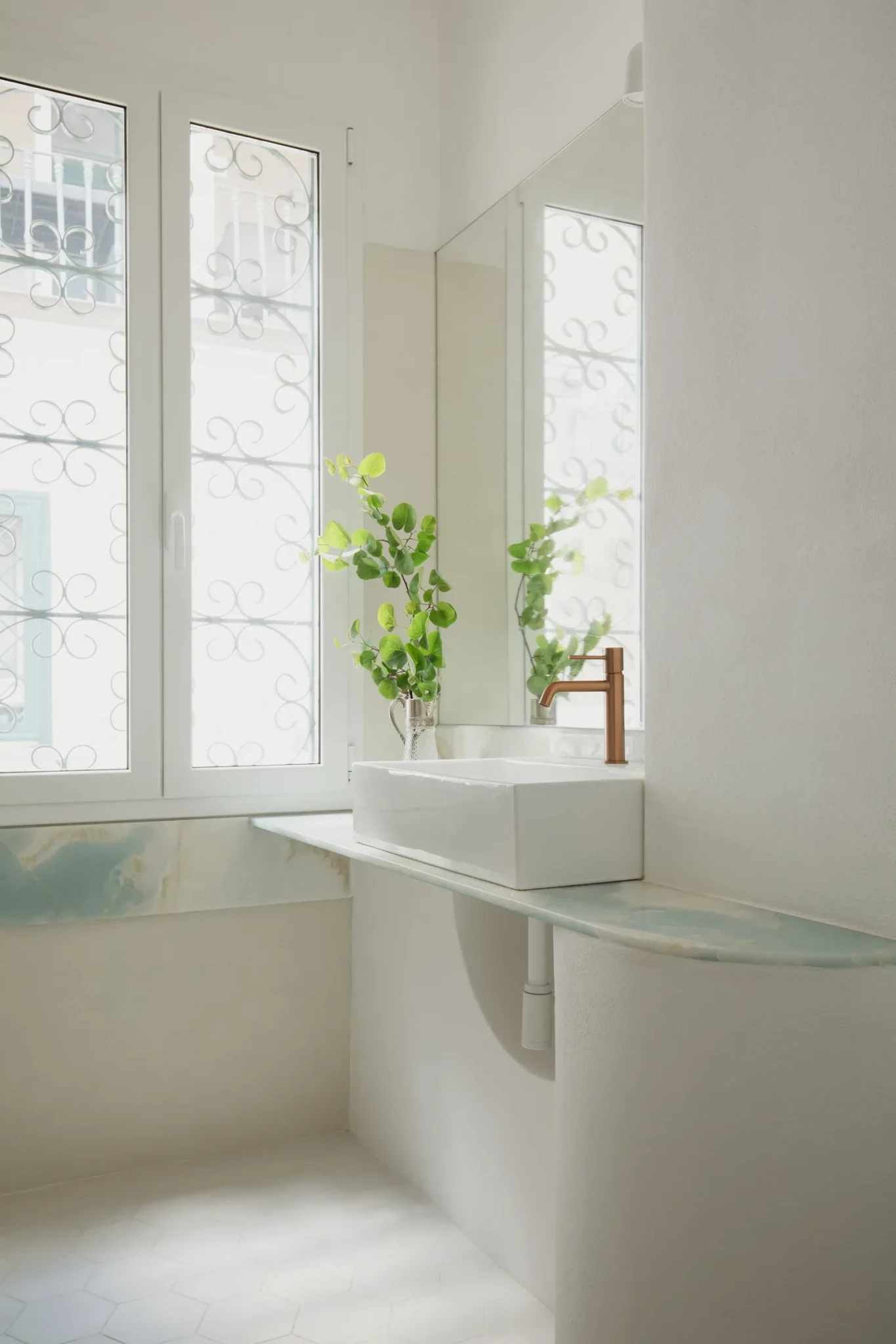 Τα υλικά παίζουν πρωταγωνιστικό ρόλο στους πιο προσωπικούς χώρους του σπιτιού. Τα μπάνια και η κύρια κρεβατοκάμαρα αντιμετωπίζονται σαν μικρές όασεις, κάθε μια με τη δική της ταυτότητα. Οι τοίχοι, με μια συνδυασμένη χρήση λείων και τραχιών επιφανειών, δημιουργούν βάθος και ζωντάνια. Το αυθεντικό δάπεδο από τσιμεντένιες πλάκες συνδυάζεται με νέο ξύλινο δάπεδο σε σχέδιο ψαροκόκκαλο, προσφέροντας μια ζεστή και ζωντανή αίσθηση φυσικής υφής. Το μωσαϊκό σε butter τόνους και το εντυπωσιακό μπλε στα μπάνια δημιουργούν ιδιαίτερες γωνιές.