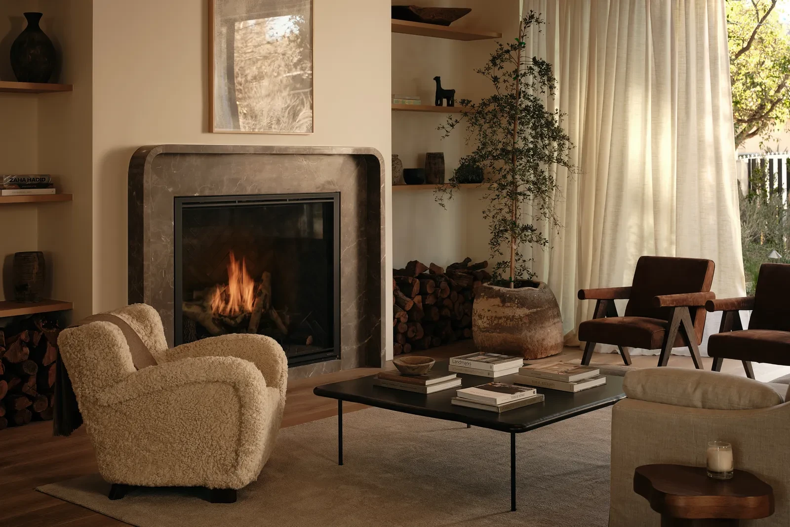 Κεντρικό στοιχείο της κατοικίας είναι τα πολλαπλά τζάκια που βρίσκονται σε διαφορετικά σημεία του σπιτιού, τα οποία δεν λειτουργούν μόνο ως πηγές θερμότητας, αλλά και ως βασικά αρχιτεκτονικά στοιχεία που οργανώνουν τον χώρο. Στο κυρίως καθιστικό, το μεγάλο πέτρινο τζάκι λειτουργεί ως σημείο αναφοράς, γύρω από το οποίο τοποθετούνται τα υπόλοιπα έπιπλα. Σε άλλους χώρους, μικρότερα τζάκια δημιουργούν πιο ιδιωτικές γωνιές, ιδανικές για ανάγνωση ή χαλάρωση.Η παρουσία της φωτιάς ενισχύει τη συνολική εμπειρία στο σπίτι, προσφέροντας μια αίσθηση θαλπωρής που συνδέεται άμεσα με το ορεινό τοπίο.