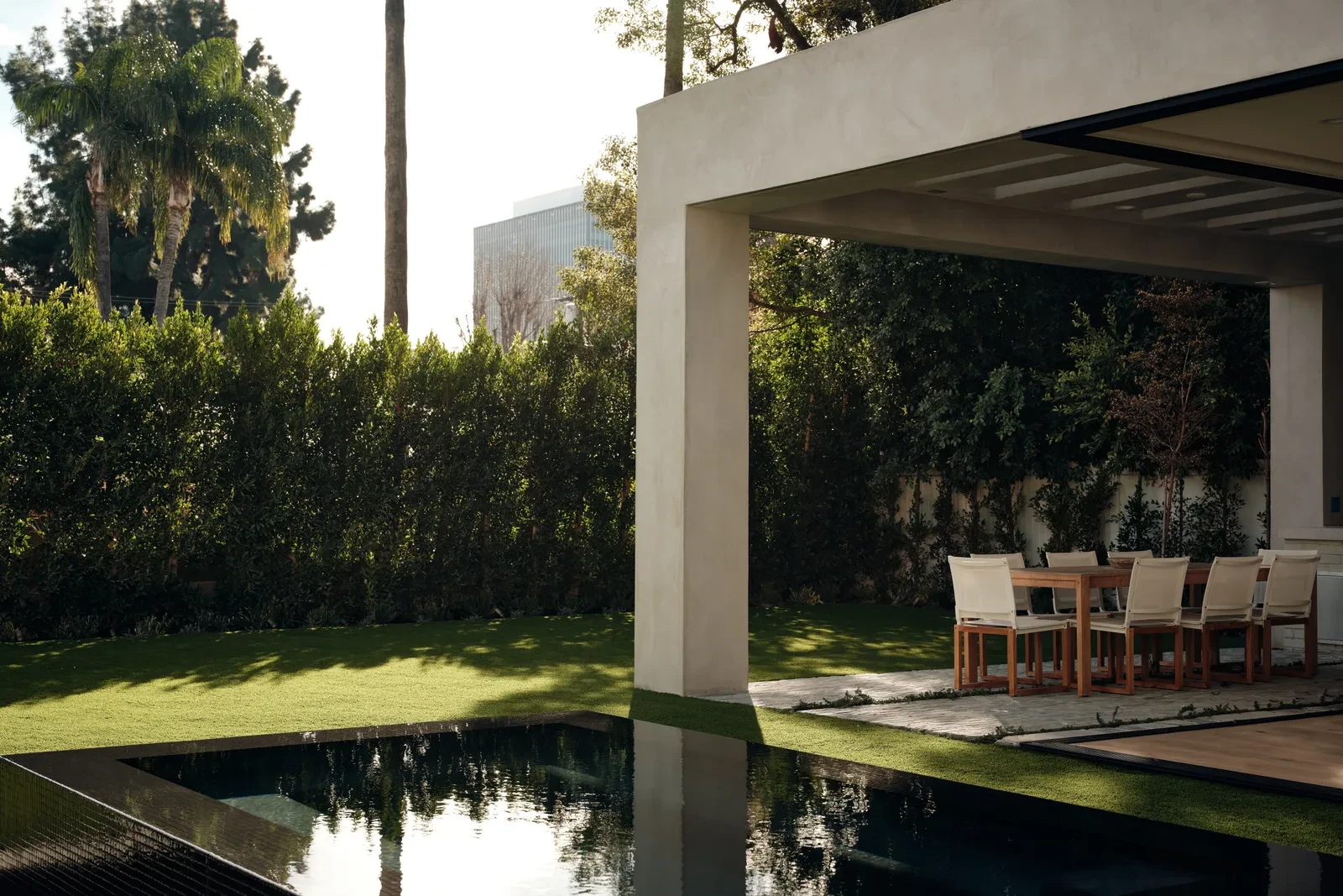 Ο εξωτερικός χώρος αποτελεί αναπόσπαστο κομμάτι της κατοικίας. Η “infinity-edge” πισίνα εκτείνεται προς τον ορίζοντα, δημιουργώντας την ψευδαίσθηση ότι ενώνεται με το τοπίο των βουνών. Γύρω της αναπτύσσονται ζώνες χαλάρωσης με ξαπλώστρες και καθιστικά, ενώ η παρουσία εξωτερικών fire pits δημιουργεί τις ιδανικές συνθήκες για τυχόν βραδινές συγκεντρώσεις. Η αρχιτεκτονική των εξωτερικών χώρων σχεδιάστηκε με σκοπό να λειτουργεί ως φυσική συνέχεια του εσωτερικού τοπίου, ενισχύοντας τη ροή ανάμεσα στα δύο μέρη. Με αυτόν τον τρόπο, το σπίτι μετατρέπεται σε ένα ολοκληρωμένο περιβάλλον διαβίωσης που αξιοποιεί πλήρως το τοπίο του.
