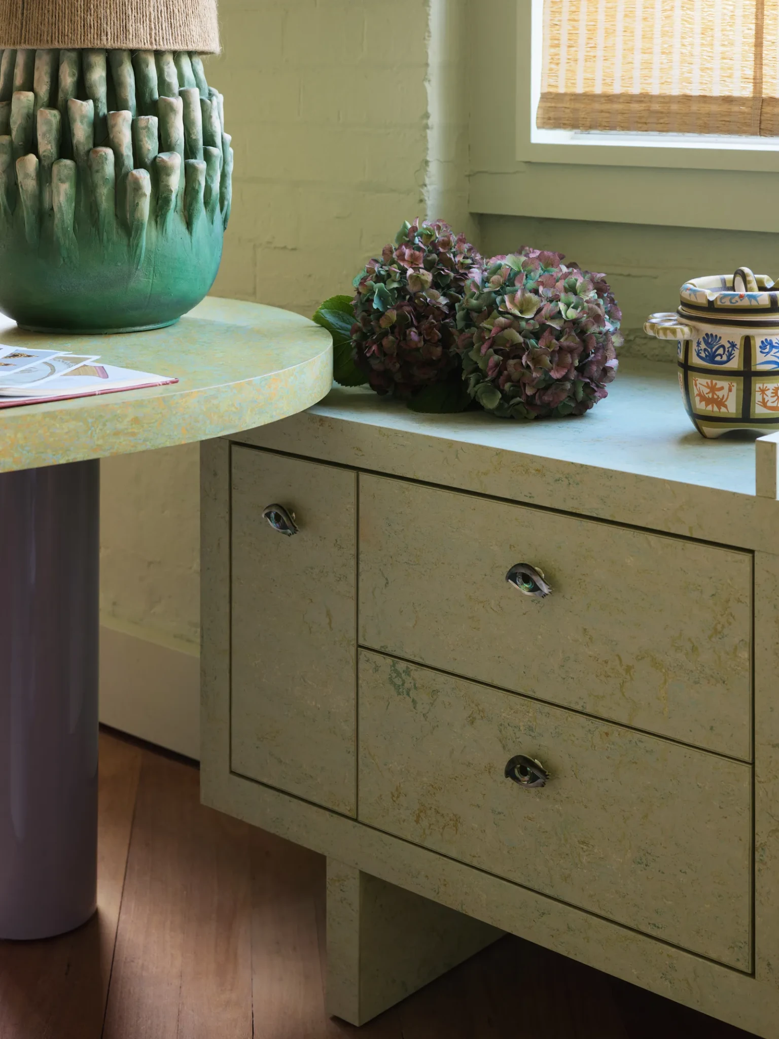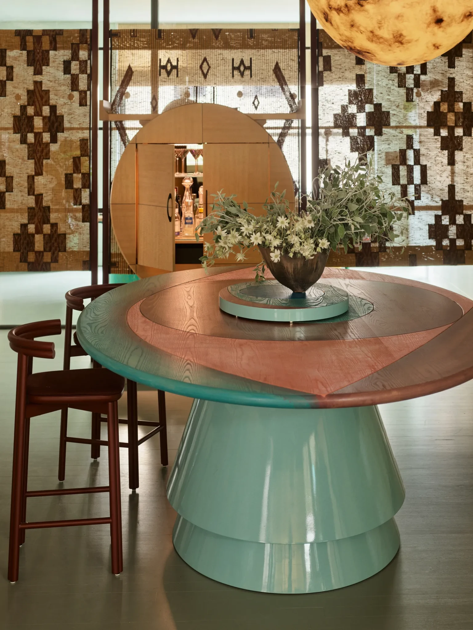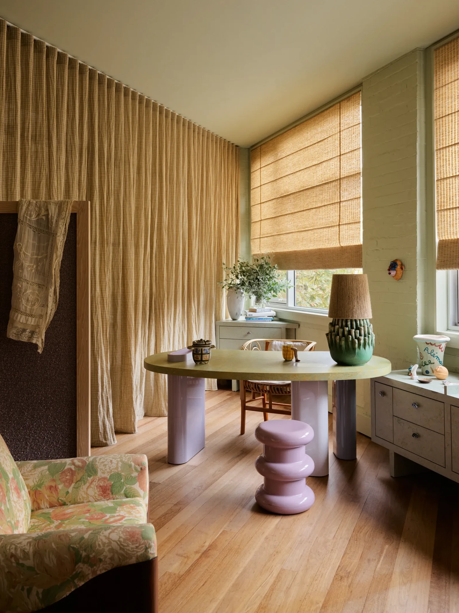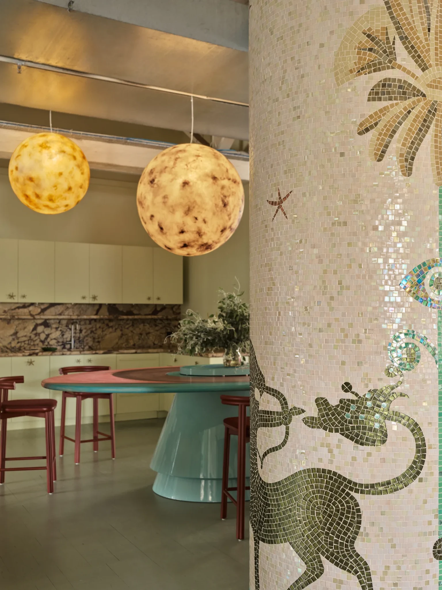 Κάθε στοιχείο του χώρου αποκαλύπτει την επιθυμία για προσωπική έκφραση και εικαστική τόλμη. Στο backsplash της κουζίνας δεσπόζει ένα ζωγραφισμένο «πανόπτικον» μάτι, οι ντουλάπες ντύνονται με παστέλ αποχρώσεις φιστικί και λιλά, ενώ χειροποίητες μπρούντζινες λαβές σε σχήμα αστεριού ολοκληρώνουν την εικόνα. Ένα ειδικά σχεδιασμένο τραπέζι φαγητού, ζωγραφισμένο στο χέρι με απαλά χρώματα, λειτουργεί ως κεντρικό σημείο συνάντησης, ενώ τα lounge-like καθίσματα προσκαλούν σε στιγμές ξεκούρασης, συζητήσεων ή ακόμη και σύντομων «power naps».