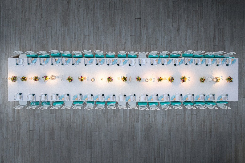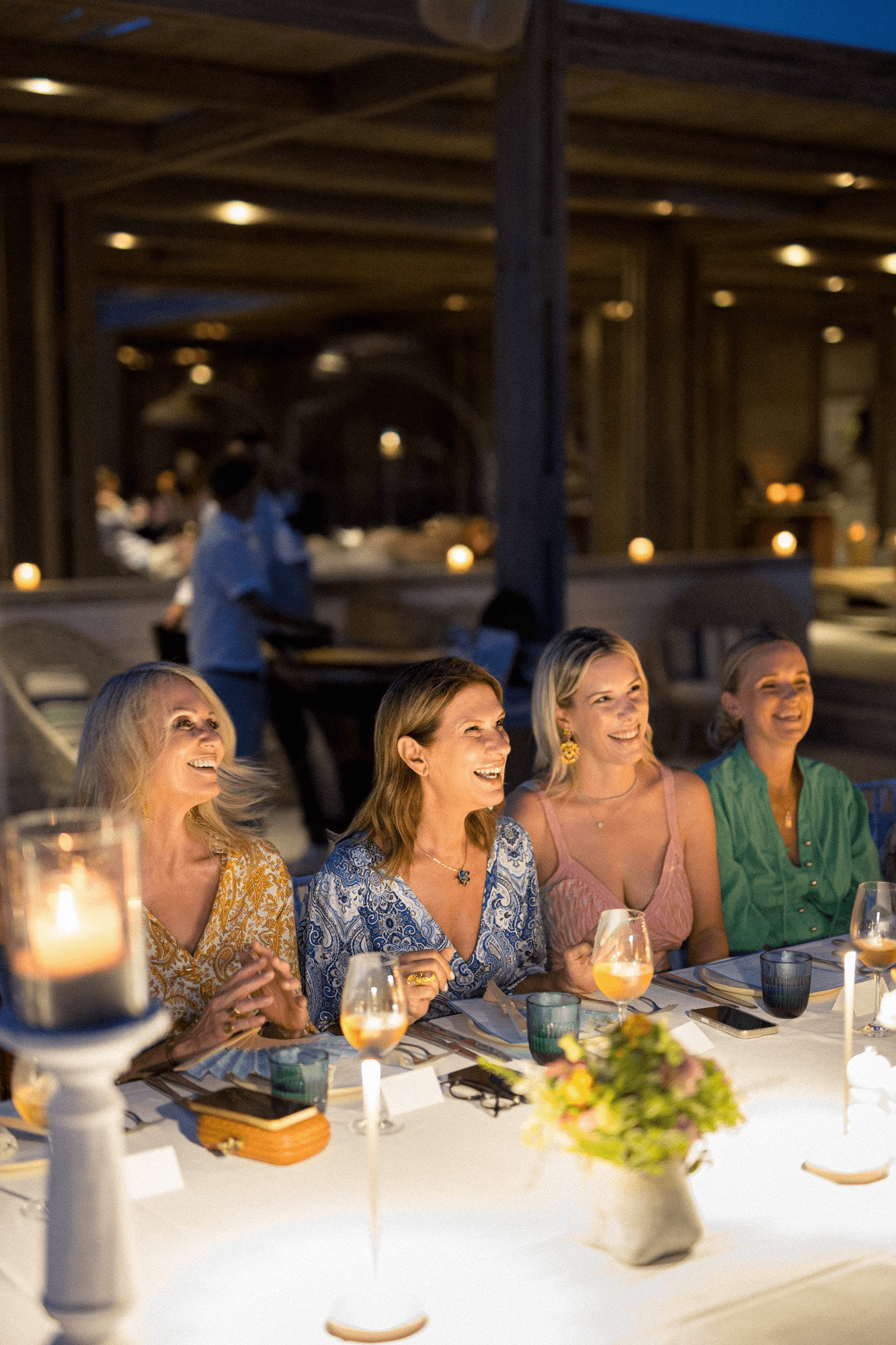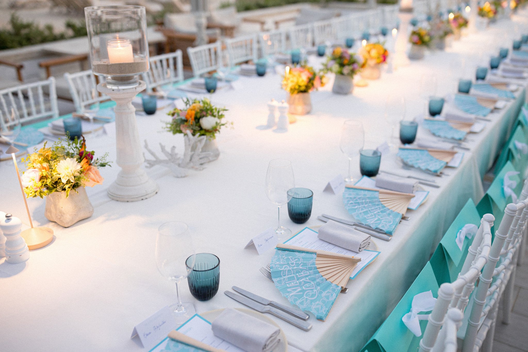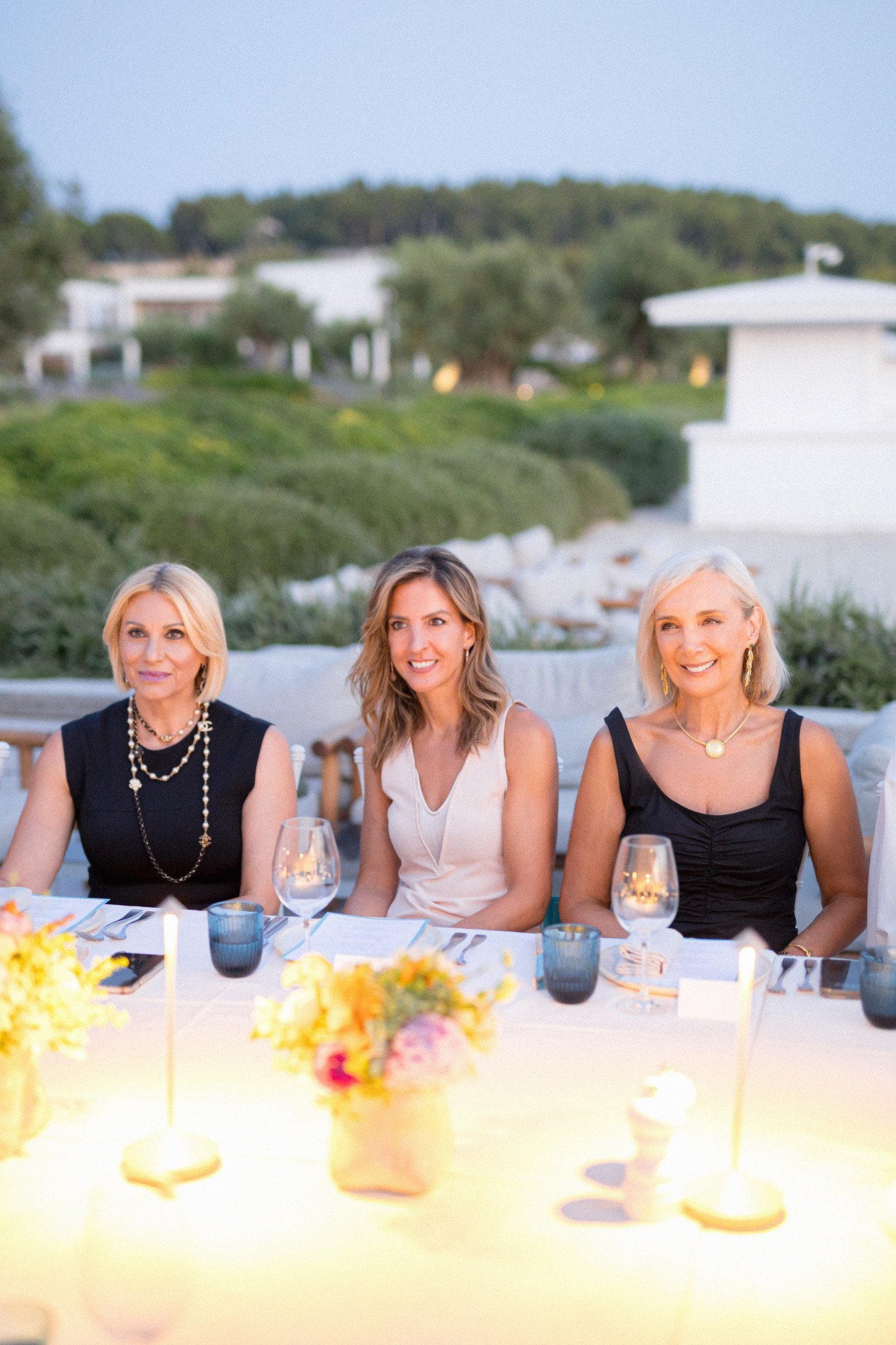 Στη συνέχεια, ακολούθησε ένα private seated dinner στο Beach House του ξενοδοχείου Sani Dunes. Εκεί, οι καλεσμένες γεύτηκαν ένα εκλεπτυσμένο surf and turf μενού γεμάτο αρώματα θάλασσας και γης, σε ένα ειδικά διαμορφωμένο τραπέζι δίπλα στο κύμα, υπό τους ήχους live μπάντας. Το art de la table εναρμονίστηκε με τη νέα συλλογή, με χρωματική παλέτα σε aqua αποχρώσεις. Παστέλ λουλούδια του αγρού, υπερμεγέθη λευκά κηροπήγια και κοράλλια συμπλήρωναν ιδανικά το set up, ενώ aqua βεντάλιες, εμπνευσμένες από τα prints της συλλογής 2025, τοποθετήθηκαν κομψά πάνω στα πιάτα μαζί με τα μενού. Έκπληξη της βραδιάς αποτέλεσαν τα εξατομικευμένα δώρα: συνδυασμοί από κομψά clutches, bag charms και παρεό που περίμεναν τις καλεσμένες στις θέσεις τους.
