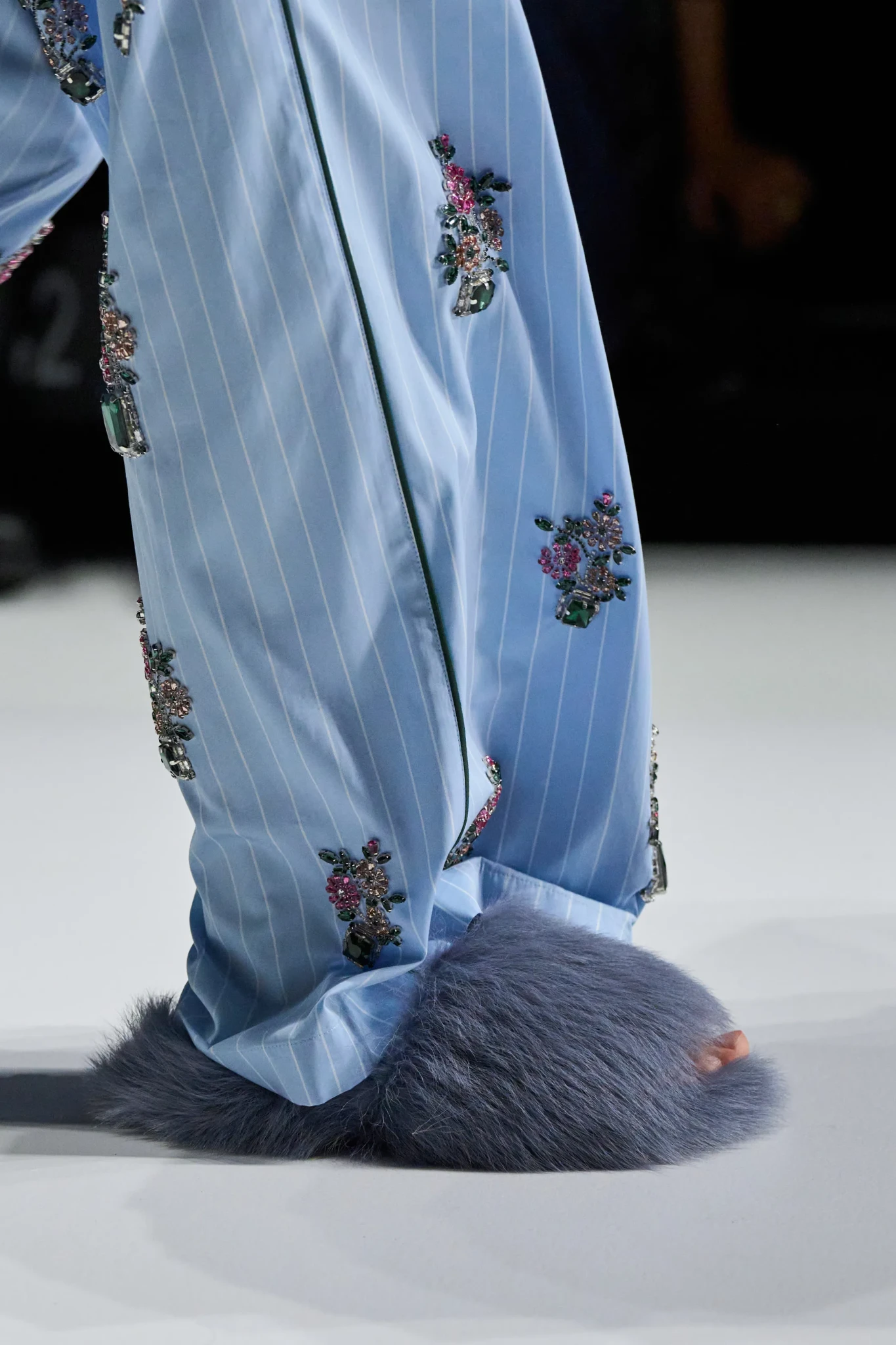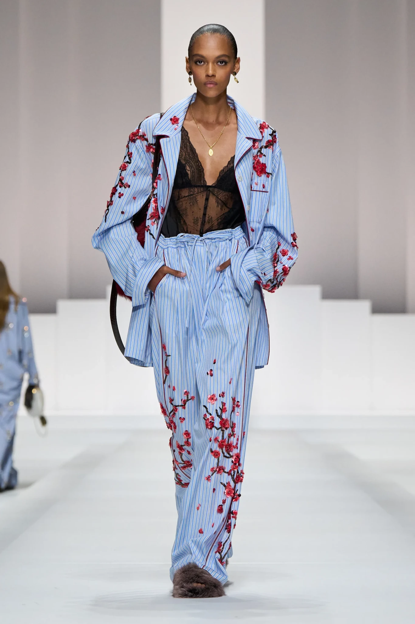 Η συλλογή επικεντρώθηκε σε looks εμπνευσμένα από τα κομμάτια που τις περισσότερες φορές επιλέγουμε για χαλαρές στιγμές στο σπίτι. Πυτζάμες με στρας, δαντελένια lingerie, brocade μπουρνούζια και oversize παλτό συνδυάστηκαν με stilettos, fluffy τσάντες και casual slippers. Η μουσική υπόκρουση με ιταλικά κομμάτια της Patty Pravo χάρισε μια θεατρική πινελιά στο show.