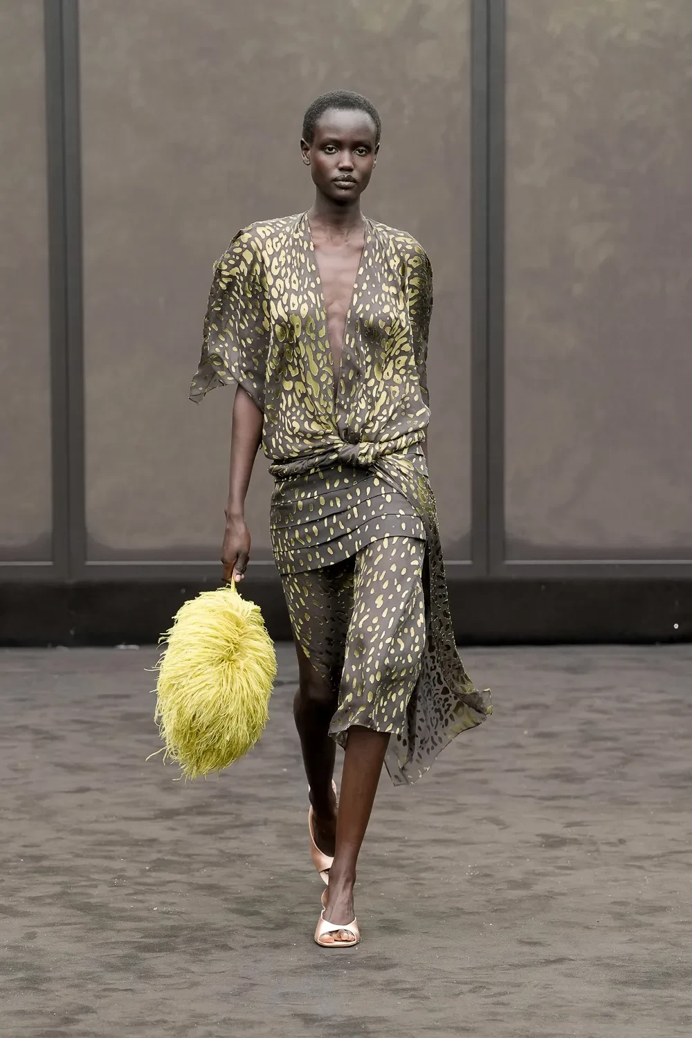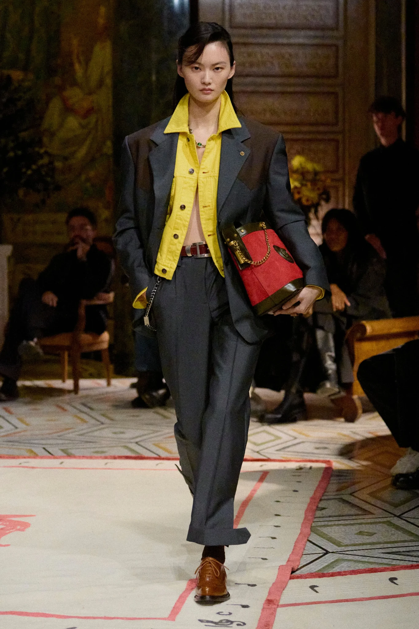 Η συλλογή περιλάμβανε γυναικεία σύνολα με διαφάνειες, λεπτά πλεκτά και σιλουέτες που αγκάλιαζαν το σώμα, καθώς και ανδρικά κοστούμια με μακριές γραμμές και φαρδιές παλάμες, που παρέπεμπαν στη speakeasy αισθητική. Ξεχώρισαν οι έντονες πινελιές σε chartreuse χρώμα -τσάντες, παπούτσια και αξεσουάρ- που έσπαγαν τη μονοχρωμία.