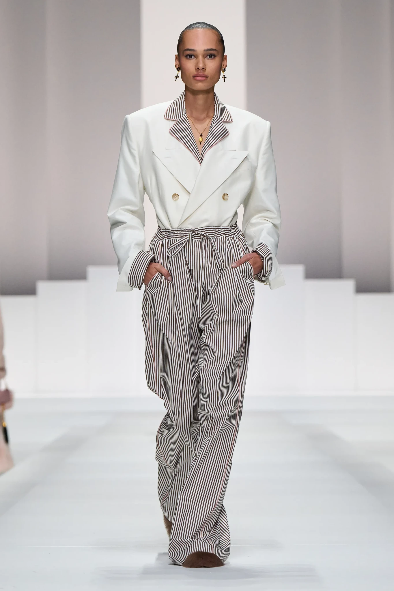 Ο Maximilian Davis για τον Ferragamo συνέχισε την προσωπική του εξερεύνηση της κληρονομιάς του οίκου, αντλώντας έμπνευση από τη δεκαετία του 1920. Η επίδειξη πραγματοποιήθηκε στην αυλή του Portrait Hotel, σε ένα σκηνικό που ανέδειξε την έννοια της κομψότητας σε co-ed φόρμα.