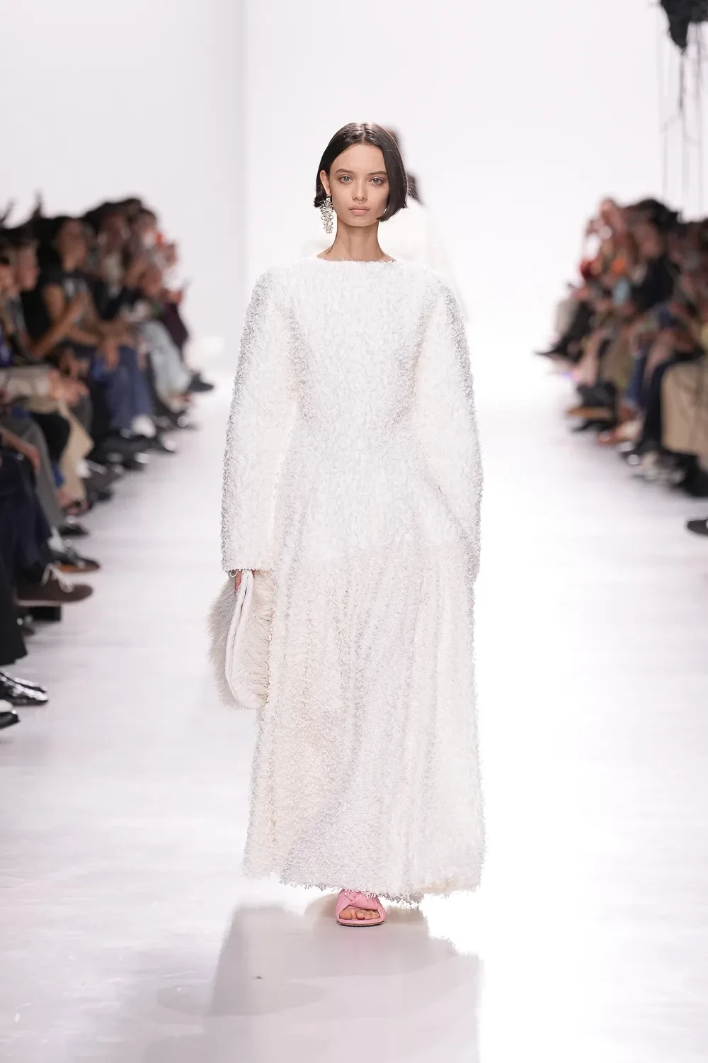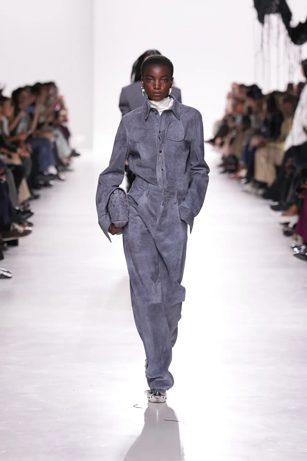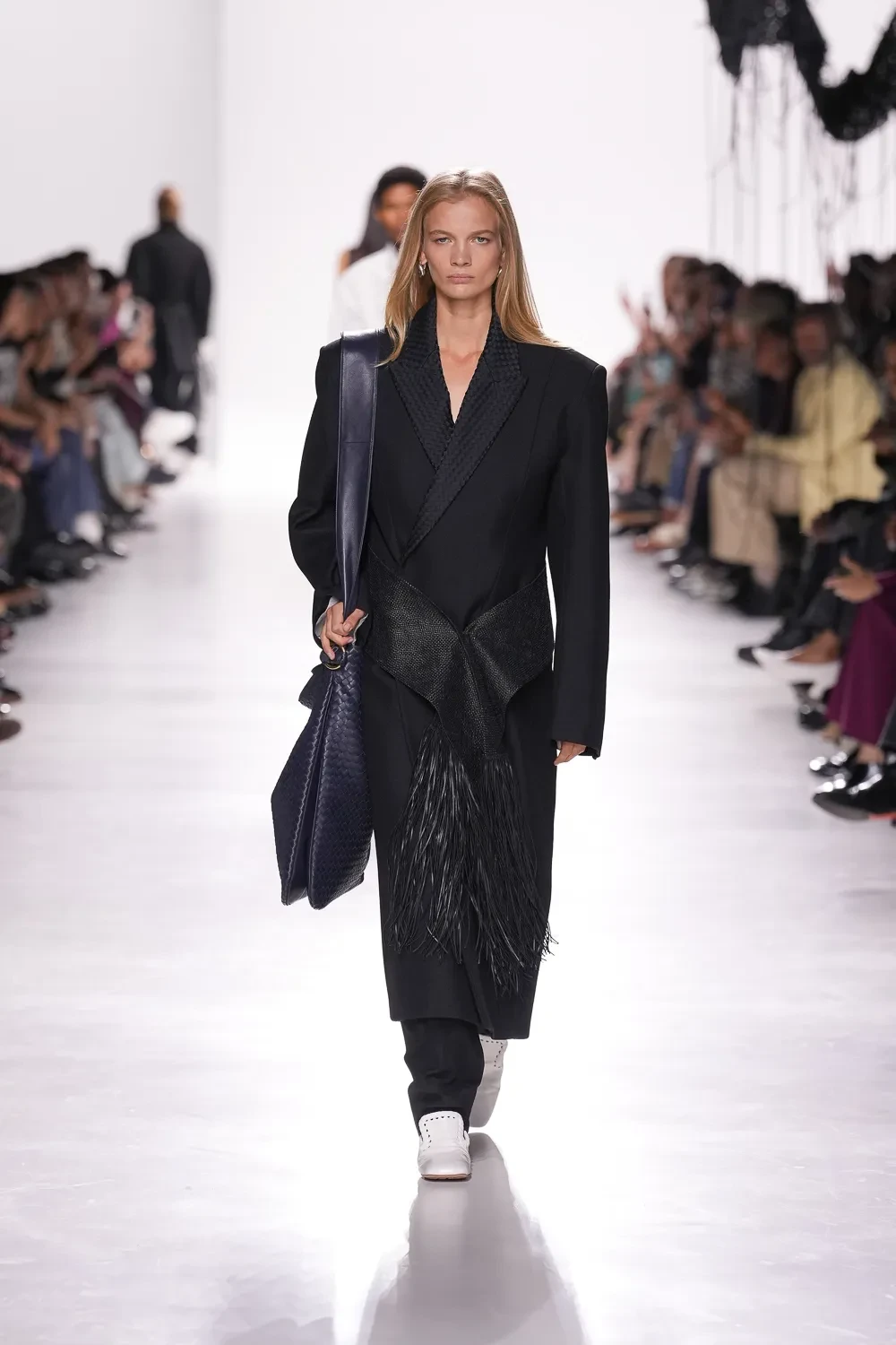 Στη Bottega Veneta, η Louise Trotter παρουσίασε την πρώτη της συλλογή ως δημιουργική διευθύντρια, διαδεχόμενη τον Matthieu Blazy. Το σκηνικό μιας βιομηχανικής αποθήκης στο νότιο Μιλάνο μεταμορφώθηκε σε «εργαστήριο» μόδας, αναδεικνύοντας την αξία της χειροτεχνίας και της υφαντικής παράδοσης.