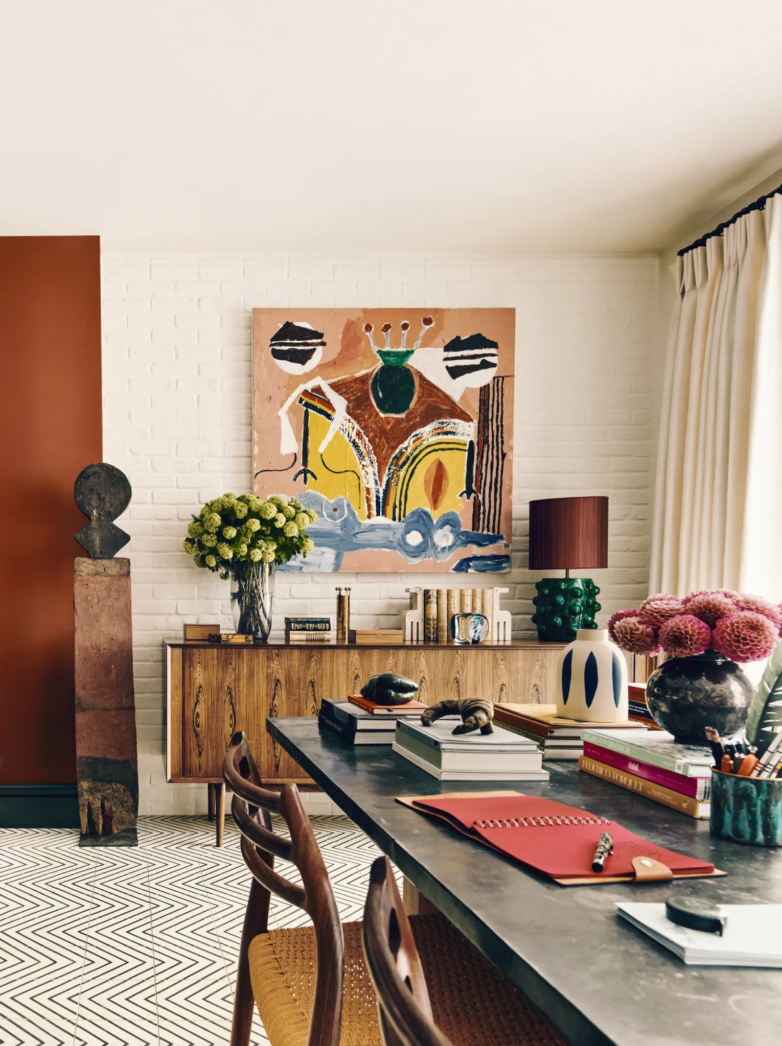 Στο κεντρικό καθιστικό, ο καναπές με ύφασμα Adam Bray λειτουργεί ως επίκεντρο ανάμεσα σε έναν πλούτο ζωγραφικών έργων από καλλιτέχνες όπως ο David Hockney και ο Raoul Dufy. Ο χώρος ισορροπεί ανάμεσα στην κομψότητα και την άνεση, αψηφώντας την τυπική επίσημη αισθητική, και δημιουργεί μια ατμόσφαιρα που είναι ταυτόχρονα πλούσια και οικεία.