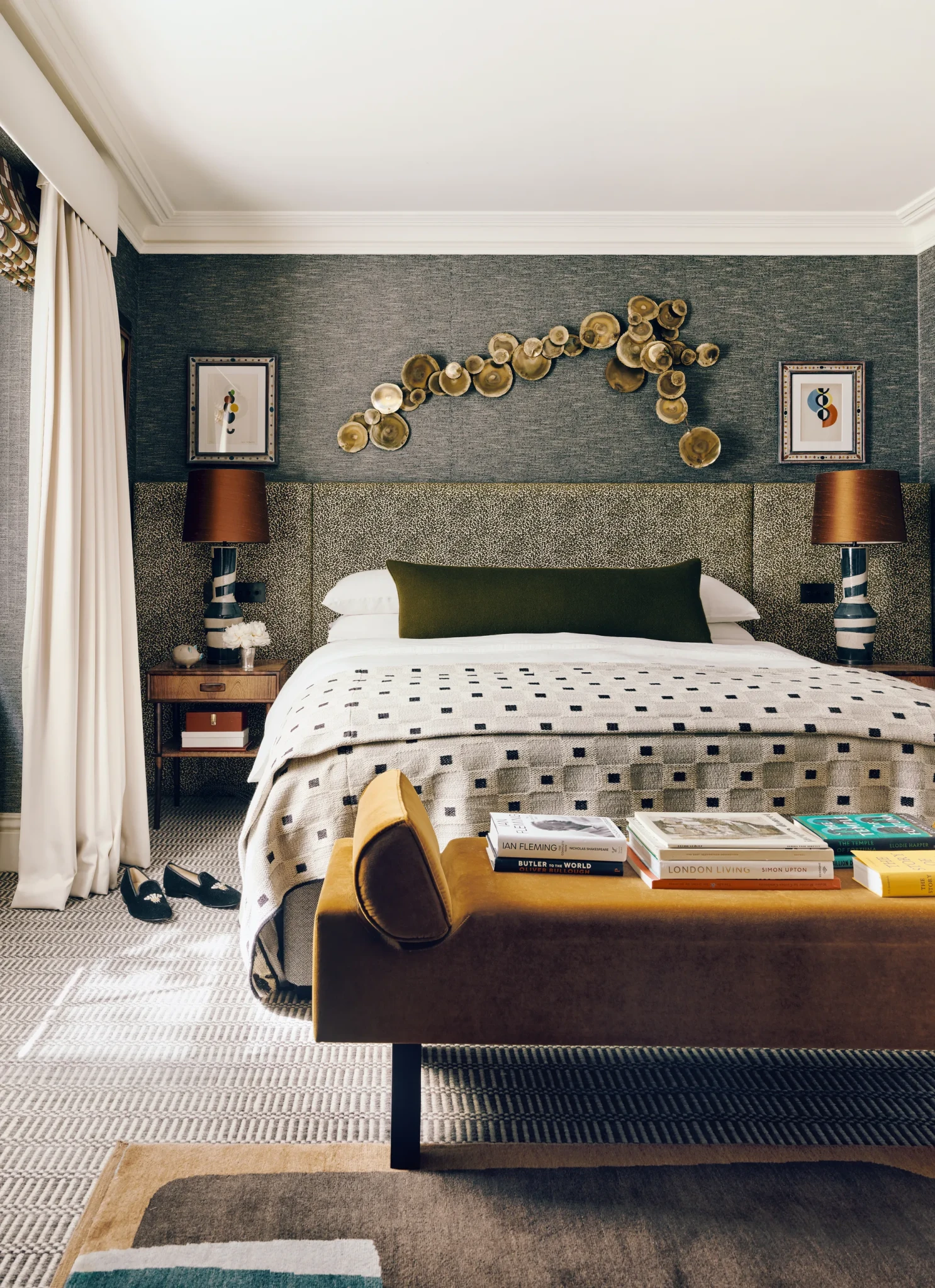 Το υπνοδωμάτιο χαρακτηρίζεται από μια σοφιστικέ, σκούρα ταπετσαρία που δημιουργεί μια ατμόσφαιρα ηρεμίας και βάθους. Απέναντι από το κρεβάτι, ένα γκουάς του Fernand Léger προσφέρει ένα καθημερινό σημείο οπτικής απόλαυσης, υπογραμμίζοντας την ένωση ανάμεσα στον προσωπικό χώρο και την τέχνη.
