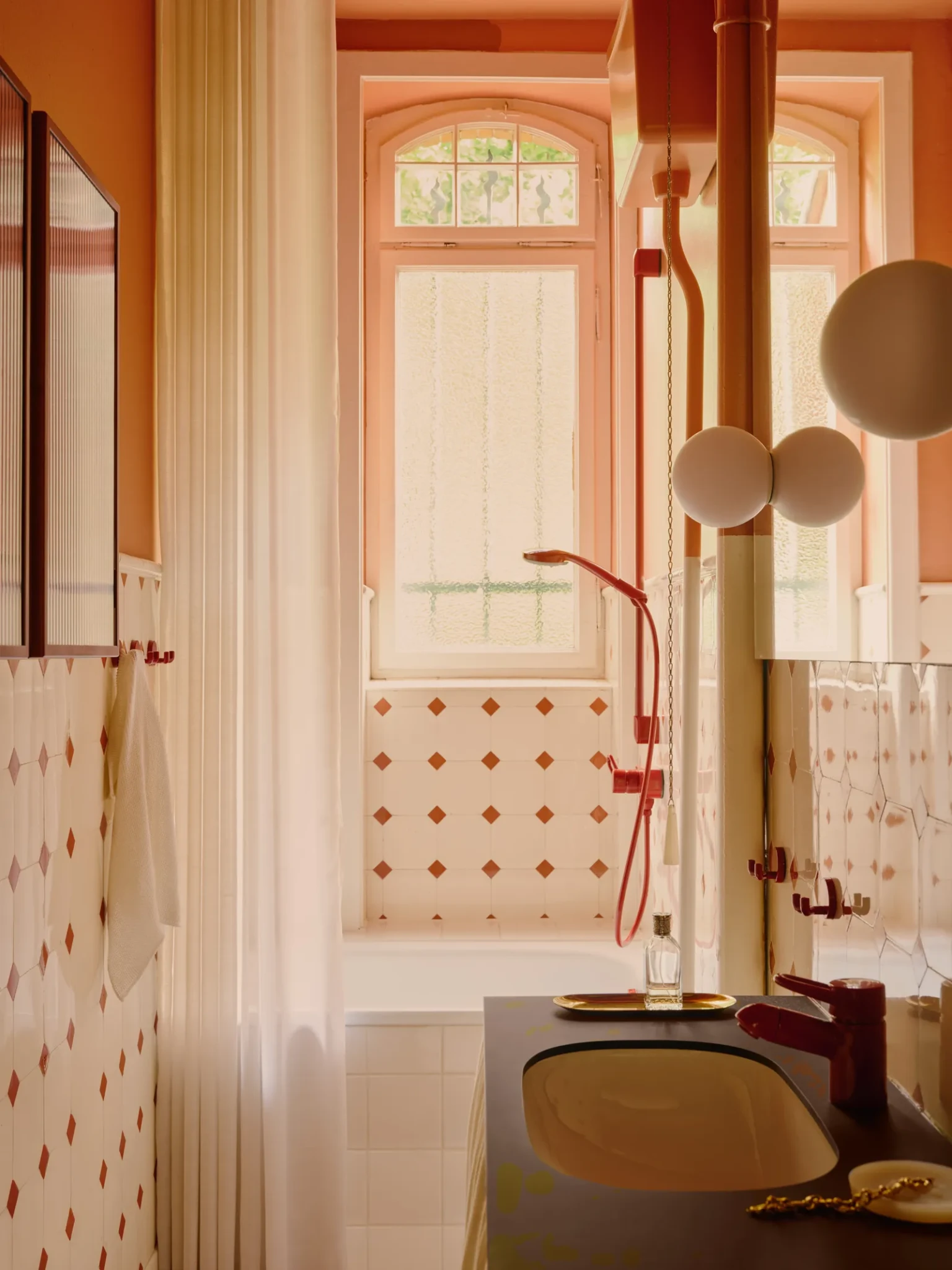 Κάθε δωμάτιο του σπιτιού διαθέτει μια ξεχωριστή ταυτότητα. Η κουζίνα είναι ένας χώρος που αγαπά και ονειρεύεται η ίδια η σχεδιάστρια, με άμεση πρόσβαση στην ευρύχωρη βεράντα. Το μικρό μπάνιο με τα αυθεντικά, κόκκινα και γήινα πλακάκια του 1900 έγινε ένα από τα αγαπημένα δωμάτια του ζευγαριού, καθώς η σχεδιάστρια τα διατήρησε στο χώρο και τα ενσωμάτωσε στις νέες επιφάνειες, ζωγραφίζοντας τους τοίχους και το ταβάνι με θερμούς τόνους που αναδεικνύουν τη μοναδικότητά τους.