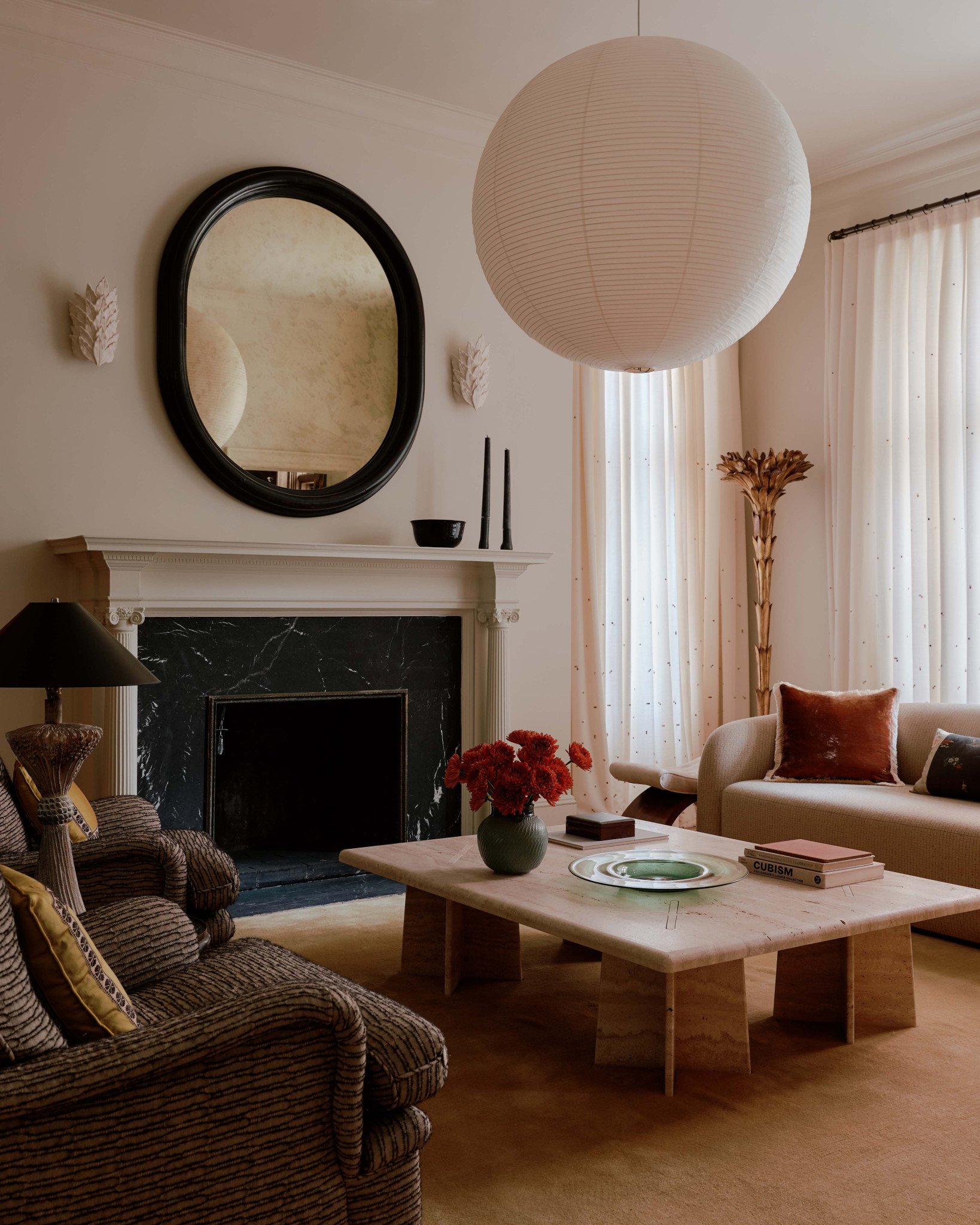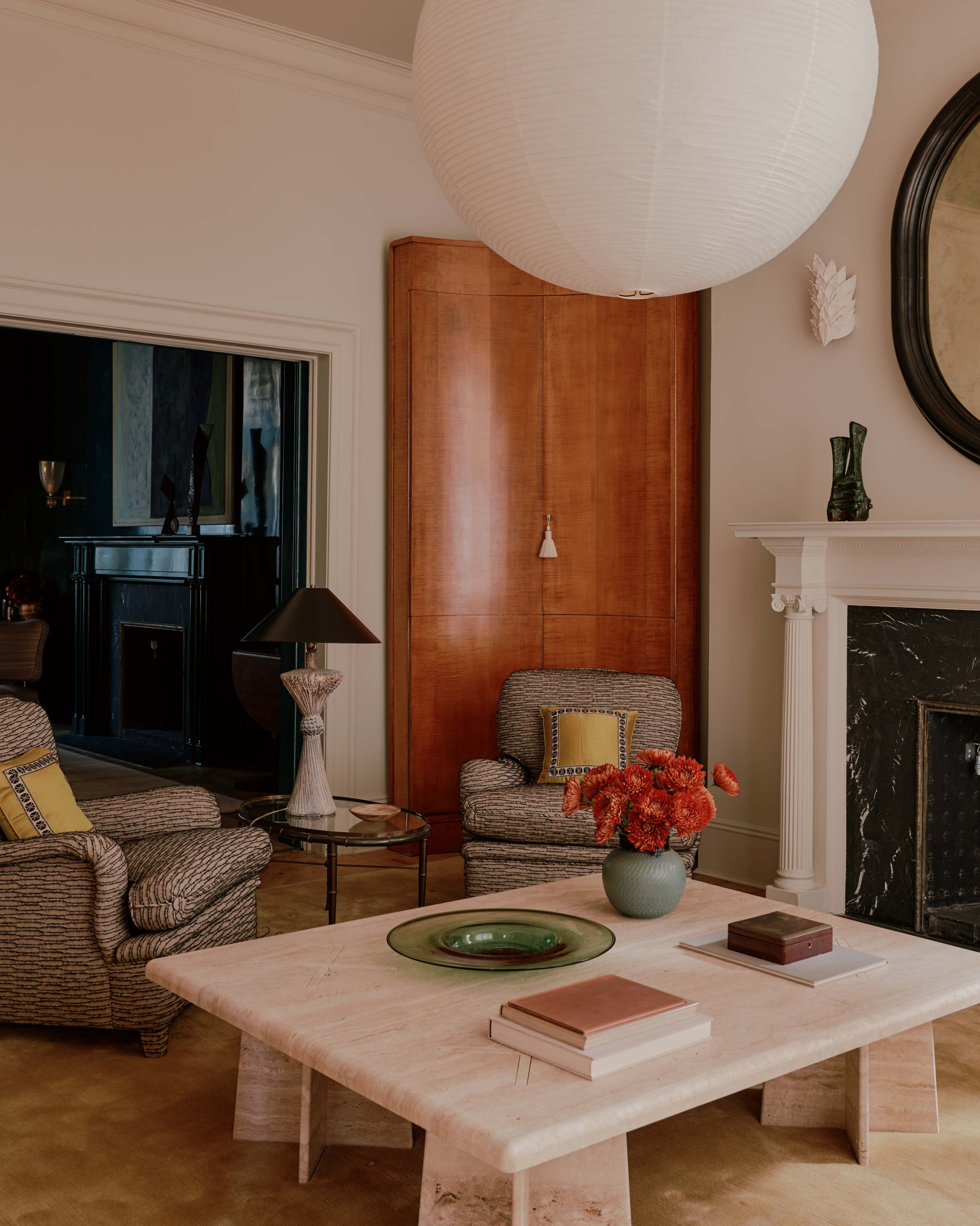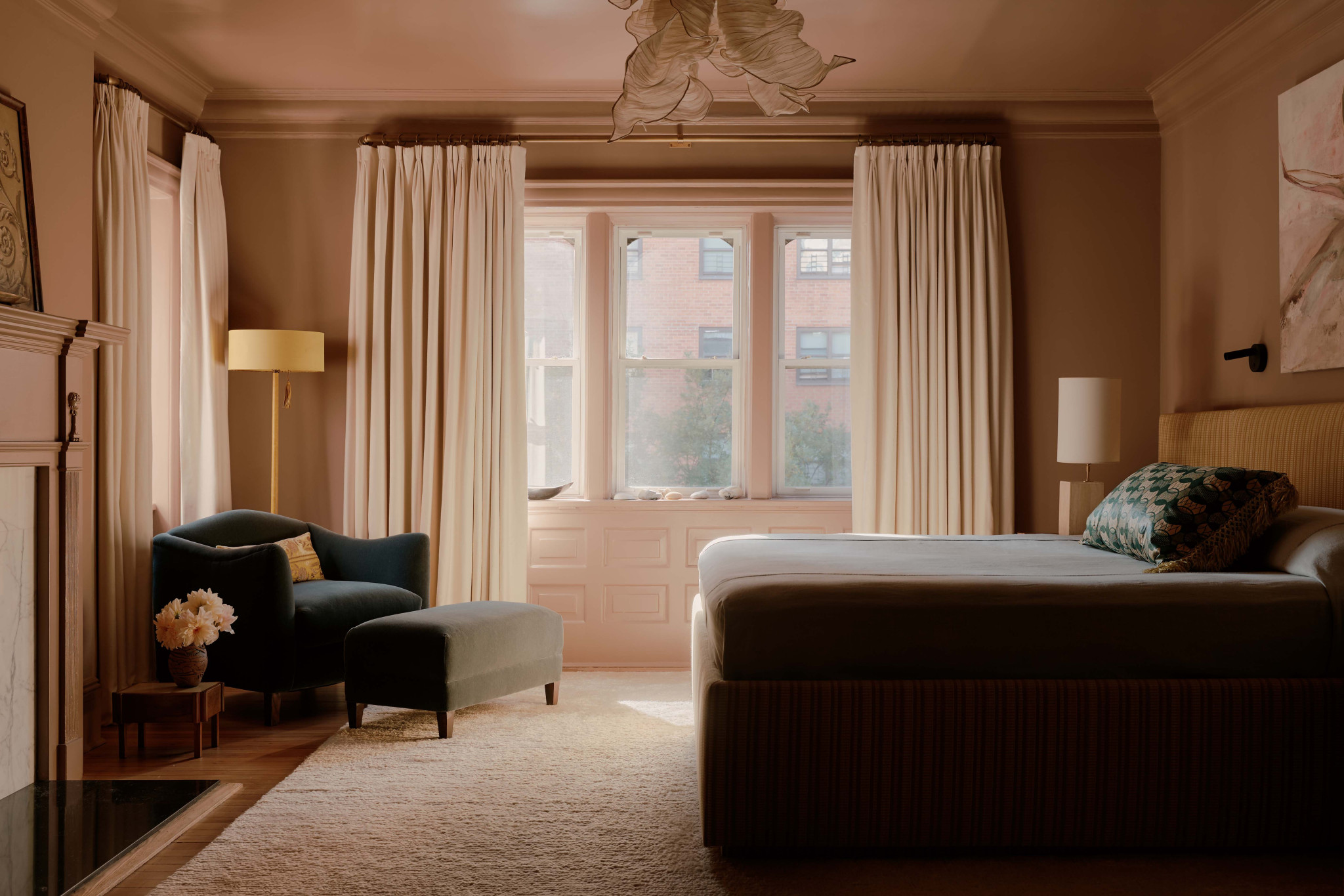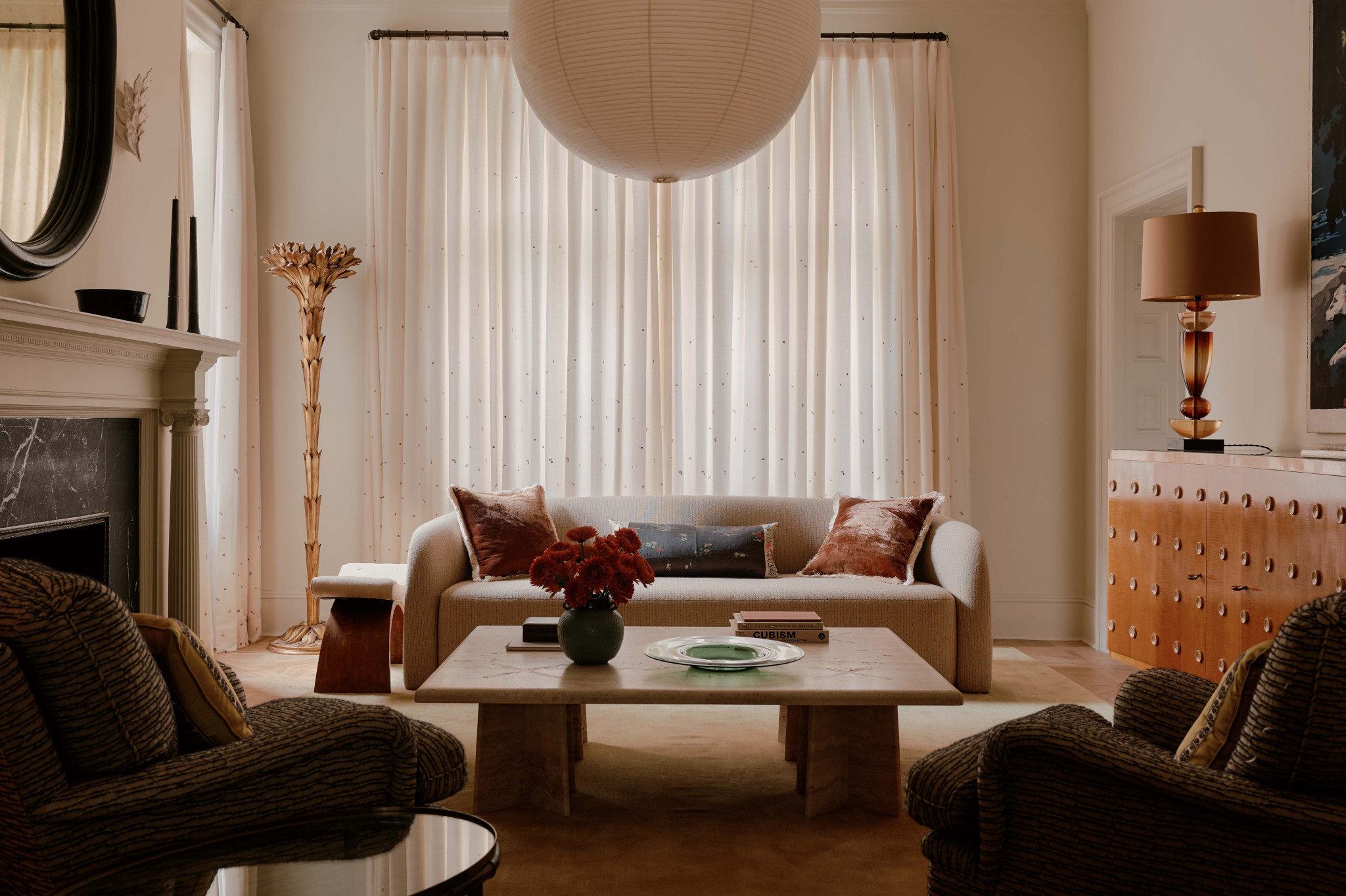 Το φωτιστικό πάνω από το τραπέζι ταιριάζει απόλυτα στα ψηλά ταβάνια του δωματίου. «Ήθελα να είναι εξαιρετικά πολυτελές, οπότε έψαξα για μερικά από αυτά τα κομμάτια από άγνωστα μέρη» λέει η designer που εντόπισε και αγόρασε τον πολυέλαιο «Dahlia» του Max Ingrand σε δημοπρασία σε χαμηλότερη τιμή από την κανονική.