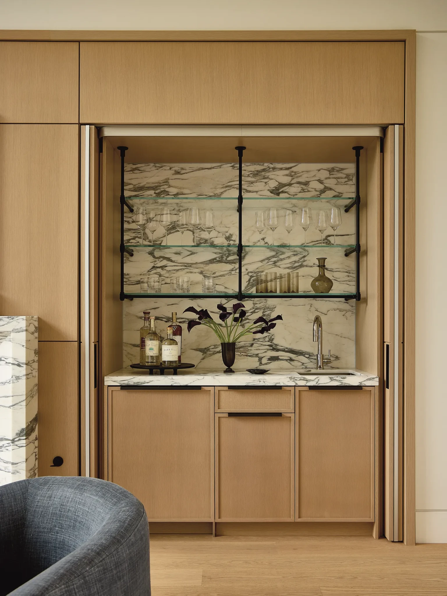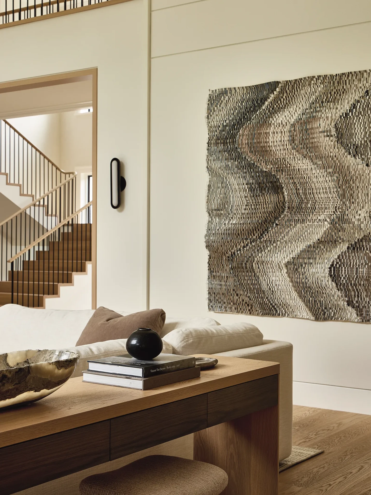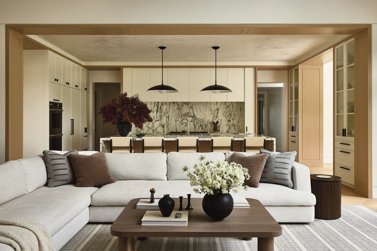 Η εσωτερική αρχιτεκτονική λειτουργεί ως καμβάς για την ανάπτυξη του σχεδιασμού. Φαρδιά ανοίγματα επενδυμένα με λευκή δρυ συνδέουν τους χώρους μεταξύ τους, ενώ η ξύλινη επένδυση προσθέτει ζεστασιά στην κατά βάση ιβουάρ παλέτα. Οι τοίχοι, βαμμένοι με ασβεστοχρώματα σε απαλούς τόνους, αντανακλούν το φως και προσδίδουν μια ήρεμη λάμψη, ενώ οι επιφάνειες με βενετσιάνικο σοβά ενισχύουν την αίσθηση χειροποίητης ποιότητας.