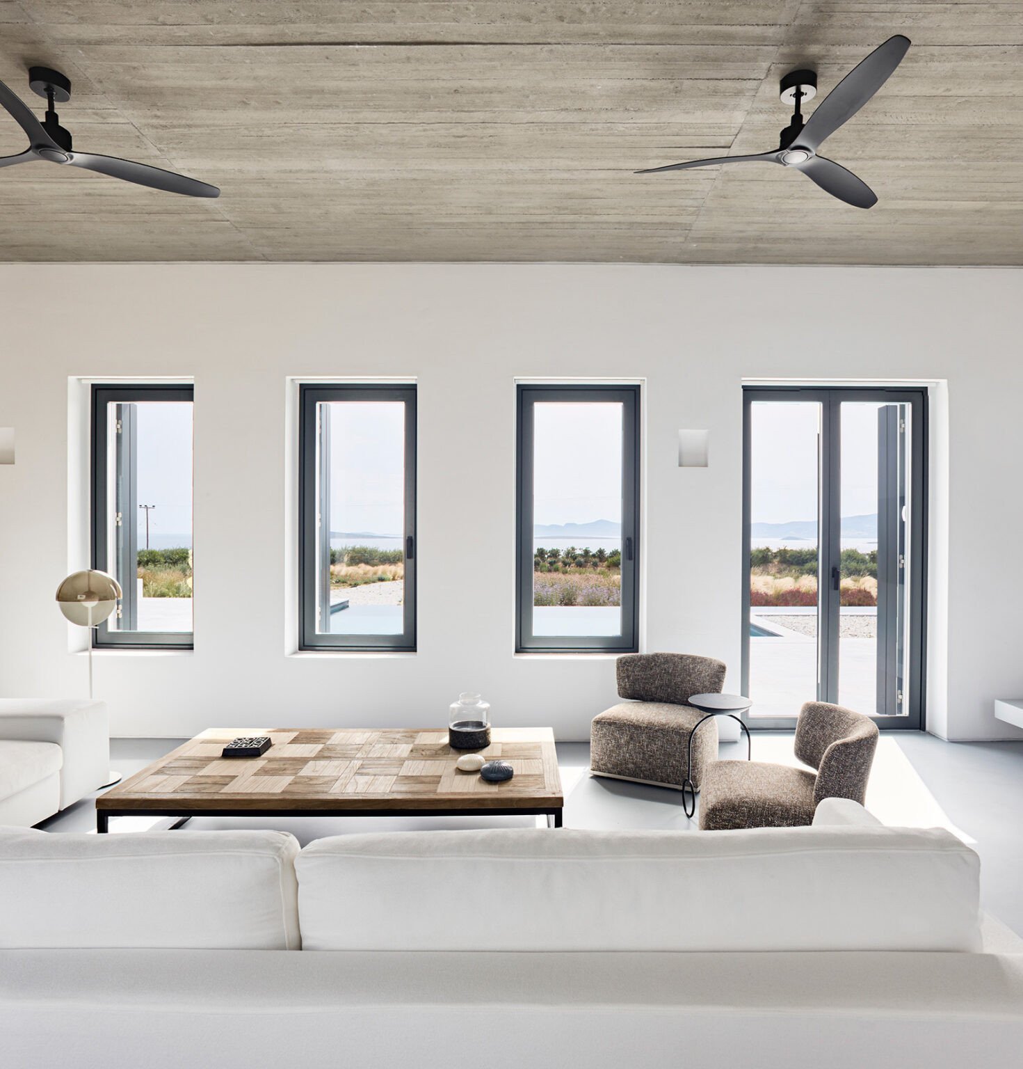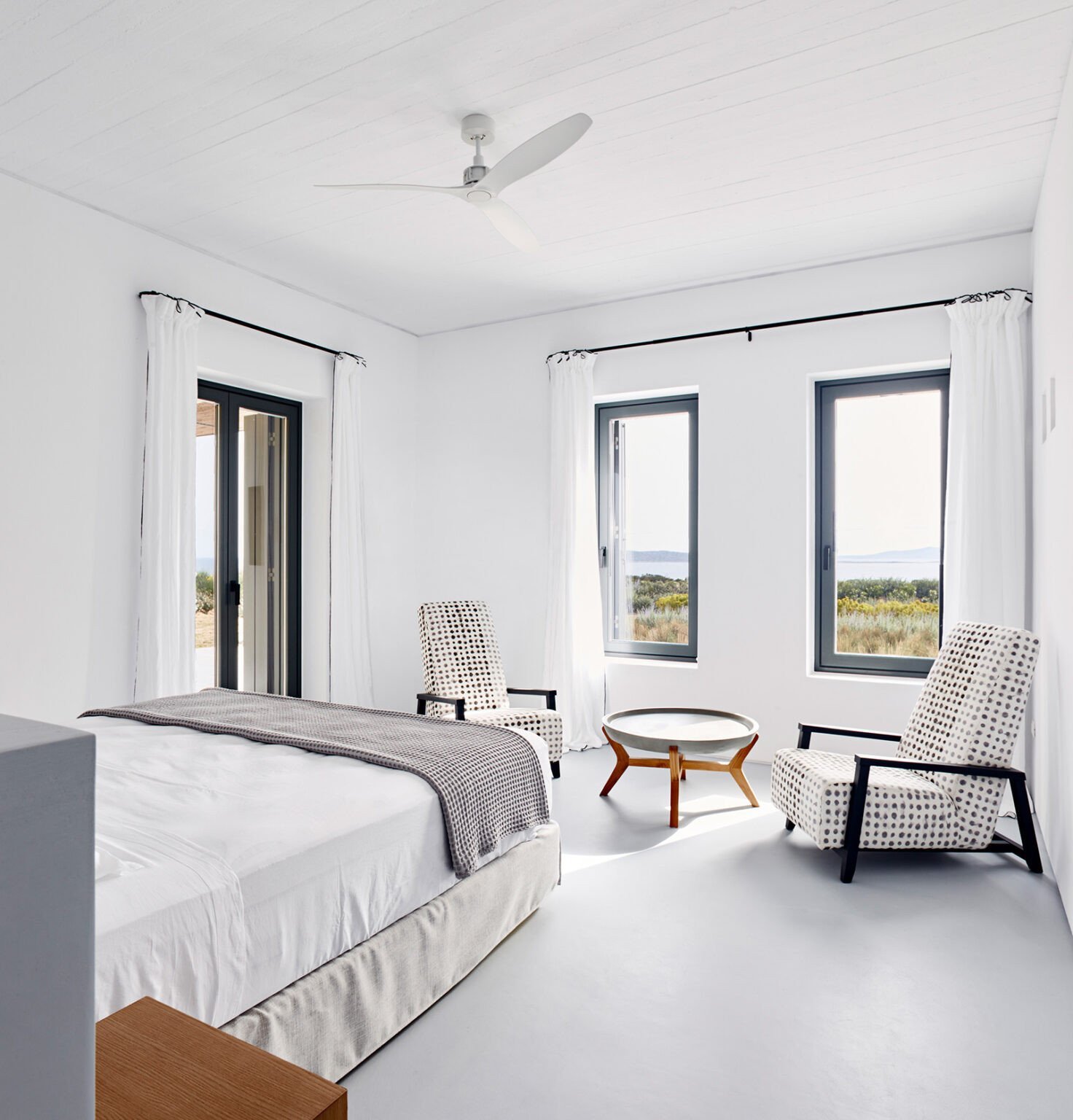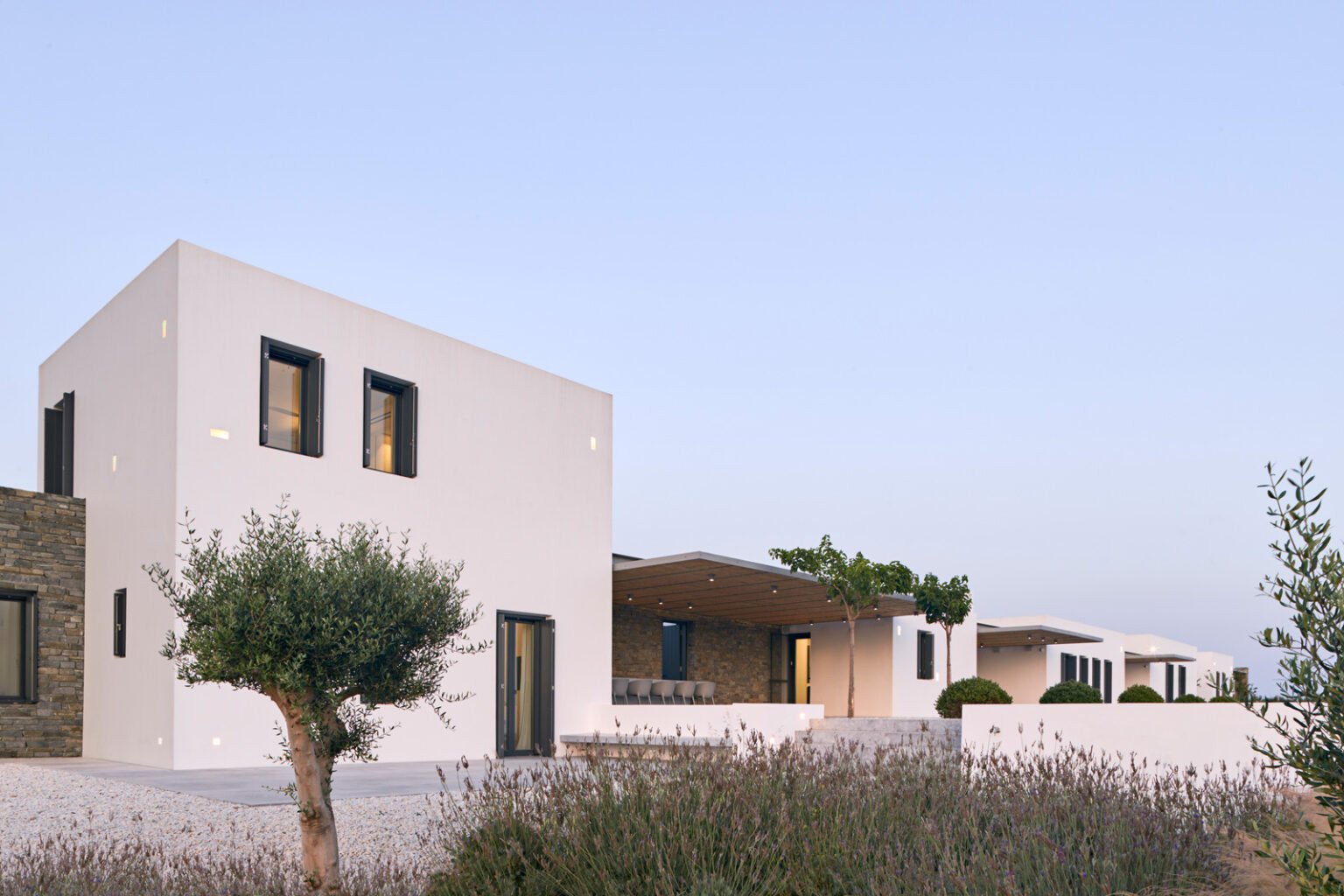 Οι εσωτερικοί χώροι λούζονται στο κυκλαδίτικο φως σε όλη τη διάρκεια της ημέρας, ενώ επιλέχθηκε μια ανάλαφρη, σχεδόν αέρινη χρωματική παλέτα του σιελ σε πολύ επιλεκτικά σημεία, που χαρίζει μια ευχάριστη αίσθηση δροσιάς. Τόσο όσο να υπάρχουν ελάχιστες πινελιές χρώματος που να αναδεικνύουν ακόμη πιο φωτεινό το κυκλαδίτικο λευκό. Η άνεση στους χώρους και η διαρκής θέαση της θάλασσας και του απέραντου αιγαιοπελαγίτικου γαλάζιου συνθέτει μοναδικές καλοκαιρινές εικόνες και μια αδιάκοπη αίσθηση χαλάρωσης και ανάτασης.