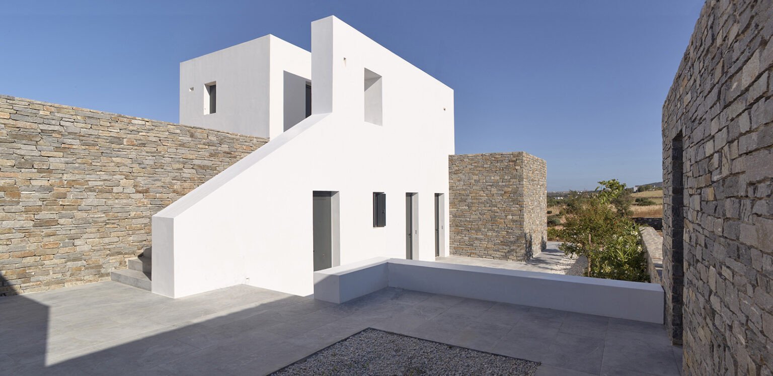 Στο επίπεδο οικόπεδο, με δυτικό προσανατολισμό και εξαιρετική θέα, ζητούμενο ήταν να σχεδιαστεί μια κατοικία για μια τετραμελή οικογένεια, με εξωτερική πρόσβαση, τρία δωμάτια ξενώνων, δωμάτιο υπηρεσίας και ένα μικρό γυμναστήριο. Οι κανονισμοί δόμησης υπαγόρευαν τη διάσπαση του κτιριακού όγκου, καθώς και τη συμμόρφωση με την κυκλαδική αρχιτεκτονική όσον αφορά στα υλικά και στις διαστάσεις των ανοιγμάτων στην πρόσοψη. Το αποτέλεσμα δικαίωσε κάθε αρχική προσδοκία και το τελικό έργο είναι πραγματικά εντυπωσιακό, αλλά και άκρως λειτουργικό.