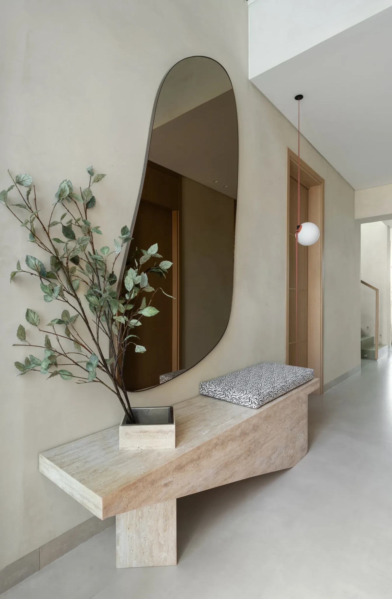 Οι καμπύλες φόρμες, οι πλούσιες υφές και οι διακριτικές χρωματικές πινελιές δημιουργούν ένα περιβάλλον ασφαλές και φιλόξενο για τα παιδιά, ενώ παράλληλα διατηρούν μια αίσθηση ηρεμίας. Πάνω από εξήντα bespoke κατασκευές σχεδιάστηκαν ειδικά για τη βίλα, ανάμεσά τους ένα κυματιστό διαχωριστικό ανάμεσα στο καθιστικό και την τραπεζαρία, που συνδυάζει γλυπτική παρουσία με κρυφούς αποθηκευτικούς χώρους. Το ίδιο πνεύμα συνεχίζεται στην είσοδο, με έναν πάγκο από τραβερτίνη που θέτει τον τόνο από την πρώτη στιγμή, καθώς και στη γεωμετρική σκάλα από δρυ και γυαλί, η οποία λειτουργεί ως σταθερός συνδετικός κρίκος ανάμεσα στους κοινωνικούς χώρους και τα πιο ιδιωτικά υπνοδωμάτια.