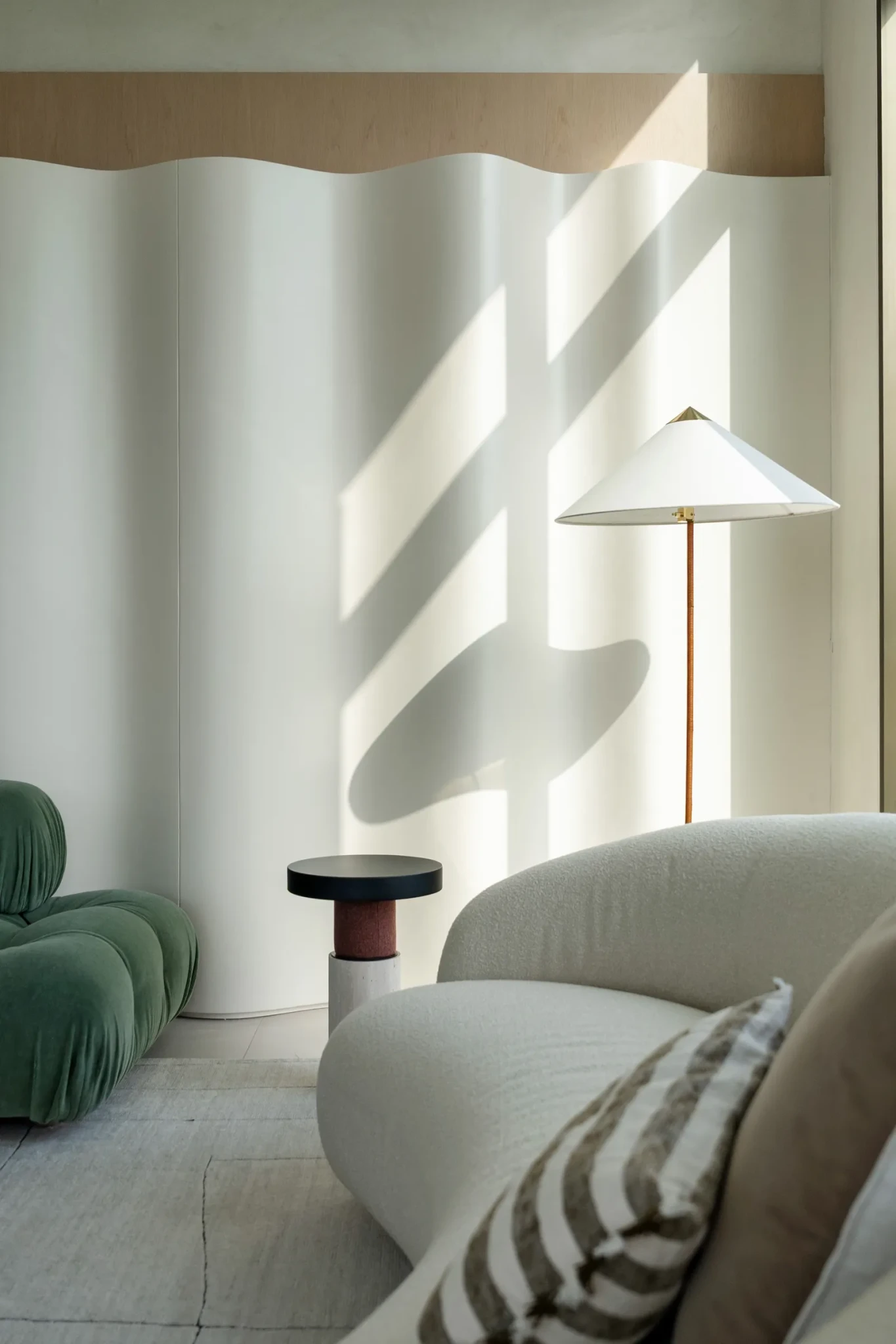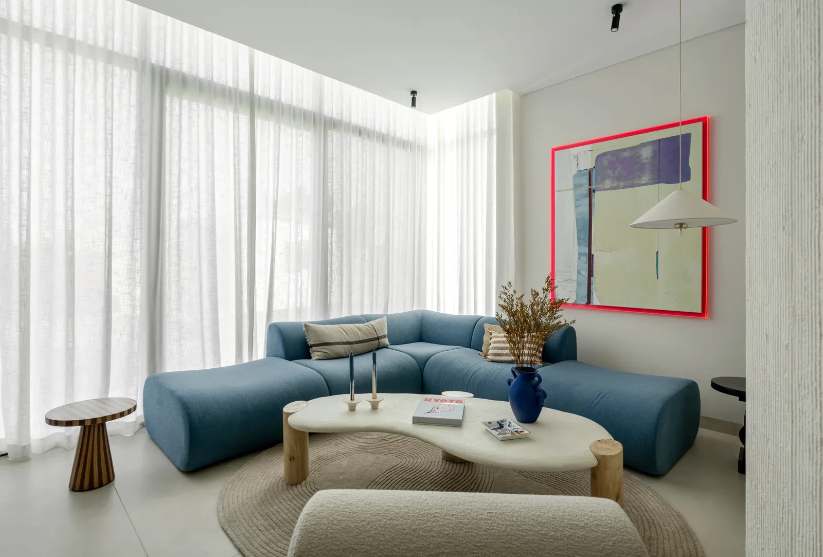 Η παλέτα βασίζεται σε απαλές ουδέτερες αποχρώσεις, ζεστά ξύλα και φυσικές υφές που ανταποκρίνονται ιδανικά στο άπλετο φως. Πάνω σε αυτή τη γαλήνια βάση, ενσωματώνονται χρώματα με τρόπο φυσικό και ανεπιτήδευτο: τρυφερά πράσινα, ήπια τερακότα και γήινοι τόνοι εμφανίζονται σε υφάσματα, έργα τέχνης και διακοσμητικά στοιχεία, προσθέτοντας συναισθηματικό βάθος. Ο φωτισμός αντιμετωπίζεται με την ίδια προσοχή, αποφεύγοντας τις έντονες κεντρικές πηγές και επιλέγοντας γραμμικά φωτιστικά, κρυφούς φωτισμούς και απαλές φωτοσκιάσεις που αναδεικνύουν τις υφές και τα υλικά.