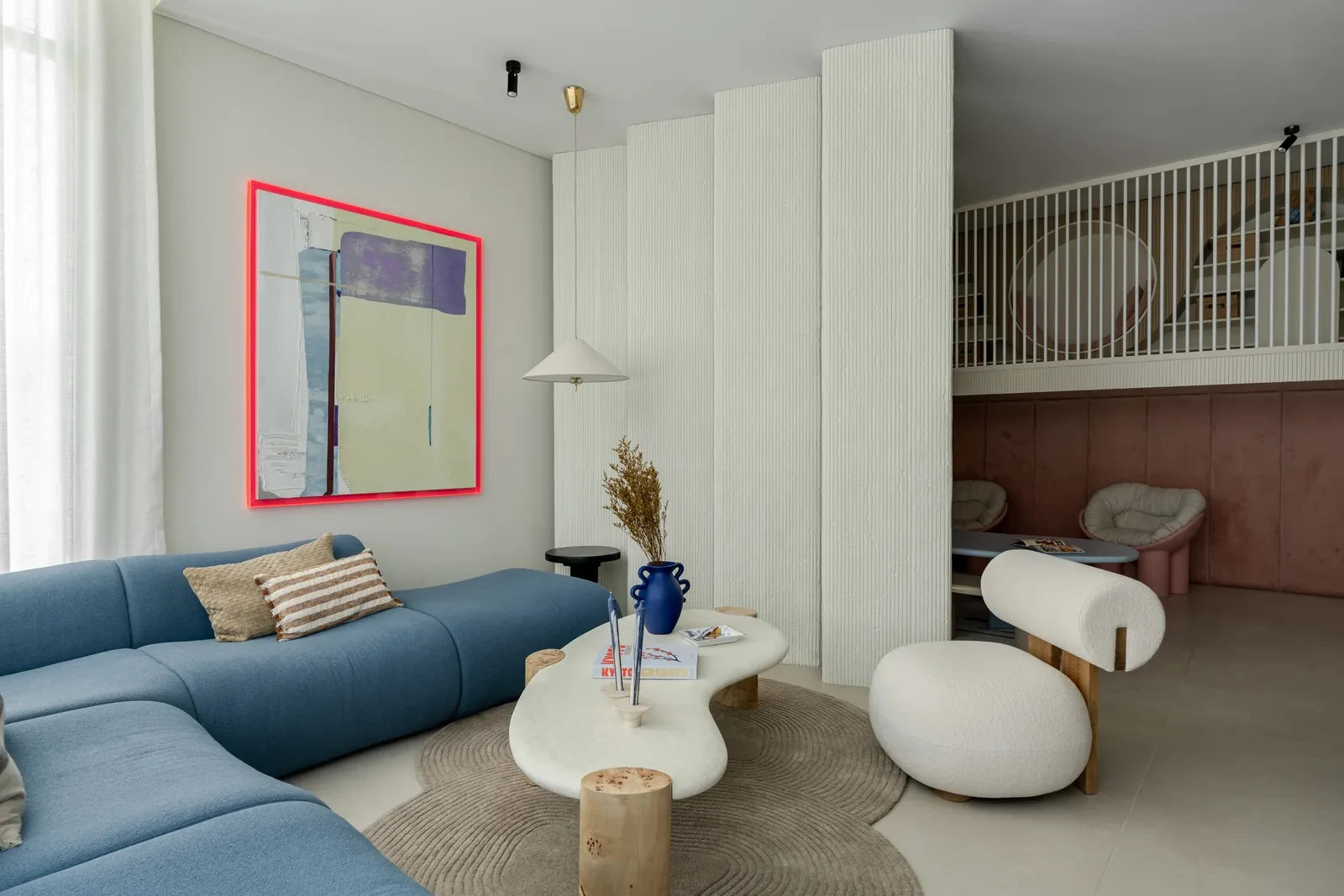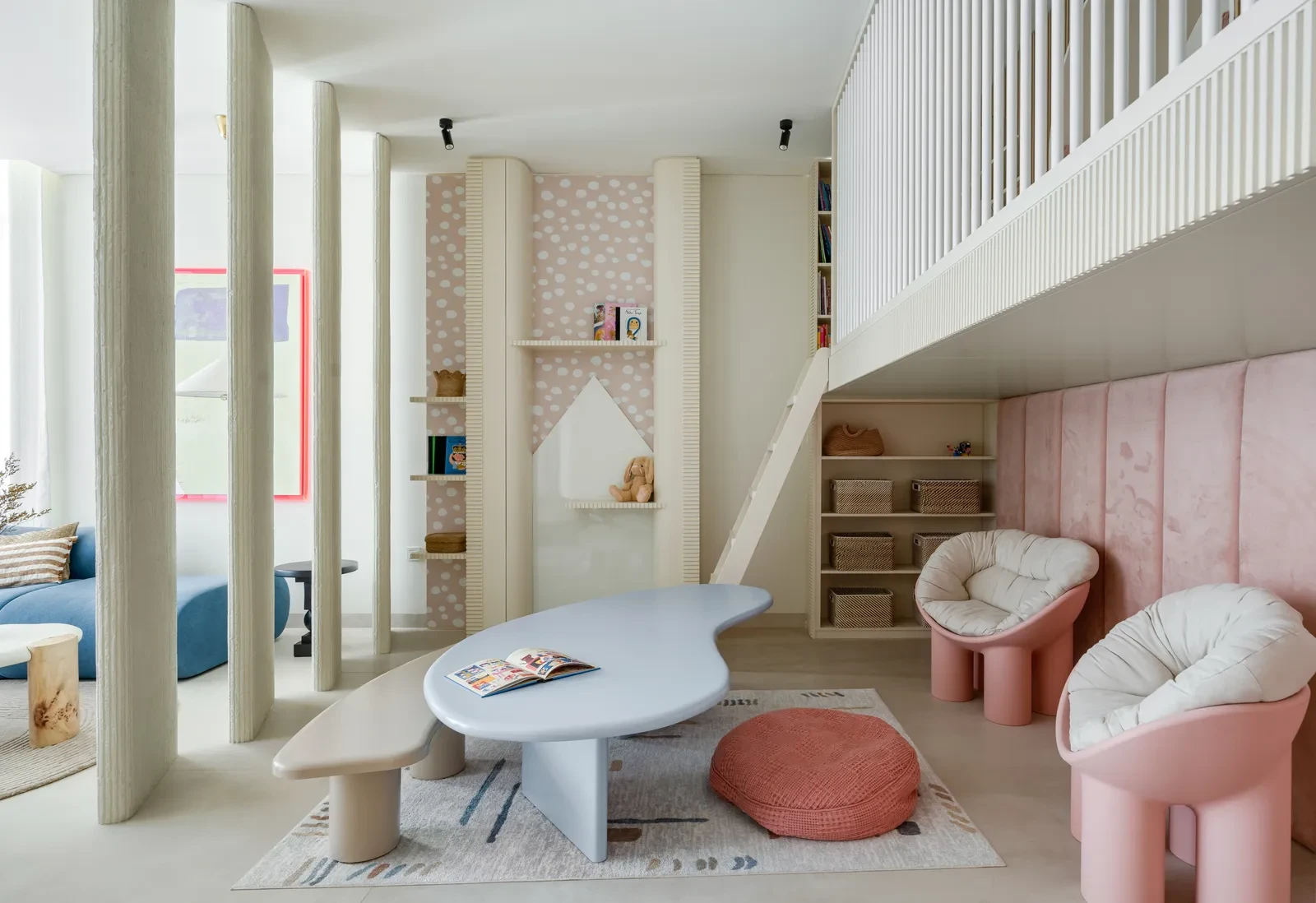 Οι χώροι των παιδιών δεν απομονώνονται, αλλά ενσωματώνονται οργανικά στη ζωή του σπιτιού, δημιουργώντας μια αίσθηση ζωντάνιας και οικειότητας. Μέσα από ειδικά σχεδιασμένα έπιπλα και λεπτομέρειες, εισάγονται στοιχεία παιχνιδιού και φαντασίας, χωρίς να διαταράσσεται η συνολική αισθητική συνοχή. Χαρακτηριστικό παράδειγμα αποτελεί το οικογενειακό καθιστικό, όπου ένας μπλε γωνιακός καναπές συνυπάρχει αρμονικά με έναν ροζ, βελούδινο χώρο παιχνιδιού, διαχωρισμένο με ξύλινο διάτρητο διαχωριστικό.