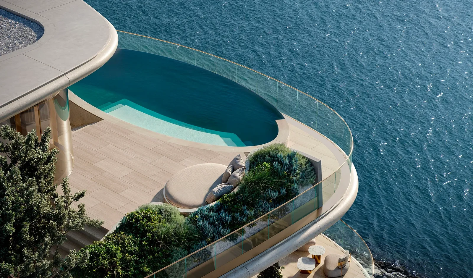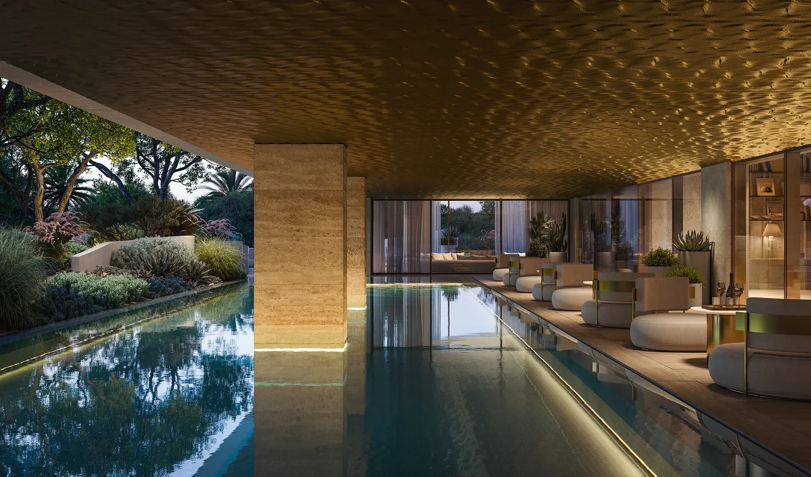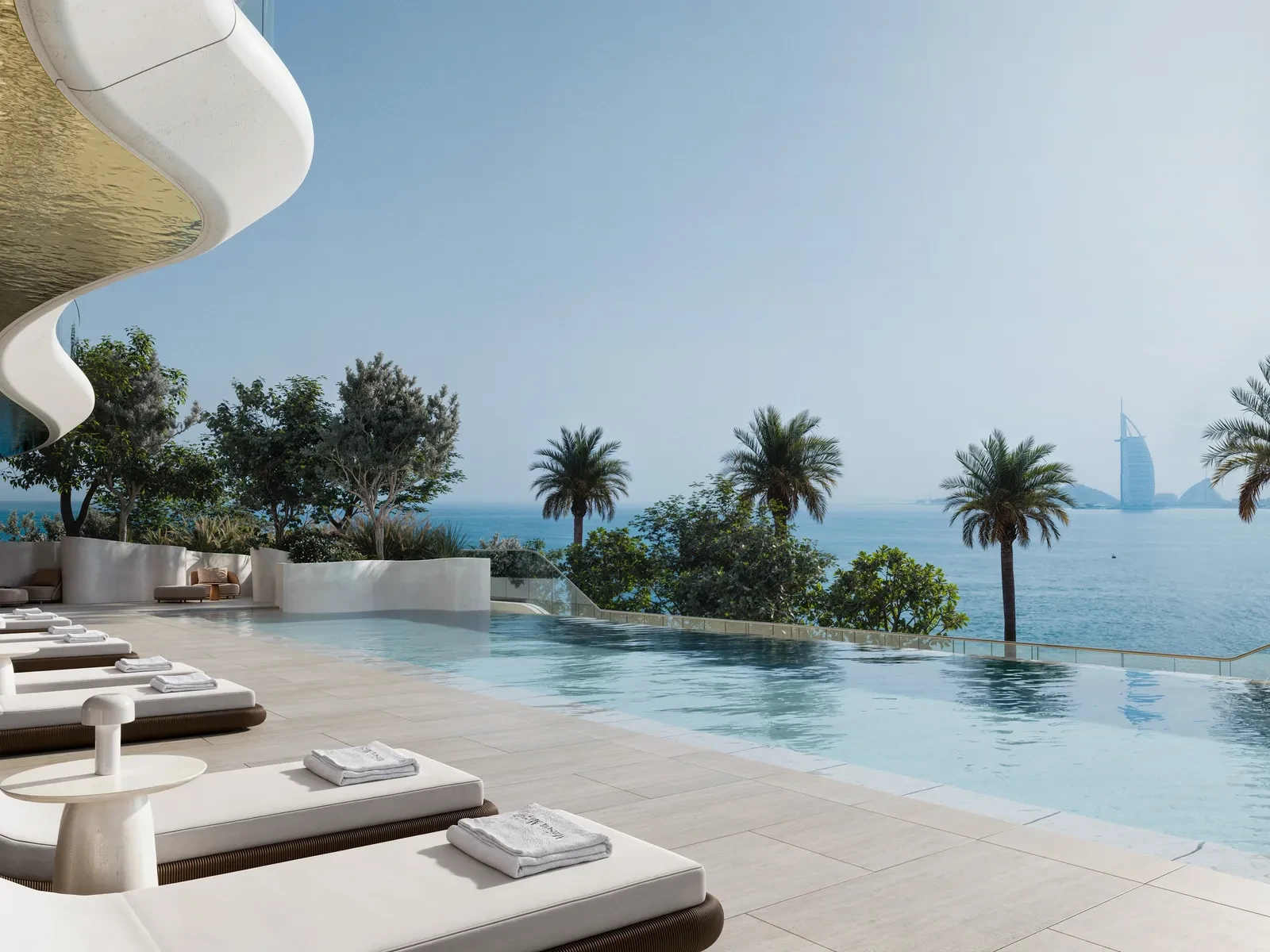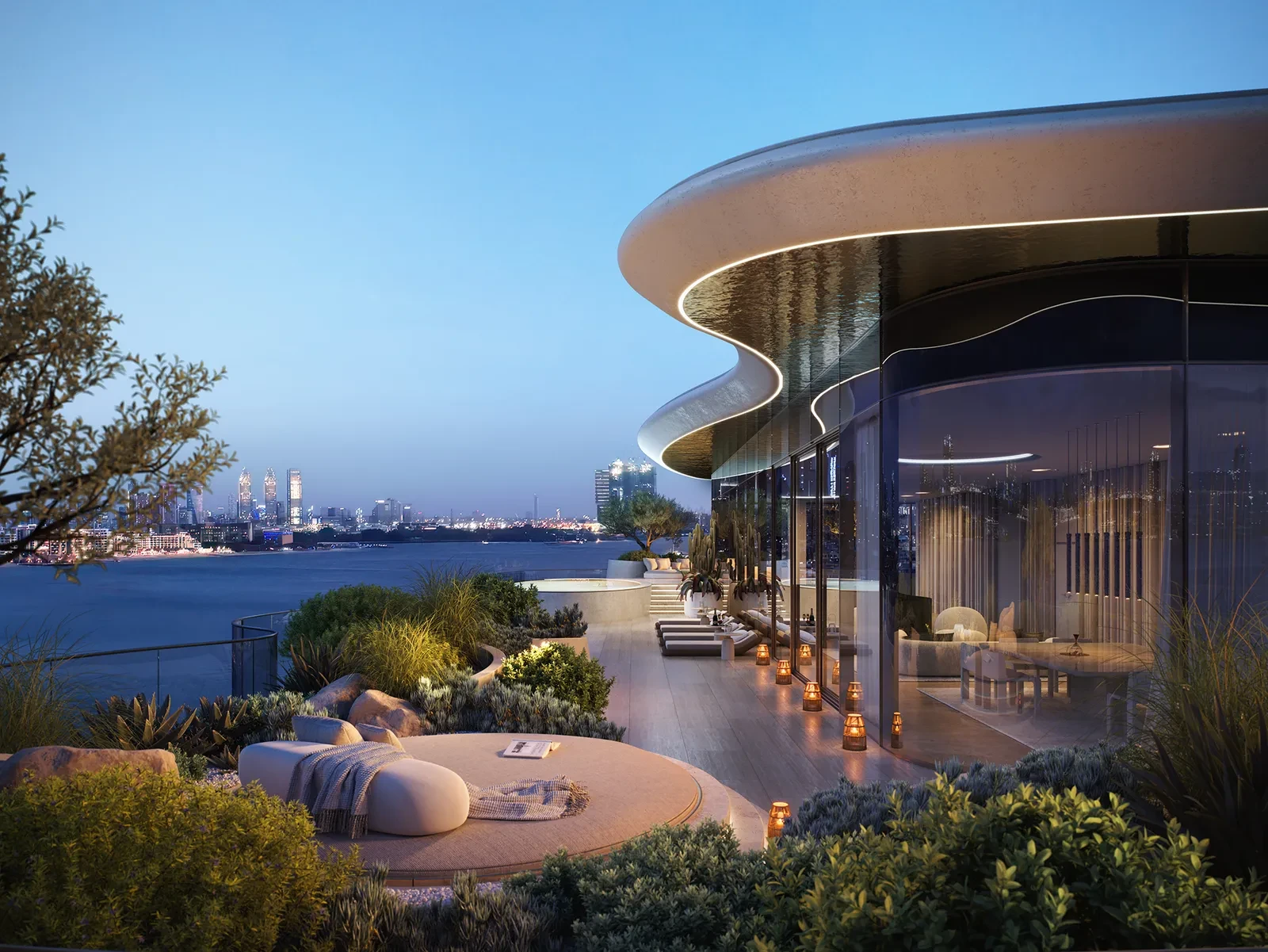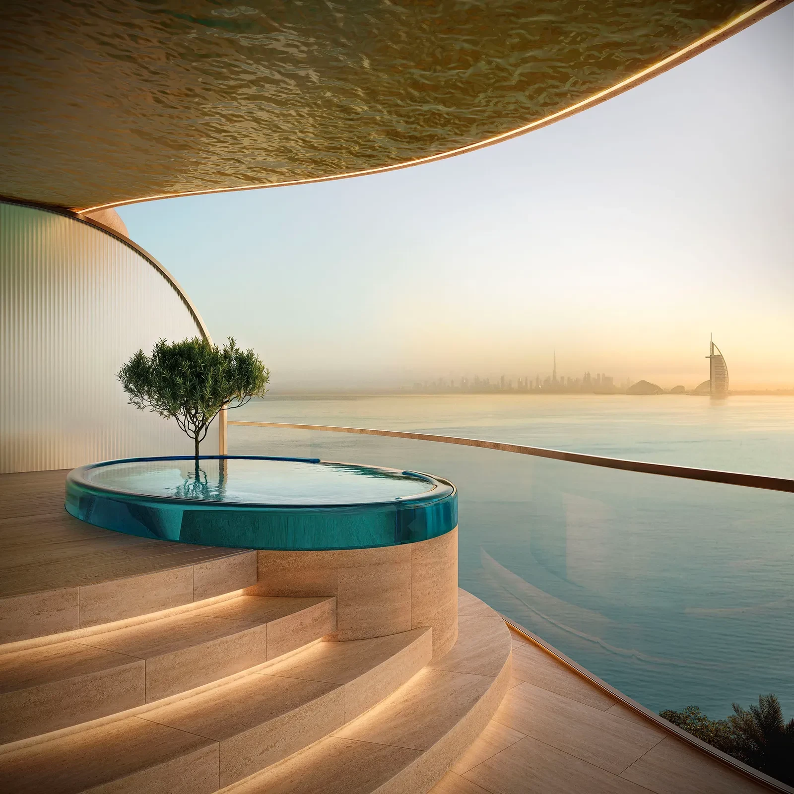 Οι plunge pools με θέα τον ορίζοντα του Ντουμπάι φιλοξενούν από ένα μοναδικό δέντρο, ως μια διακριτική αναφορά στη φιλοσοφία της αποδόμησης που χαρακτηρίζει τον οίκο Margiela. Οι οροφές από σφυρήλατο μέταλλο αντανακλούν τις βαθιές αποχρώσεις του ηλιοβασιλέματος, ενώ οι ιδιωτικοί κήποι «κυλούν» πάνω από τις άκρες του Palm Island. Στο εσωτερικό, κυριαρχούν εργονομικές φόρμες και φυσικές τονικότητες, που διακόπτονται αιφνιδιαστικά από κυβιστικούς πυλώνες, γυαλιστερές σκάλες σε γραφίτη, γωνιώδεις καρέκλες και παλαιωμένους καθρέφτες με broken εφέ, δημιουργώντας ένα περιβάλλον ιδιαίτερο αλλά απόλυτα ισορροπημένο.