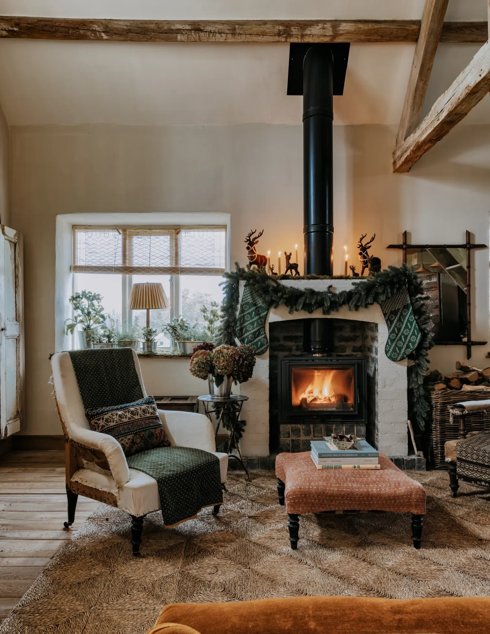 Για το τραπέζι επέλεξε να κινηθεί σε παρόμοια σχεδιαστική φιλοσοφία, τοποθετώντας τριγύρω του πράσινα στολισμένα κλαδιά. Φυσικά, δε θα μπορούσε κανείς να παραλείψει τις κάλτσες που κρέμονται στο κάτω σημείο και ξεχωρίζουν τα έντονα χρώματα και τα διαφορετικά μοτίβα τους. Στο πάνω μέρος του τζακιού η Amanda έχει βάλει ψηλά κεριά σε μπεζ απόχρωση. Όταν το τζάκι είναι αναμμένο, όπως επίσης και τα κεριά, η όλη εικόνα κάνει τον νου να ταξιδεύει.