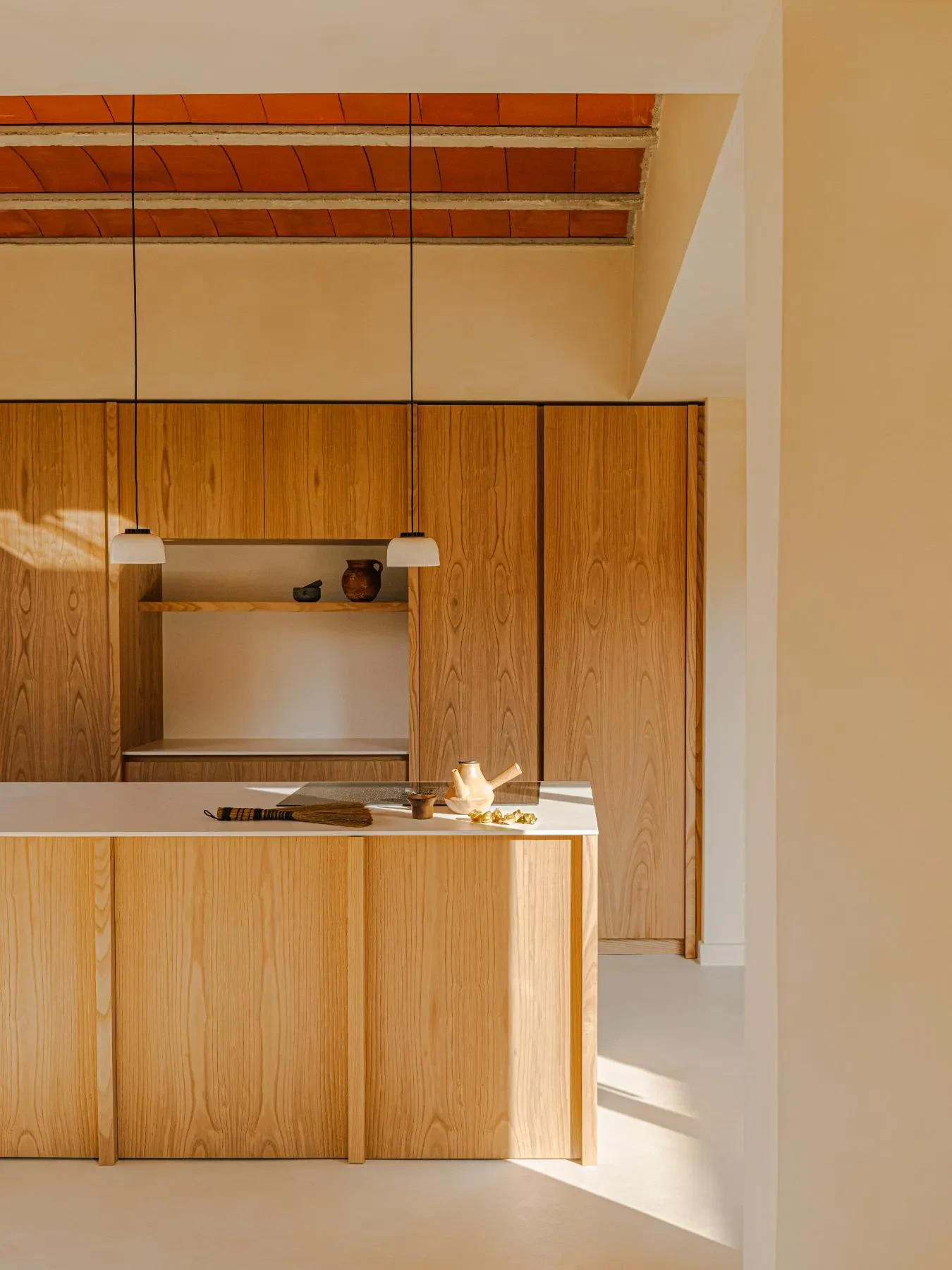 Τα τούβλα, κατασκευασμένα με φυσικό πηλό, αργή ξήρανση και ξυλόφουρνο, διαθέτουν μοναδικότητα σε κάθε κομμάτι, με μικρές «ατέλειες» που μετατρέπονται σε στοιχεία γοητείας. Ενσωματώνονται στους τοίχους, στις λεπτομέρειες των παραθύρων, ακόμη και στο εξωτερικό δάπεδο, δημιουργώντας έναν διάλογο ανάμεσα στο χτισμένο και το φυσικό περιβάλλον. Η φιλοσοφία αυτή αντικατοπτρίζει την πεποίθηση του γραφείου πως η αρχιτεκτονική οφείλει να αντέχει στον χρόνο, να σέβεται το περιβάλλον και να ωριμάζει με χάρη, αφήνοντας τα σημάδια των ετών να γίνονται κομμάτι της ταυτότητάς της.