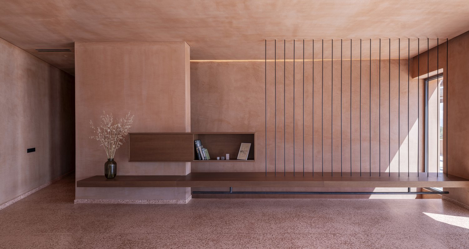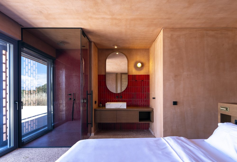 Ο χώρος διαμορφώνεται με γνώμονα την απλότητα και την υλικότητα, αποφεύγοντας τον εντυπωσιασμό υπέρ μιας διακριτικής, γήινης αισθητικής. Το σύνολο επενδύεται με φυσικά υλικά που εφαρμόζονται ομοιογενώς σε όλες τις επιφάνειες, δημιουργώντας μια ατμόσφαιρα συνεκτική και ήρεμη. Τα χειροποίητα πλακάκια, οι μαρμάρινες λεπτομέρειες και τα στοιχεία ξύλου συνδυάζονται με αποχρώσεις τερακότας, που μοιάζουν να αντλούνται από το ίδιο το έδαφος του νησιού. Η υλικότητα αναδεικνύεται ως φορέας εμπειρίας, αφής και θερμότητας, προσφέροντας αίσθηση οικειότητας και ενδοσκόπησης.