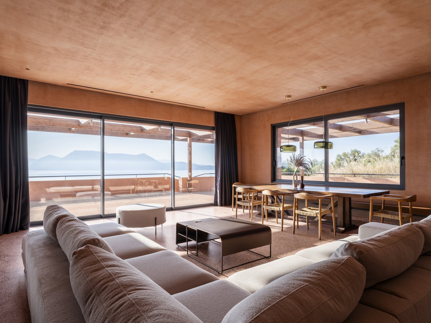 Η κλιμακωτή διαμόρφωση του υπαίθριου χώρου ακολουθεί πιστά τη μορφολογία του εδάφους, αναπτύσσοντας τρία διακριτά επίπεδα με ξεχωριστή λειτουργία. Η ενδιάμεση ζώνη φιλοξενεί την πισίνα, η οποία λειτουργεί ως σημείο αναφοράς και ήπιας κοινωνικής συνάθροισης. Το υψηλότερο επίπεδο προσφέρει ανεμπόδιστη θέα προς το Ιόνιο πέλαγος και τις ορεινές κορυφογραμμές της Πίνδου, αναδεικνύοντας την τοποθεσία ως προνομιακό παρατηρητήριο. Αντίθετα, το χαμηλότερο επίπεδο εισχωρεί διακριτικά στο ανάγλυφο, σχηματίζοντας έναν εσωστρεφή κήπο – ένα ήσυχο καταφύγιο ιδιωτικότητας, βυθισμένο μέσα στο ίδιο το τοπίο.