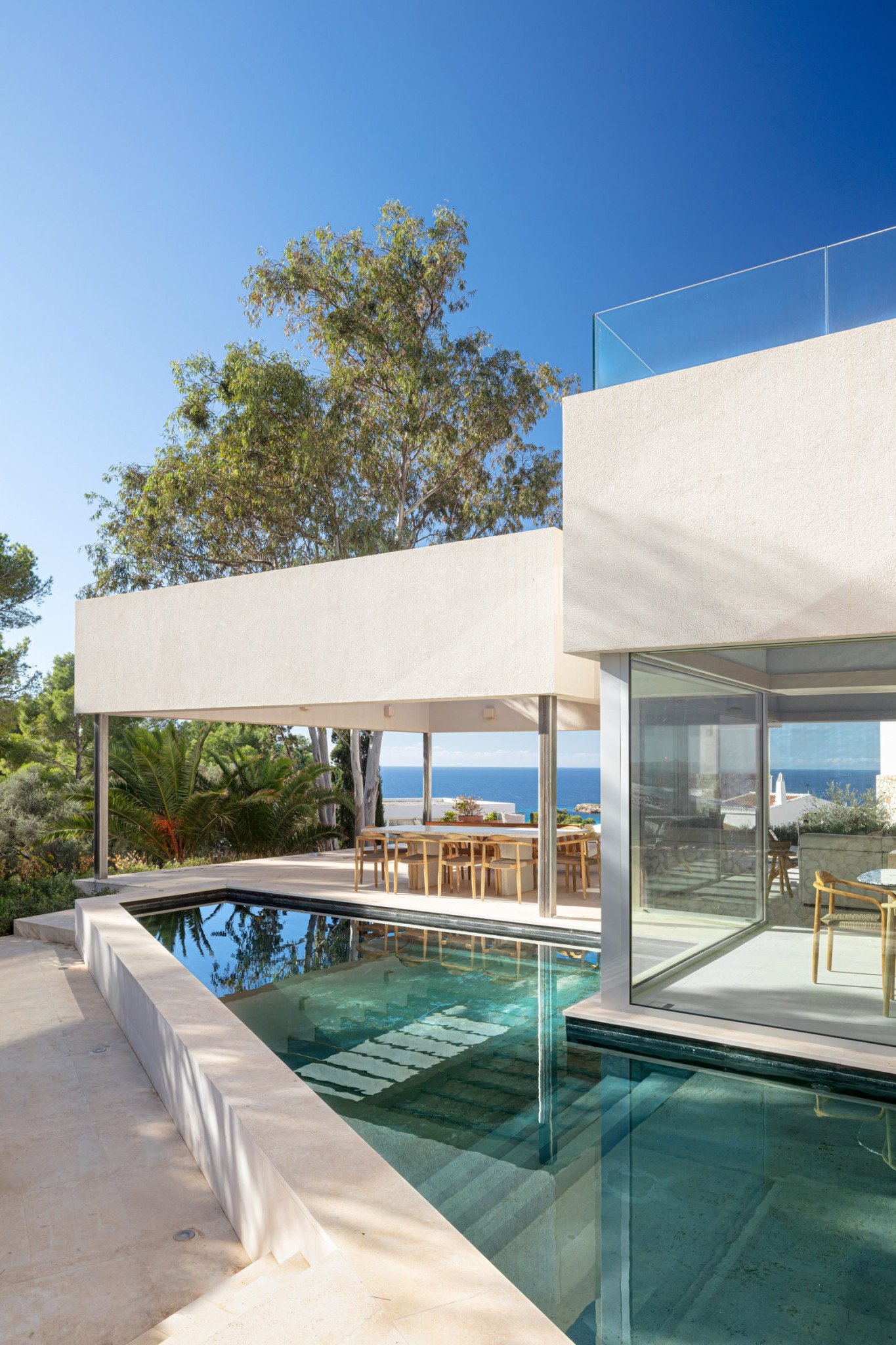 Η κεντρική είσοδος οδηγεί σε έναν διώροφο χώρο, φωτεινό και επιβλητικό, όπου μια κομψή σπειροειδής σκάλα συνδέει το ισόγειο με τον πρώτο όροφο. Εκεί, τα μεγαλύτερα δωμάτια φιλοξενούνται σε πιο συμπαγείς όγκους, προσφέροντας άπλετο χώρο και άμεση πρόσβαση στην ταράτσα. Από το υπερυψωμένο αυτό σημείο, η θέα ξεδιπλώνεται προς τον ορίζοντα, αναδεικνύοντας την τοπογραφία και τη σχέση του σπιτιού με το φυσικό τοπίο που το περιβάλλει. Η εμπειρία της κατοίκησης ολοκληρώνεται στην κορυφή, εκεί όπου η αρχιτεκτονική σταματά και αρχίζει το πέλαγος.