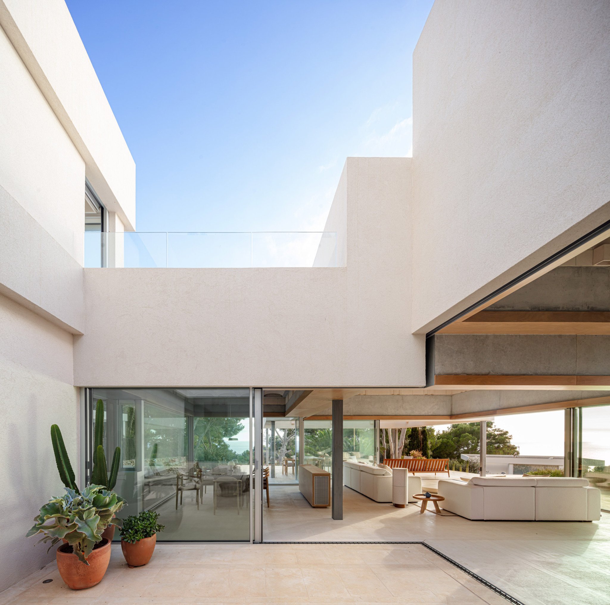 Η σχέση με το τοπίο ενισχύεται από την επιλογή του διάφανου ισογείου. Οι υαλοστάσεις σε πλήρη έκταση δημιουργούν ένα συνεχές οπτικό πεδίο που διατρέχει τον χώρο: από τον εσωτερικό πυρήνα, μέσα από τις αυλές και τις βεράντες, μέχρι τη θάλασσα στο βάθος. Η Bundle House δεν περιορίζει την εμπειρία στον εσωτερικό χώρο – αντίθετα, ενθαρρύνει τη συνεχή μετακίνηση του βλέμματος και του σώματος, προσκαλώντας τον κάτοικο να ανακαλύψει το σπίτι μέσα από διαρκείς μεταβάσεις. Στο κέντρο της σύνθεσης, οι κύριες καθημερινές λειτουργίες – κουζίνα, τραπεζαρία, καθιστικό – συγκεντρώνονται γύρω από μια προστατευμένη αυλή, διαμορφώνοντας έναν ενιαίο χώρο συνάντησης και συνύπαρξης.