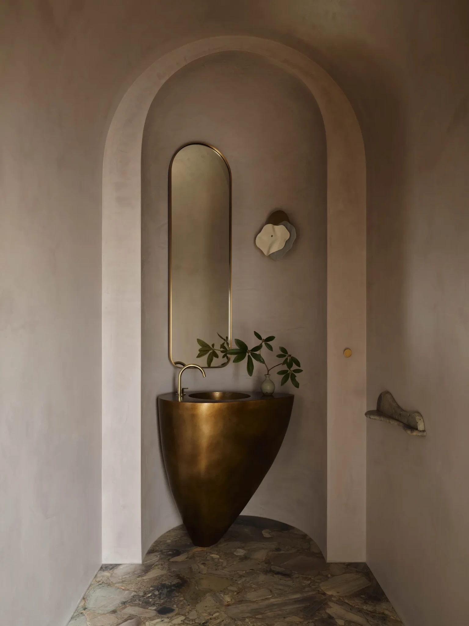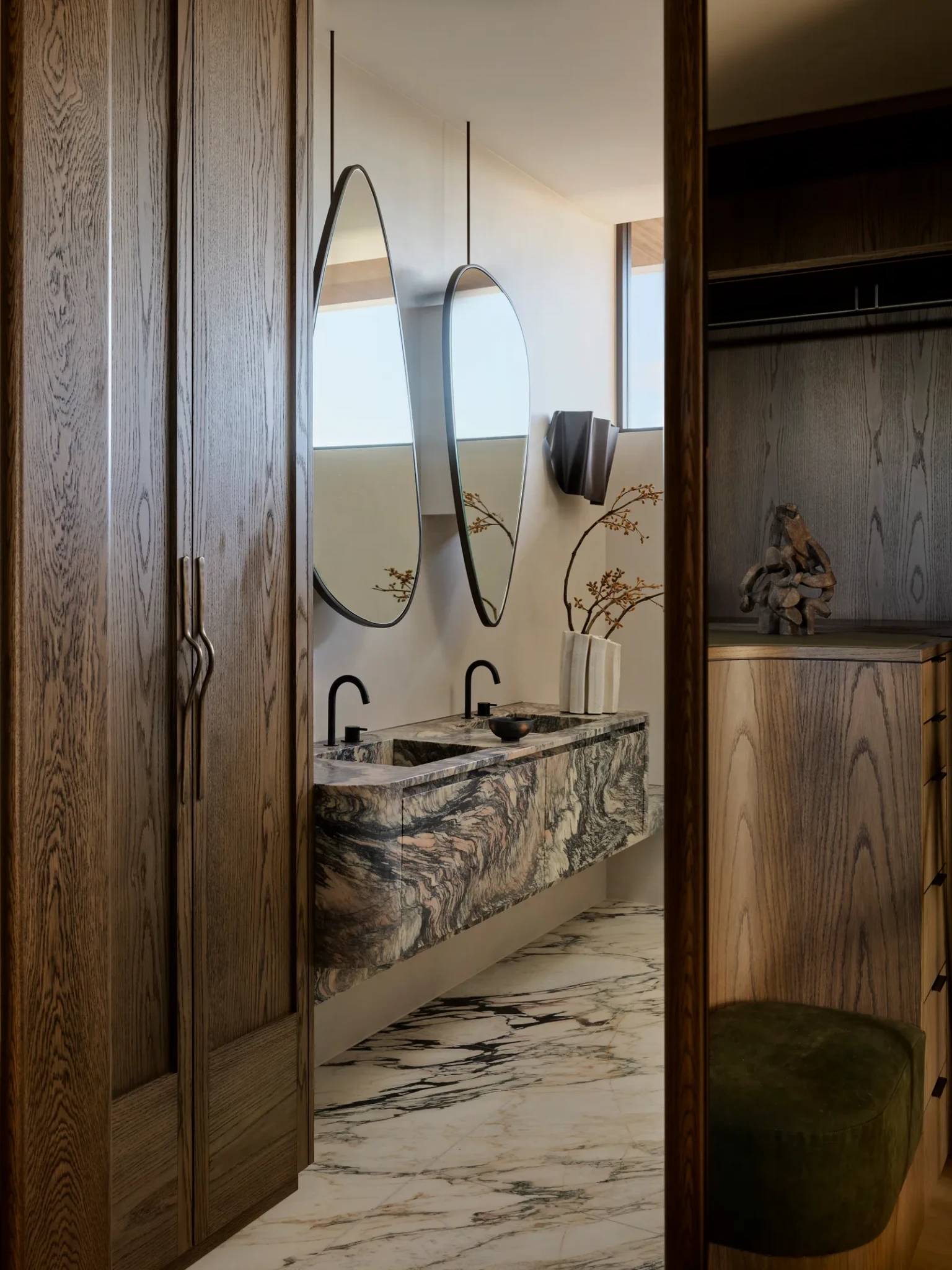 Η εσωτερική ταυτότητα του σπιτιού μοιάζει με υφαντό όπου κάθε νήμα έχει επιλεγεί με συνείδηση και ακρίβεια. Μάρμαρο με λεπτές φλέβες που μοιάζουν με παλίρροιες, σοβάς marmorino που αφήνει ένα απαλό ματ φινίρισμα στους τοίχους, ξύλο δρυός που εκπέμπει ζεστασιά. Αυτά τα υλικά συνθέτουν έναν κόσμο όπου η υφή είναι εξίσου σημαντική με το χρώμα.