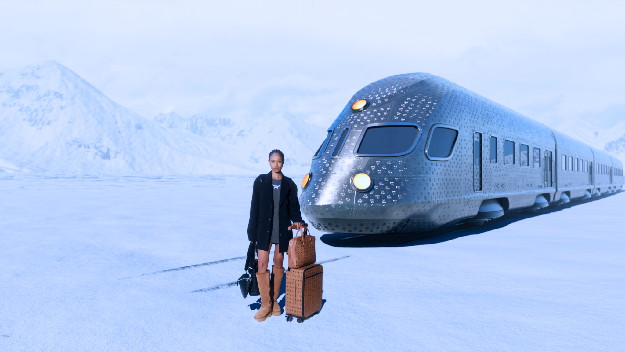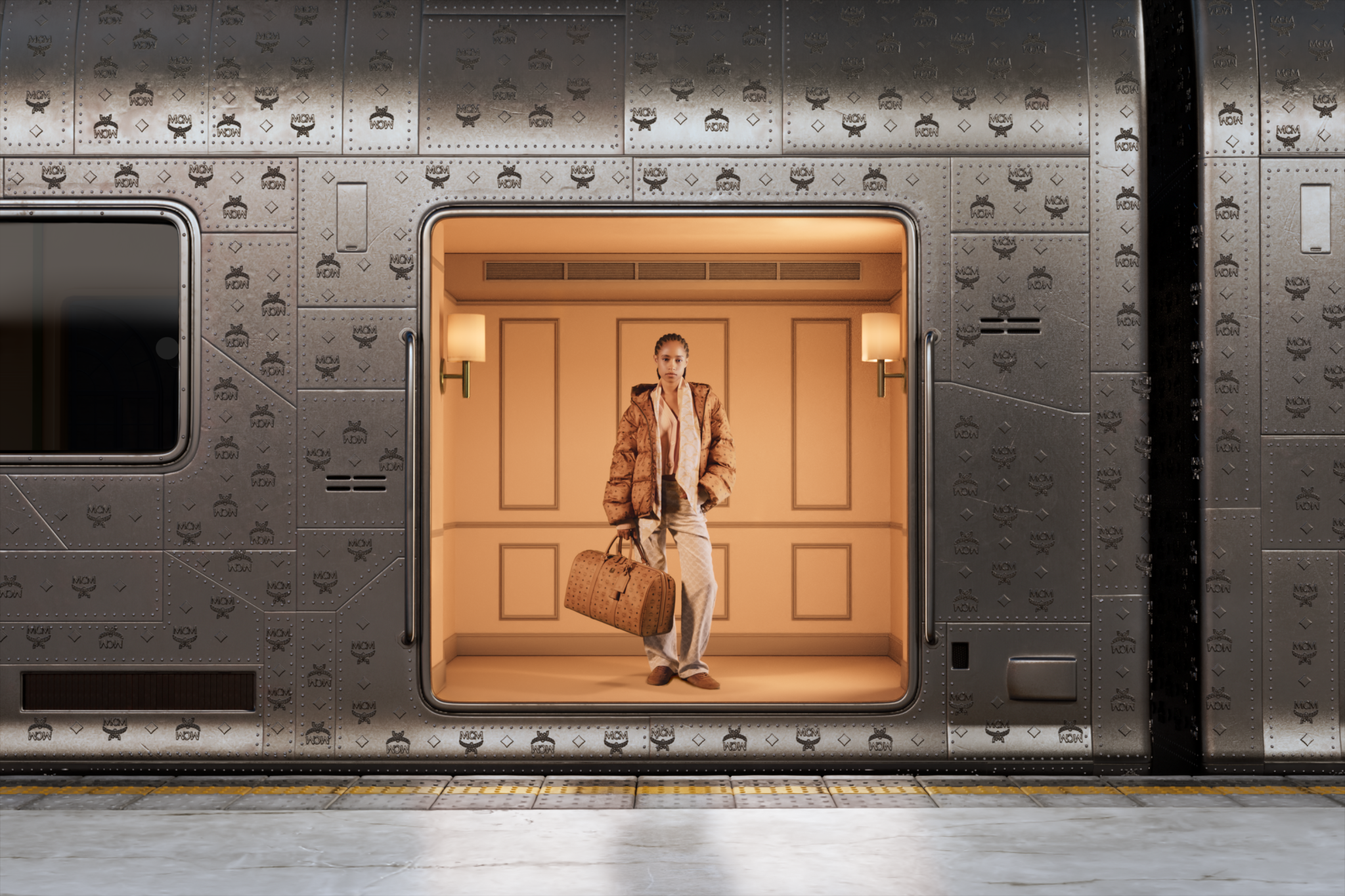 Το ταξίδι ξεκινά στο Μόναχο, την πόλη όπου γεννήθηκε η MCM και πλέον μεταμορφώνεται σε ένα τεχνολογικά ανεπτυγμένο, φωτεινό μητροπολιτικό τοπίο. Εκεί, οι ταξιδιώτες ετοιμάζονται να επιβιβαστούν στο Holiday Express, συνοδευόμενοι από ρομποτικούς βοηθούς και περιτριγυρισμένοι από τα εμβληματικά Haus Codes του brand. Στο κέντρο της σκηνής βρίσκεται η New Liz Shopper, ένα από τα πιο αγαπημένα σχέδια της MCM, που εδώ παρουσιάζεται σε νέες, γιορτινές εκδοχές, αλλά και στη διαχρονική Cognac Visetos. Μια τσάντα σύμβολο, που αποτελεί την πρώτη «βαλίτσα» του ταξιδιού.