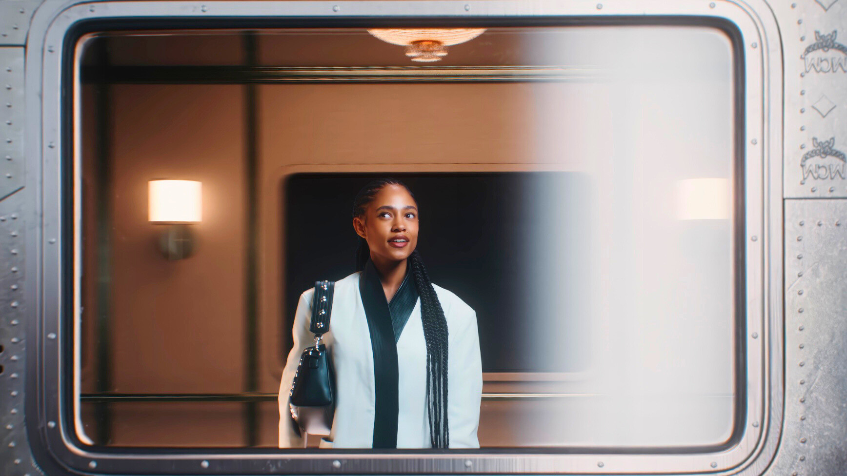 Το τρίτο κεφάλαιο της καμπάνιας διαδραματίζεται στο περιστρεφόμενο βαγόνι-εστιατόριο, όπου οι επιβάτες απολαμβάνουν ένα δείπνο που θυμίζει σκηνή από ταινία επιστημονικής φαντασίας, καθώς μοιάζει σαν να μην υπάρχει βαρύτητα. Έτσι τα σύμβολα της MCM μετατρέπονται σε αιωρούμενα γλυπτά, αποκαλύπτοντας τη δεξιοτεχνία και το savoir-faire του οίκου. Στο επίκεντρο βρίσκεται η Aren Mini Bag. Πρόκειται για ένα αρχειακό σχέδιο του οίκου που επανέρχεται στη συλλογή Φθινόπωρο/Χειμώνας 2025, ανανεωμένο με σύγχρονες λεπτομέρειες και πιο καθαρές, μοντέρνες γραμμές.