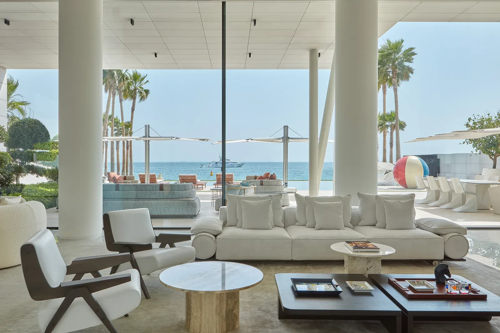 Οι ευρύχωροι χώροι επικοινωνούν με γυάλινες συρόμενες πόρτες που ανοίγουν πλήρως στην εξωτερική βεράντα, διαλύοντας τα όρια ανάμεσα στο εσωτερικό και το εξωτερικό. Η συνεχής ροή του χώρου επιτρέπει τη διοργάνωση εκδηλώσεων καθ’ όλη τη διάρκεια του χρόνου, προσφέροντας την αίσθηση ότι κάθε στιγμή στο εσωτερικό θυμίζει μια ημέρα στην παραλία. Η γλώσσα των χώρων συνδυάζει διακριτικά σύγχρονα και παραθαλάσσια στοιχεία, δημιουργώντας μια ατμόσφαιρα που είναι ταυτόχρονα εντυπωσιακή και ζεστά φιλόξενη.