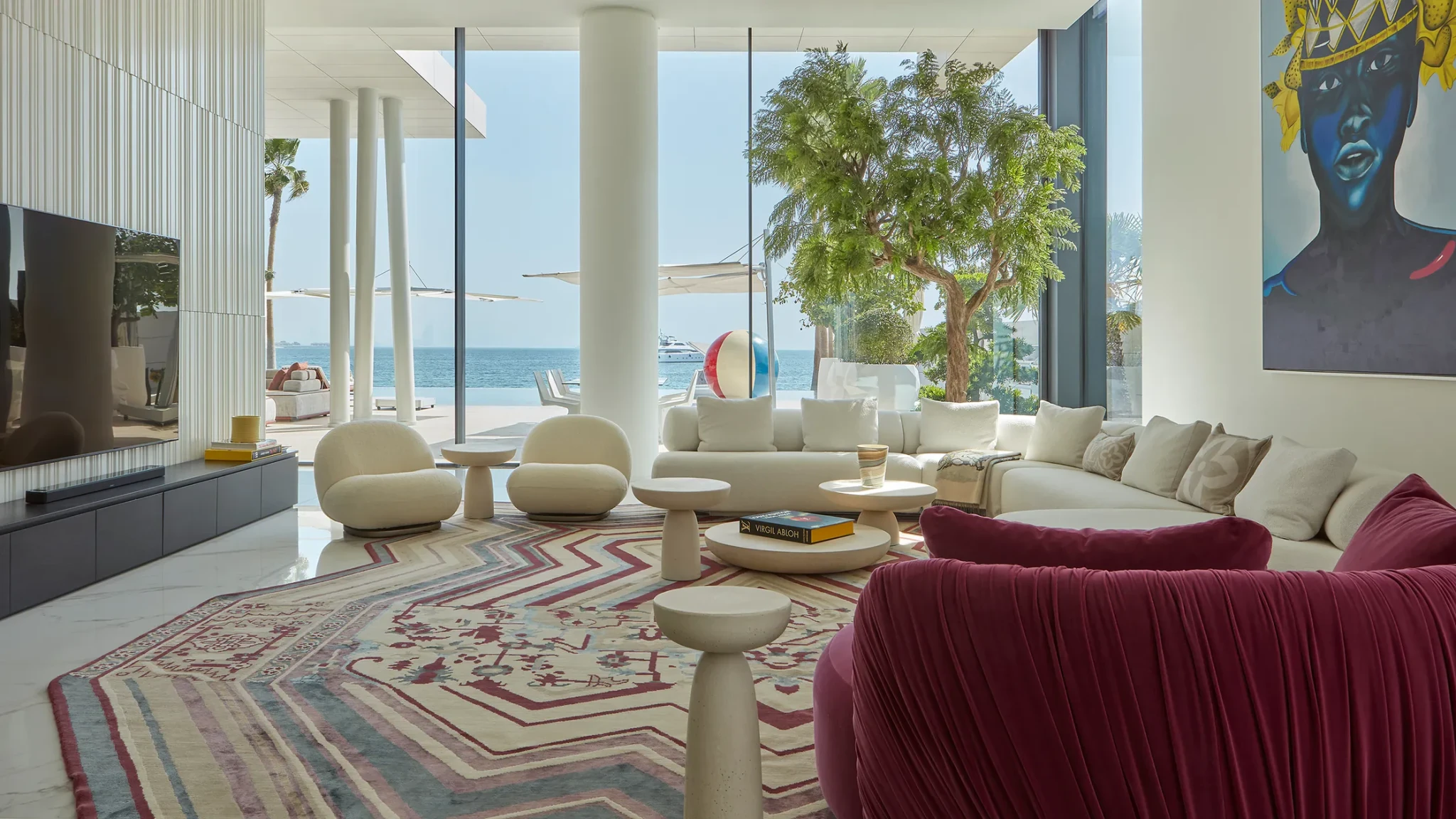 Το φυσικό φως γίνεται πρωταγωνιστής, διεισδύοντας από φεγγίτες και οροφές από γυαλί, πλημμυρίζοντας την τραπεζαρία διπλού ύψους και ενισχύοντας την αίσθηση ανοιχτότητας και κάθετης διαδρομής. Η αρχιτεκτονική συνδέει τις καθαρές γραμμές με στοιχεία παραθαλάσσιας αισθητικής, τονίζοντας την κομψότητα, τις ισορροπημένες αναλογίες και τον διαχρονικό χαρακτήρα των χώρων. Οι εσωτερικοί χώροι ολοκληρώνονται με προσεκτικά επιλεγμένα έργα τέχνης και έπιπλα ευρωπαϊκών και αμερικανικών σχεδιαστών, που αντικατοπτρίζουν το κοσμοπολίτικο και εκλεπτυσμένο πνεύμα των ιδιοκτητών.