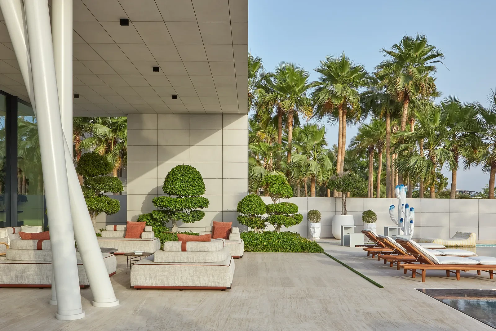 Η πισίνα υπερχείλισης μοιάζει να ενώνεται με τον ορίζοντα, ενώ οι ζώνες lounge, οι σκιασμένες βεράντες και οι καταπράσινοι κήποι πλαισιώνουν τις καθαρές γραμμές της βίλας, διατηρώντας ανεμπόδιστη τη θέα στη θάλασσα. Τα υλικά – από ασβεστόλιθο και βουρτσισμένο μέταλλο μέχρι χειροποίητους σοβάδες και θερμά ξύλινα στοιχεία – επιλέχθηκαν με προσοχή για αντοχή στο κλίμα της περιοχής, διατηρώντας παράλληλα μια οπτική απαλότητα και κομψότητα.