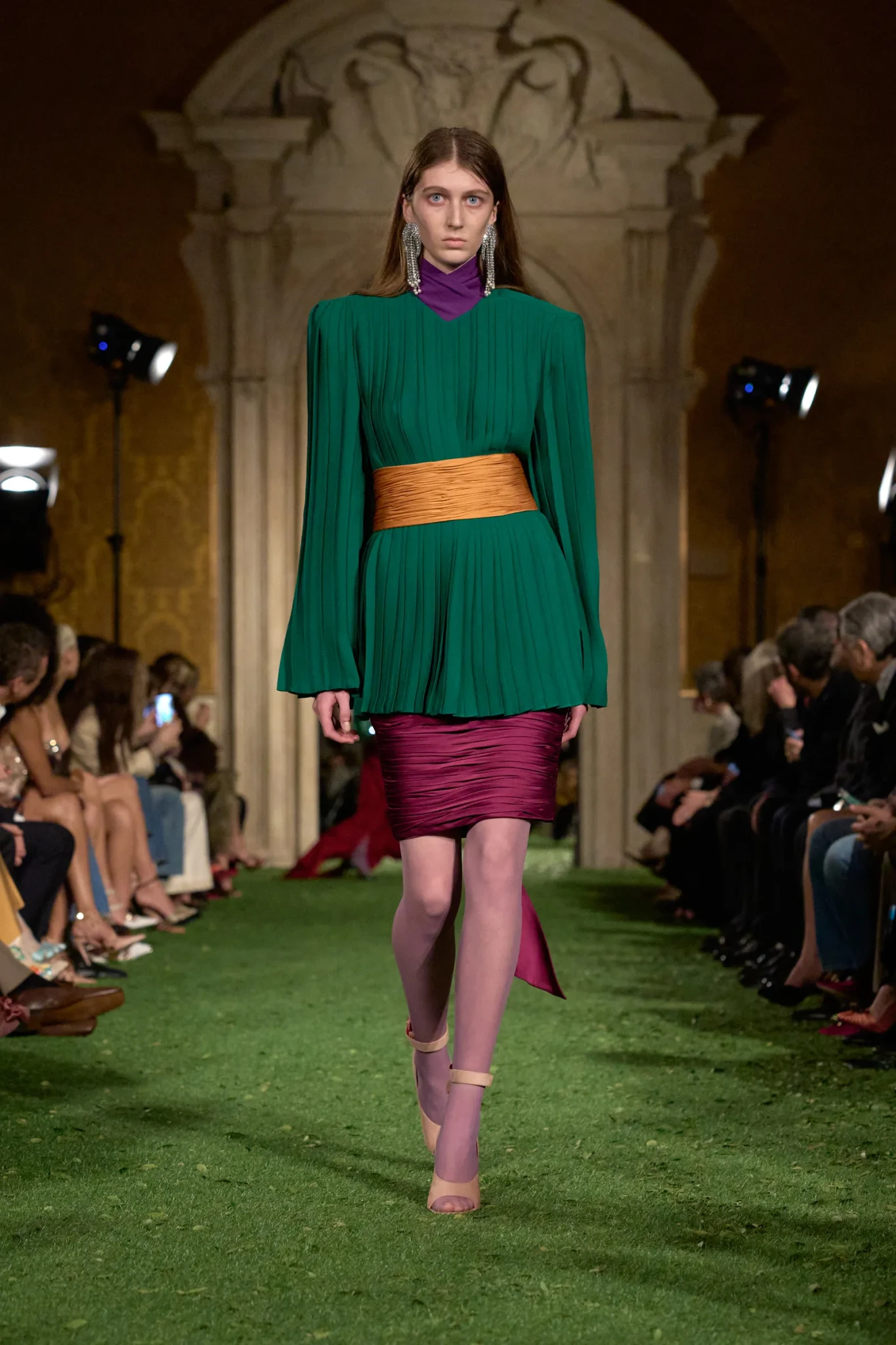 Η χρωματική παλέτα της συλλογής υπήρξε εξίσου εκφραστική. Μουσταρδί, μοβ της λεβάντας, σμαραγδί, μπορντό και έντονο πορτοκαλί συνδυάστηκαν σε απρόσμενες αντιθέσεις, δημιουργώντας μια έντονα θεατρική αίσθηση. Σε πολλά looks, σατέν ζώνες τύπου sash έσφιγγαν τη μέση, ενώ βελούδα, δαντέλες και λαμπερές παγιέτες πρόσθεταν μια διακριτική πολυτέλεια.