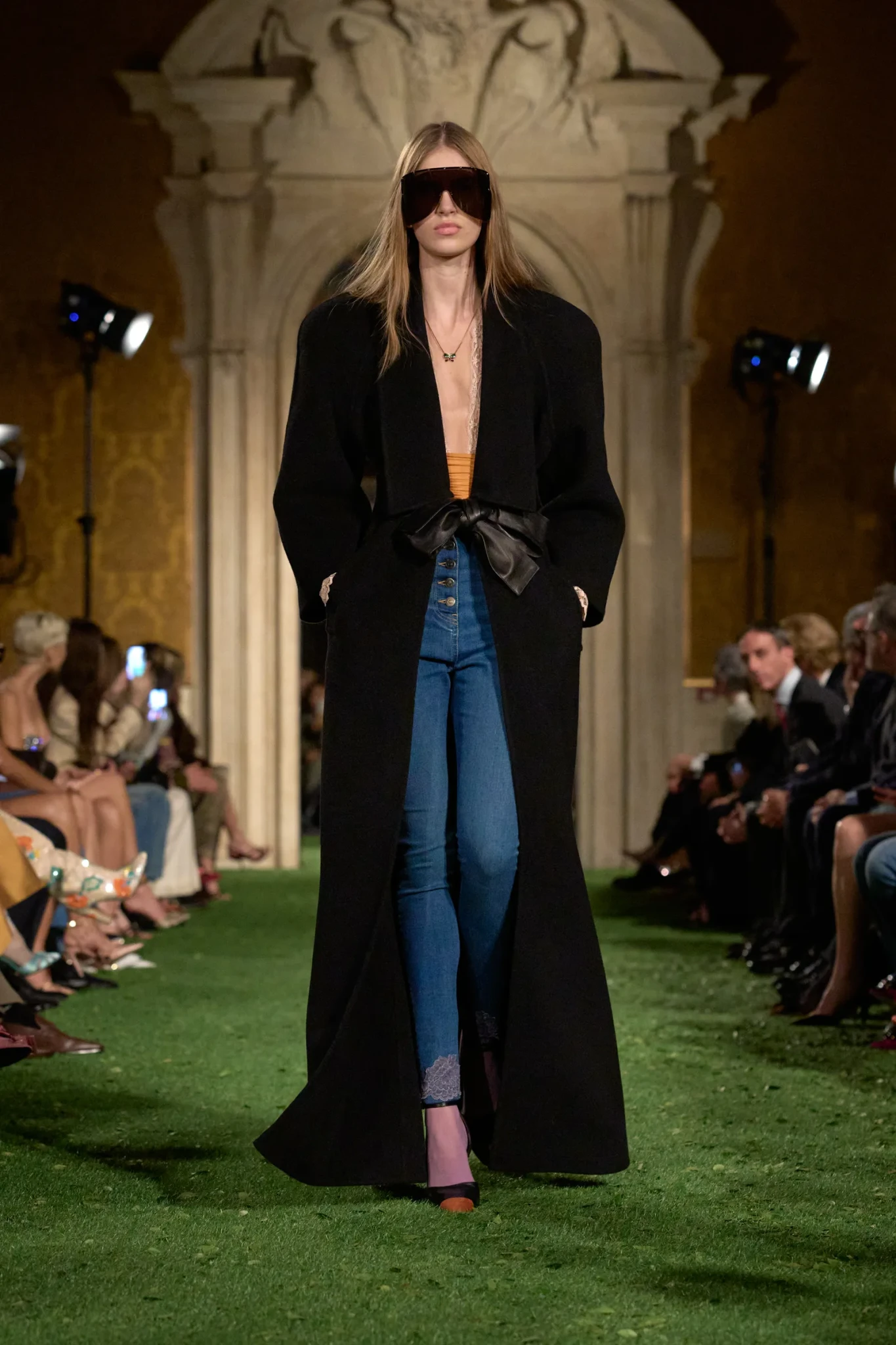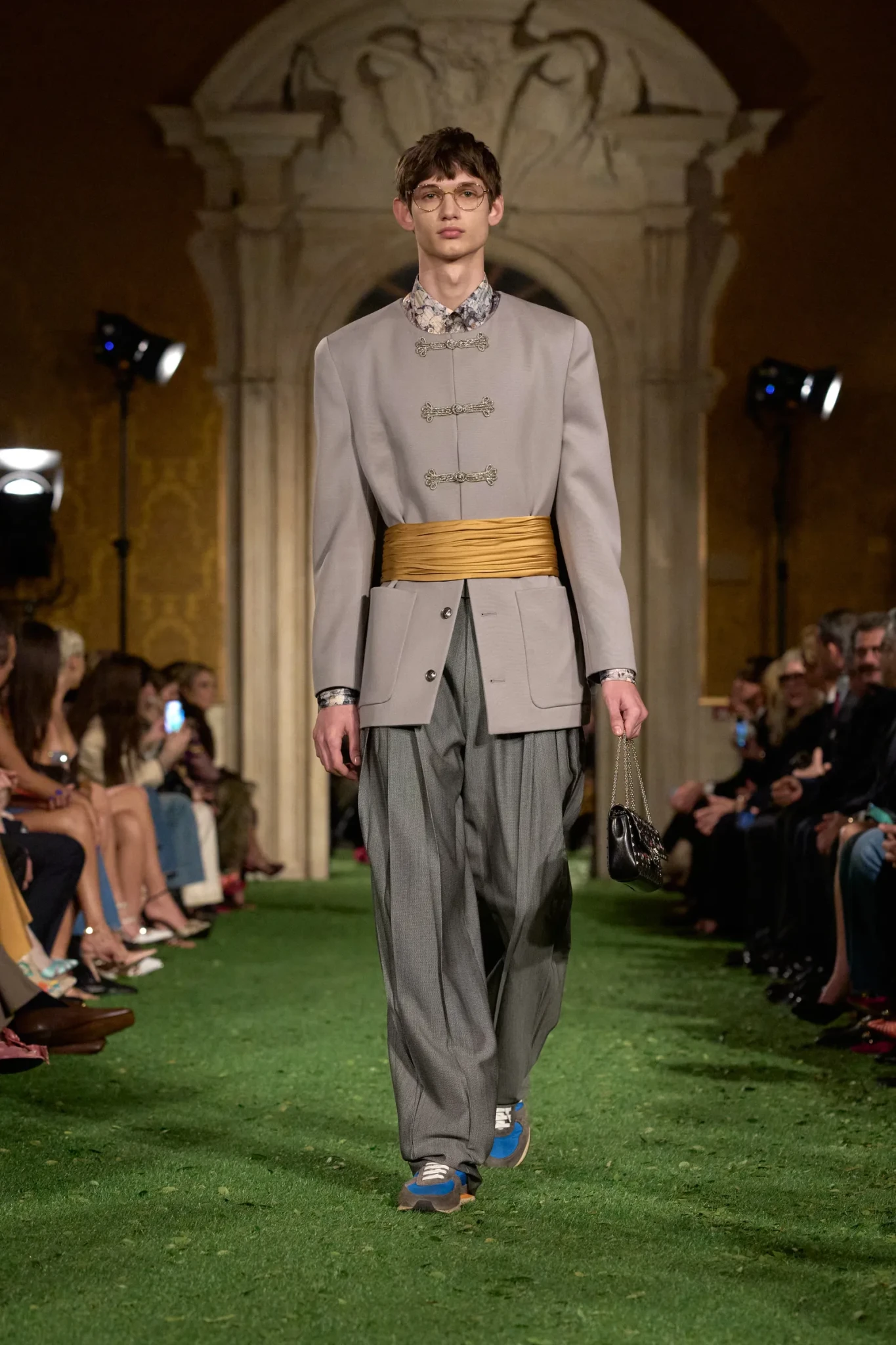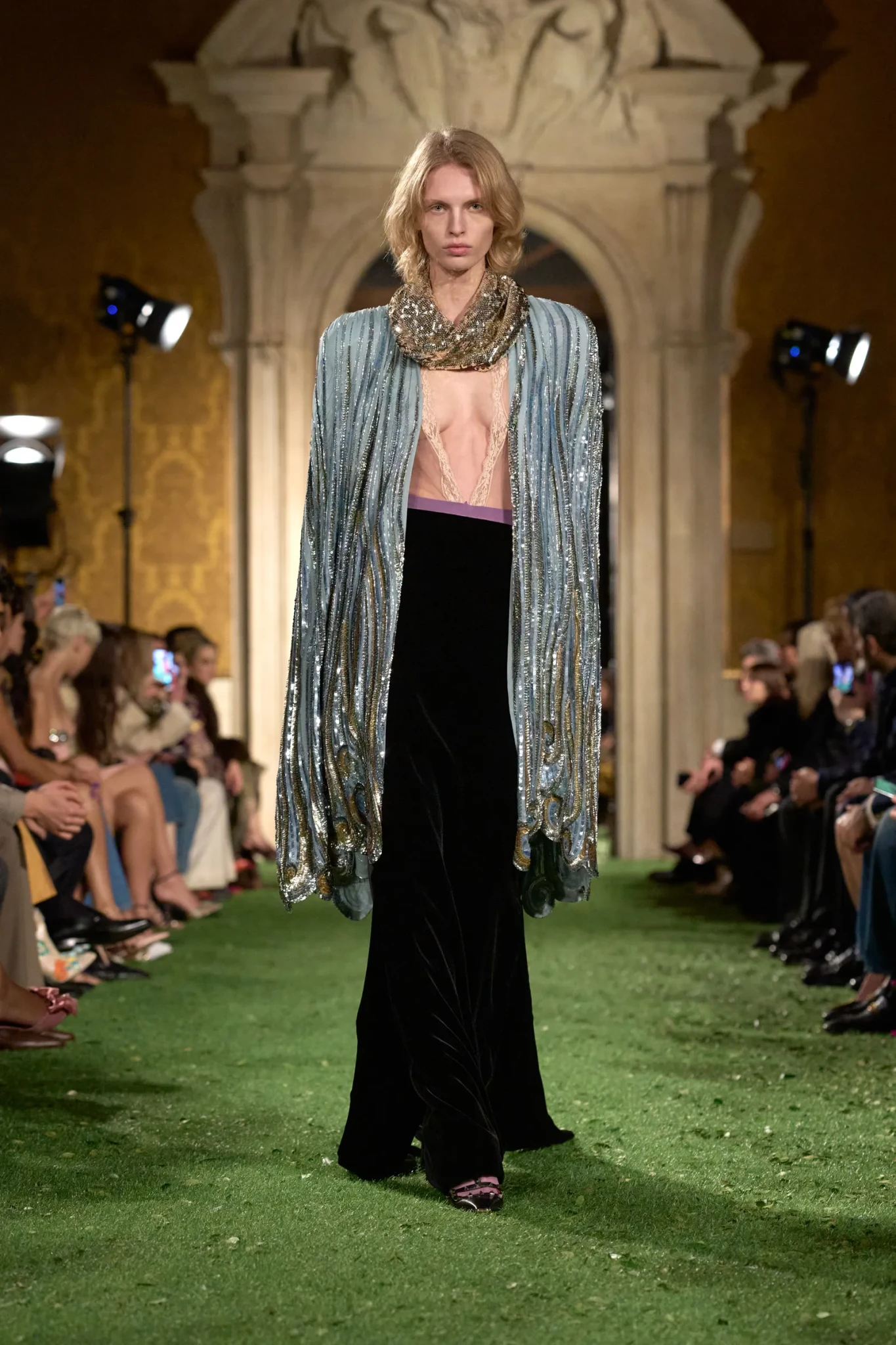 Η επίδειξη πραγματοποιήθηκε στη Ρώμη - και όχι στο Παρίσι όπως συνηθίζεται - σε μια κίνηση που είχε ισχυρό συμβολισμό. Ο Michele ήθελε να επιστρέψει στις ρίζες του οίκου και να επαναφέρει τη ρωμαϊκή του μεγαλοπρέπεια. Το Palazzo Barberini, ένα εμβληματικό δείγμα μπαρόκ αρχιτεκτονικής σχεδιασμένο από τους Carlo Maderno, Gian Lorenzo Bernini και Francesco Borromini, αποτέλεσε το ιδανικό σκηνικό. Οι επιχρυσωμένες αίθουσες με τις περίτεχνες τοιχογραφίες απέκτησαν μια αναπάντεχη διάσταση όταν τα δάπεδα καλύφθηκαν με συνθετικό γρασίδι και μικρά φύλλα. Η φύση εισέβαλε μεταφυσικά στο παλάτι, δημιουργώντας μια αίσθηση οπτικής «παρεμβολής» – μια εικόνα που, σύμφωνα με τον Michele, αντικατοπτρίζει τη σύγχρονη εμπειρία της πραγματικότητας μέσα από τα social media.