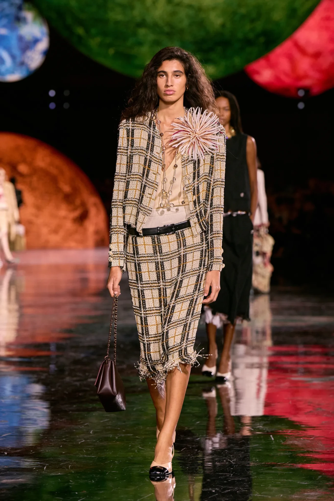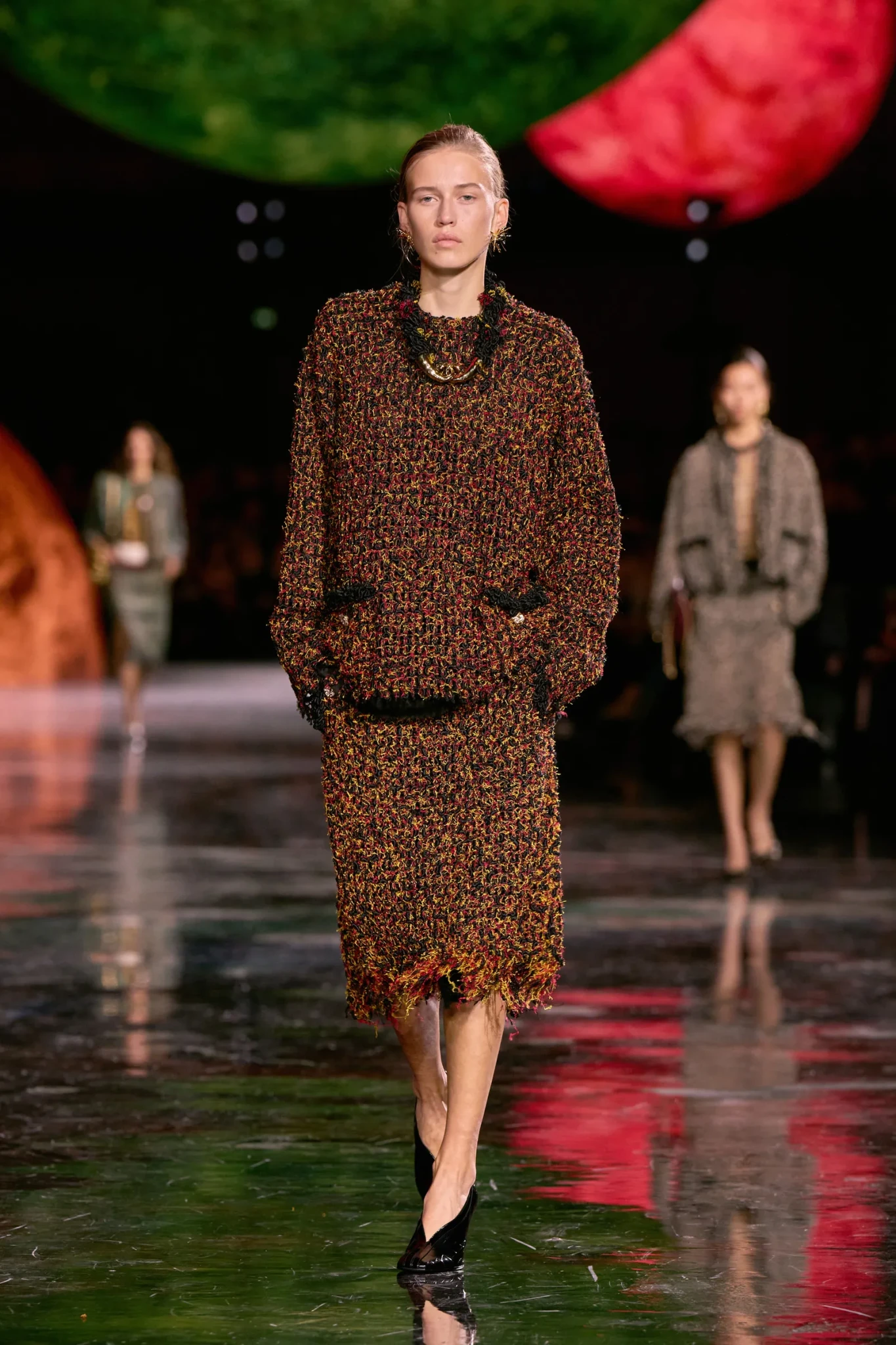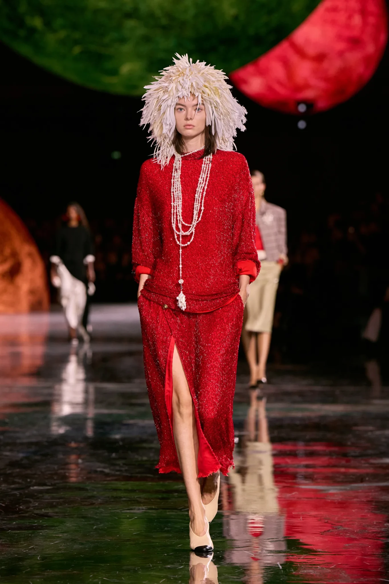 Το σκηνικό στο Grand Palais ήταν αντάξιο της παράδοσης του οίκου. Ένας λαμπερός γαλαξίας, με τεράστιες φωτεινές σφαίρες να αιωρούνται πάνω από ένα κατάμαυρο, γυαλιστερό πάτωμα που θύμιζε τον έναστρο ουρανό. Ο Blazy, εμπνευσμένος από τη γοητεία της Coco Chanel για το διάστημα, ήθελε, όπως δήλωσε, «να δημιουργήσει κάτι καθολικό, ένα όνειρο, κάτι έξω από τον χρόνο».