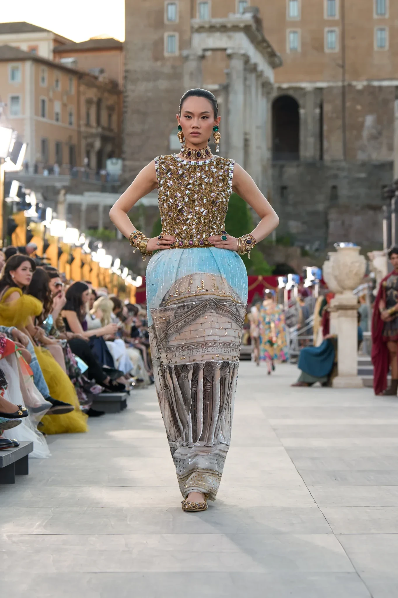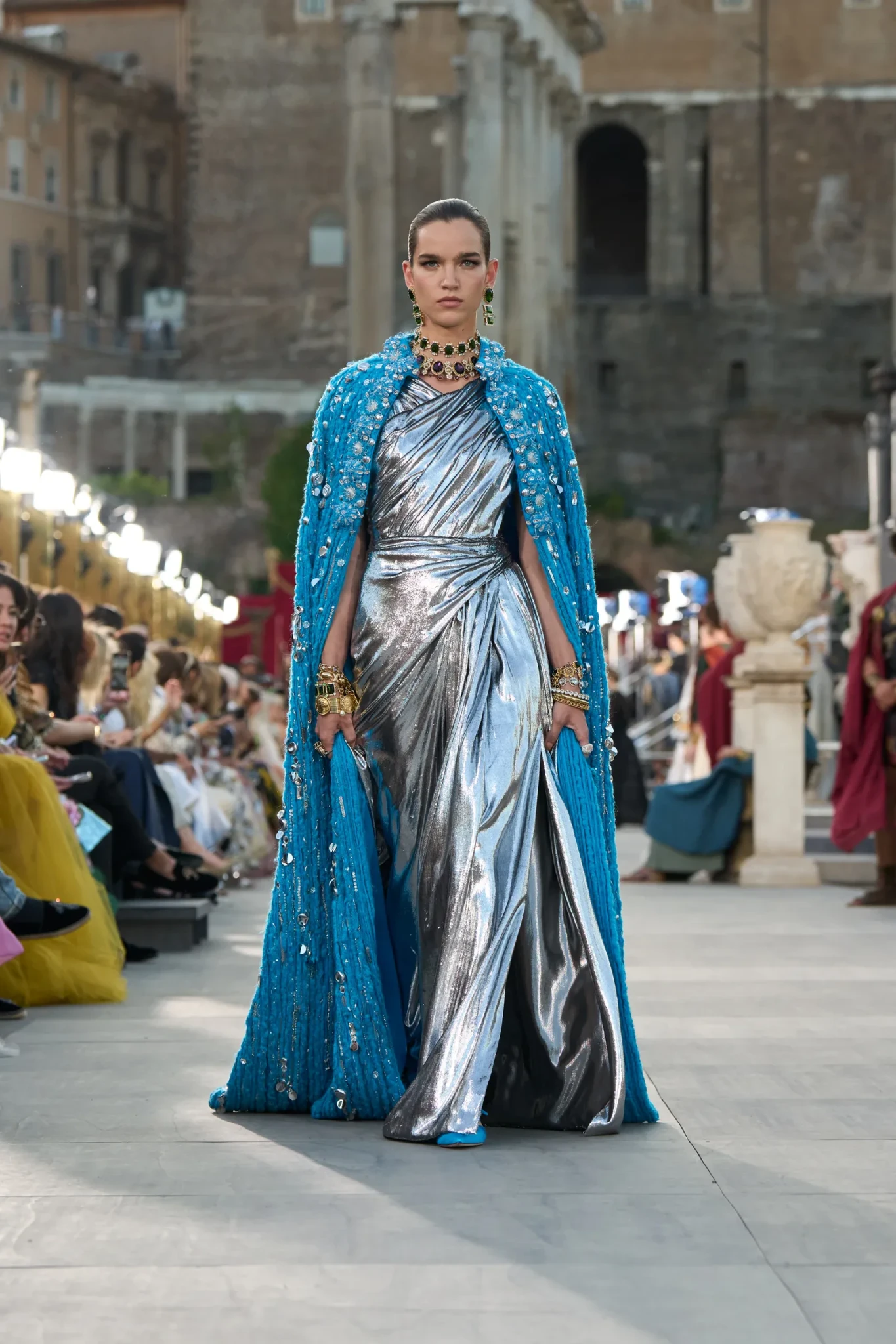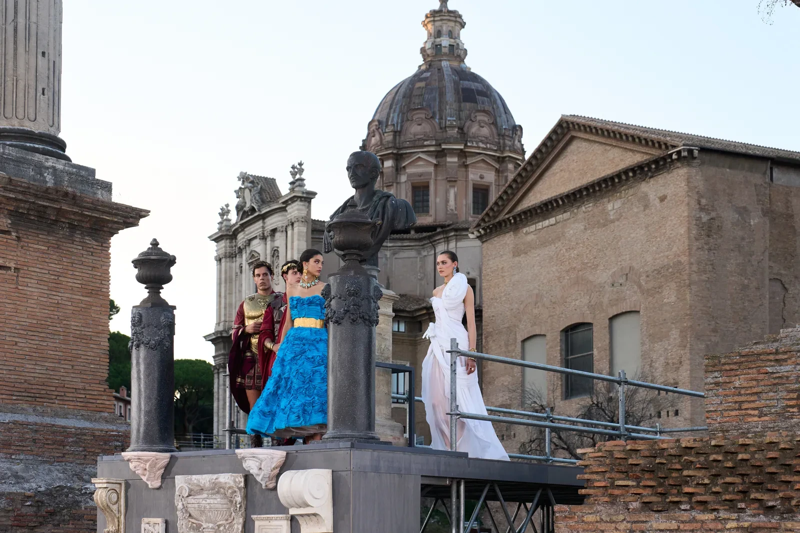 Το Ρωμαϊκό Φόρουμ είναι ένα τοπόσημο μοναδικό, ένα μέρος όπου η αρχιτεκτονική των αιώνων συμβιώνει. Όπως έλεγε και ο Fellini, «κάτω από τη σύγχρονη Ρώμη, βρίσκεται η αρχαία Ρώμη - τόσο κοντά». Αυτό το αίσθημα διαπερνούσε το show της νέας Alta Moda. Τα σημεία αναφοράς ήταν παντού!