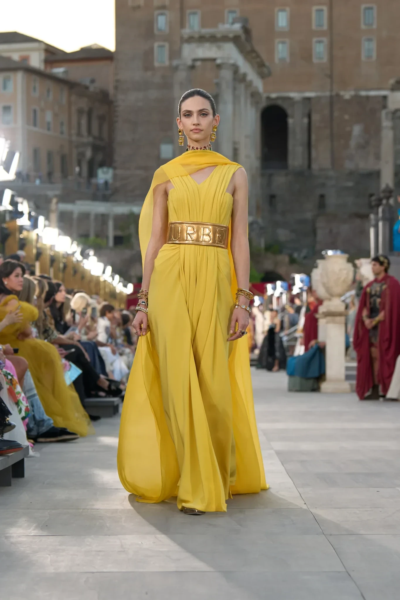 Το show ήταν καθηλωτικό από κάθε άποψη. Ξεκίνησε με μια βαθυκόκκινη βελούδινη κάπα πάνω από ένα στράπλες φόρεμα, με τη λύκαινα της Καπιτωλίου -σύμβολο της Ρώμης- κεντημένη με παγιέτες στο κάτω μέρος. Στη συνέχεια εμφανίστηκαν κορσέδες-πανοπλίες από επίχρυσο ορείχαλκο, συνδυασμένοι με φούστες από σιφόν, εμπνευσμένες από τους Ρωμαίους αυτοκράτορες. Οι στολές -οι χαρακτηριστικές φορεσιές της αρχαιότητας- απέκτησαν τρισδιάστατη υφή μέσα από ενισχυμένα υφάσματα που θύμιζαν γλυπτά. Άλλες, απλούστερες, σε έντονα χρώματα, στολίζονταν μόνο με ζώνες από χρυσό ορείχαλκο, μια εκ των οποίων έφερε την επιγραφή Veni Vidi Vici. Όμως, η κορύφωση ήρθε με δύο φορέματα από μεταξωτό βελούδο - το ένα σε royal purple και το άλλο σε χρυσοκίτρινο.