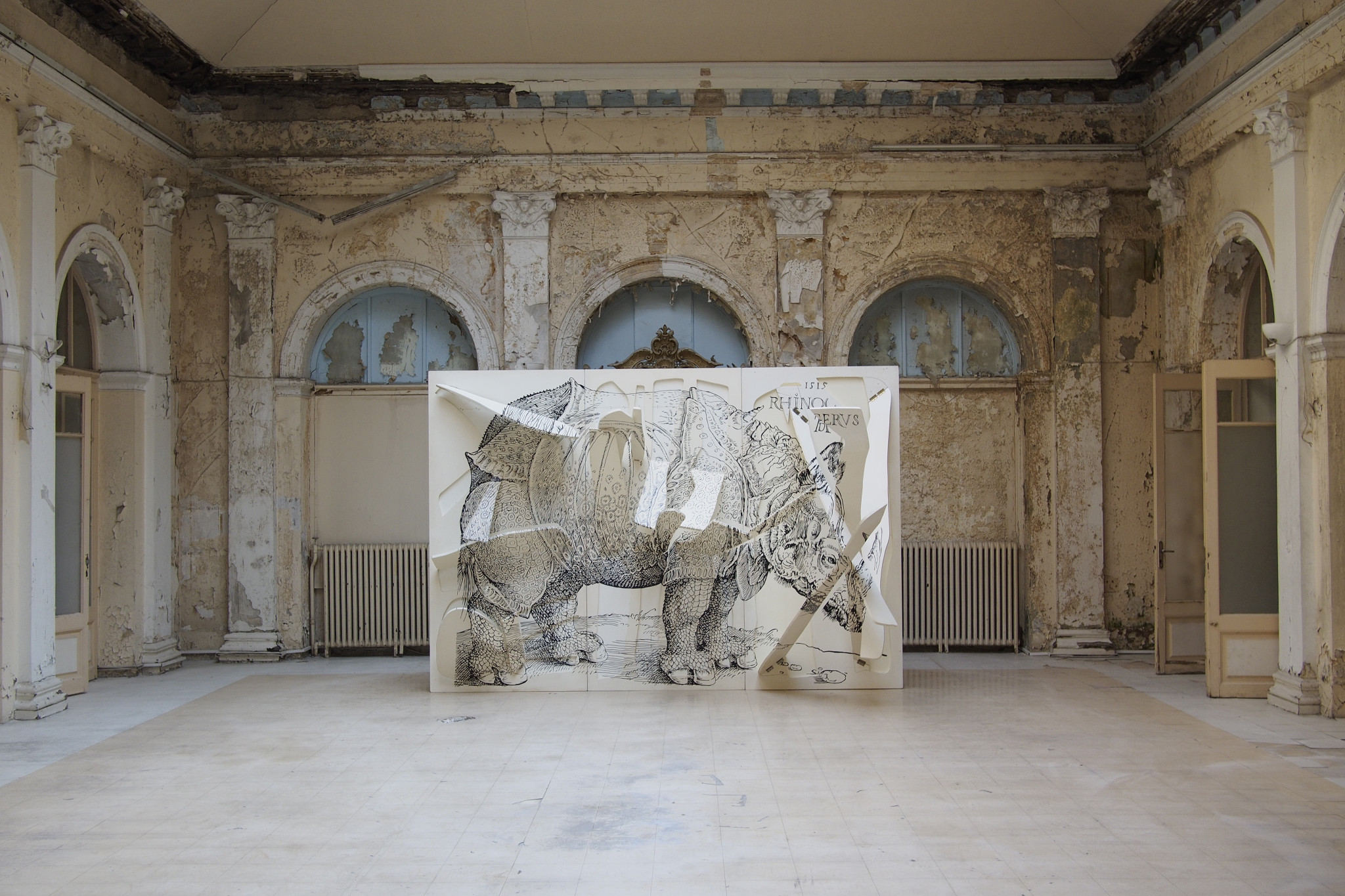 Νίκος Κεσσανλής, Ρινόκερος, 1997. Παραχώρηση: Κλάρα Ρωμανού. Φωτογραφία: Δημήτρης Τσουμπλέκας. Άποψη εγκατάστασης από την 5η Μπιενάλε της Αθήνας «ΟΜΟΝΟΙΑ» (2015-2017). Συνέλευση στη Σύναψη 1.0, 5η Μπιενάλε της Αθήνας «ΟΜΟΝΟΙΑ (2015