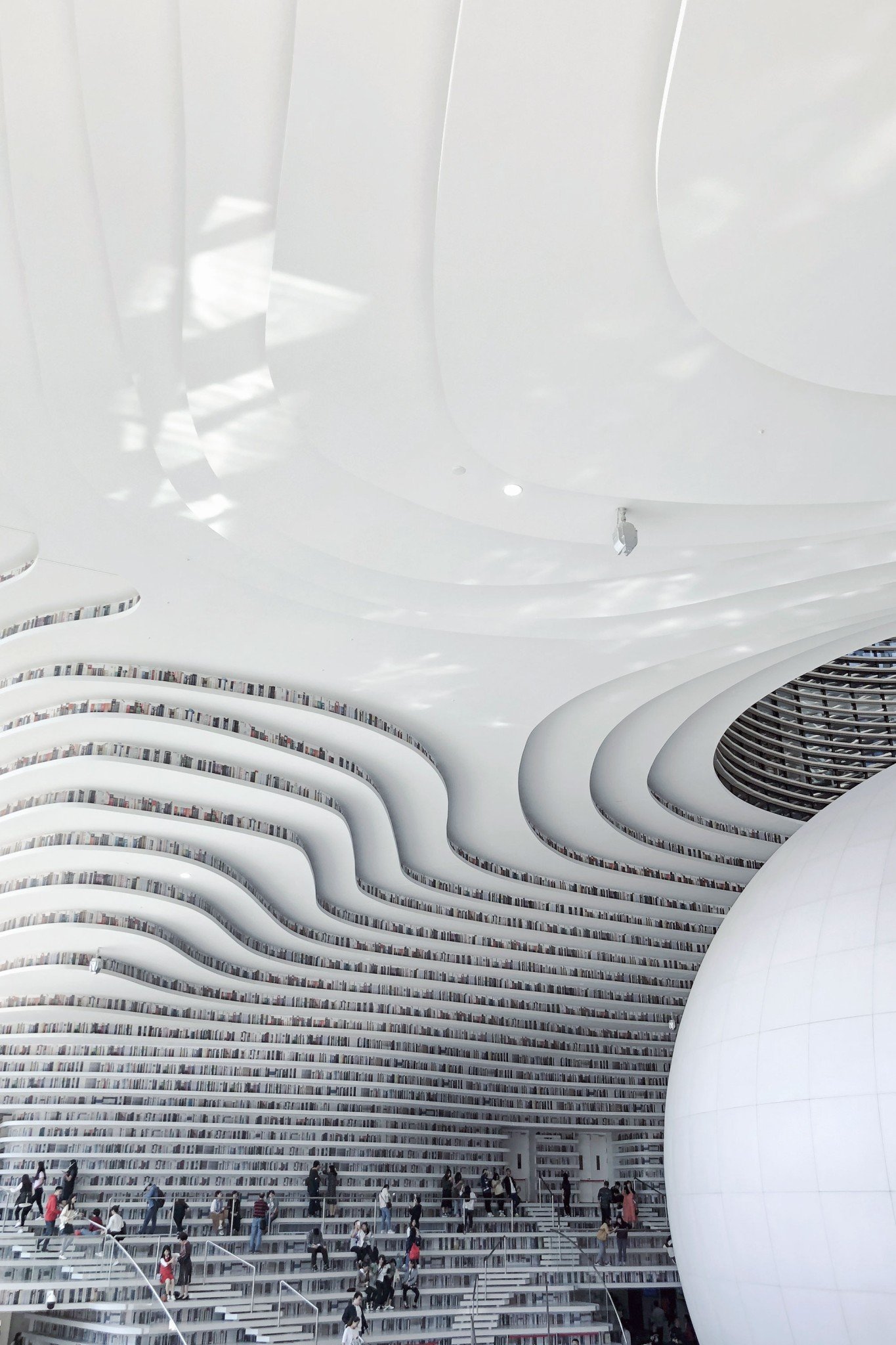 Περνώντας σε κάτι πολύ πιο μοντέρνο, εξίσου σαγηνευτικό, το κτίριο όπου στεγάζεται η βιβλιοθήκη Tianjin Binhai αποτελεί ένα τρανό παράδειγμα για το πώς θα είναι το design του μέλλοντος. Σε λευκές αποχρώσεις και άριστα τοποθετημένα τα βιβλία, πρόκειται για το τέλειο περιβάλλον όπου η ηρεμία και τα positive vibes έχουν πρωταγωνιστικό ρόλο. Μια από τις πιο νέες προσθήκες στο είδος στην Κίνα, η οποία είναι τοποθετημένη στη λίστα με τις πιο κορυφαίες βιβλιοθήκες στον κόσμο και ο λόγος είναι ξεκάθαρος!