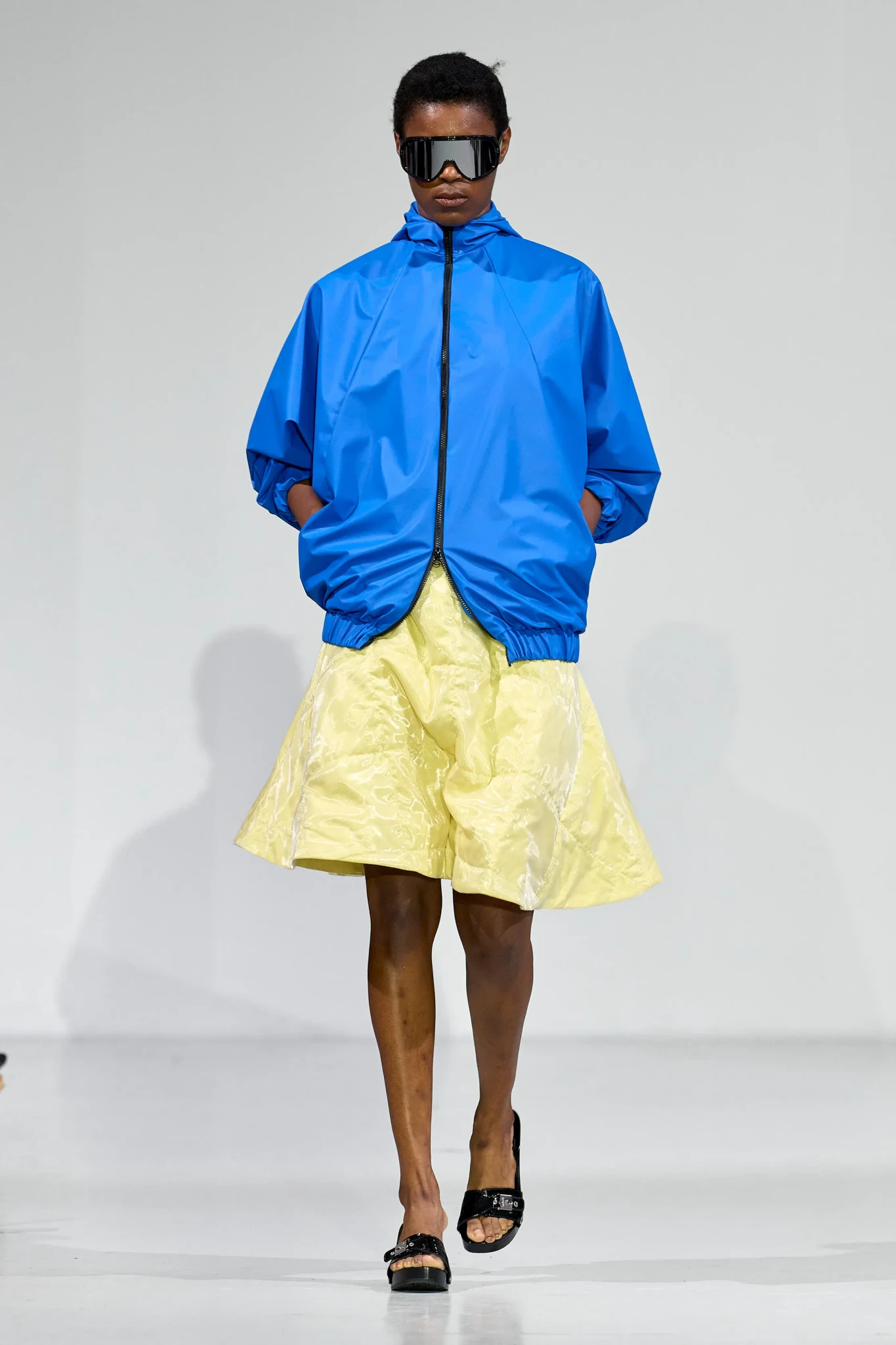 Τα σκανδιναβικά brands λατρεύουν τις αντιθέσεις. Για την Άνοιξη/Καλοκαίρι 2026, οι σχεδιαστές συνδύασαν σπορ ανόρακ και αντιανεμικά με χαριτωμένες φούστες. Το Skall Studio παρουσίασε ένα υπέροχο κρεμ σύνολο συνδυασμένο με λευκές κάλτσες και ψηλοτάκουν παπούτσια, πάλι σε ουδέτερες αποχρώσεις. Ο Nicklas Skovgaard, με τη σειρά του, χάρισε στο κοινό ένα ηλεκτρίκ αντιανεμικό με μια butter yellow φούστα. Τλεος, στο Rave Review, ένα πράσινο ανόρακ φορέθηκε με μια τσαλακωμένη midi skirt. Το point είναι ότι αντί να συνδυάζουμε τα άνορακ με αντίστοιχα αθλητικά κομμάτια, όπως biker shorts και sneakers, μπορούμε να τα δοκιμάσουμε με παιχνιδιάρικες φούστες και πιο girly επιλογές. Το φθινόπωρο που πλησιάζει είναι ιδανική ευκαιρία για να δοκιμάσουμε αυτό, το νέο, στιλ.