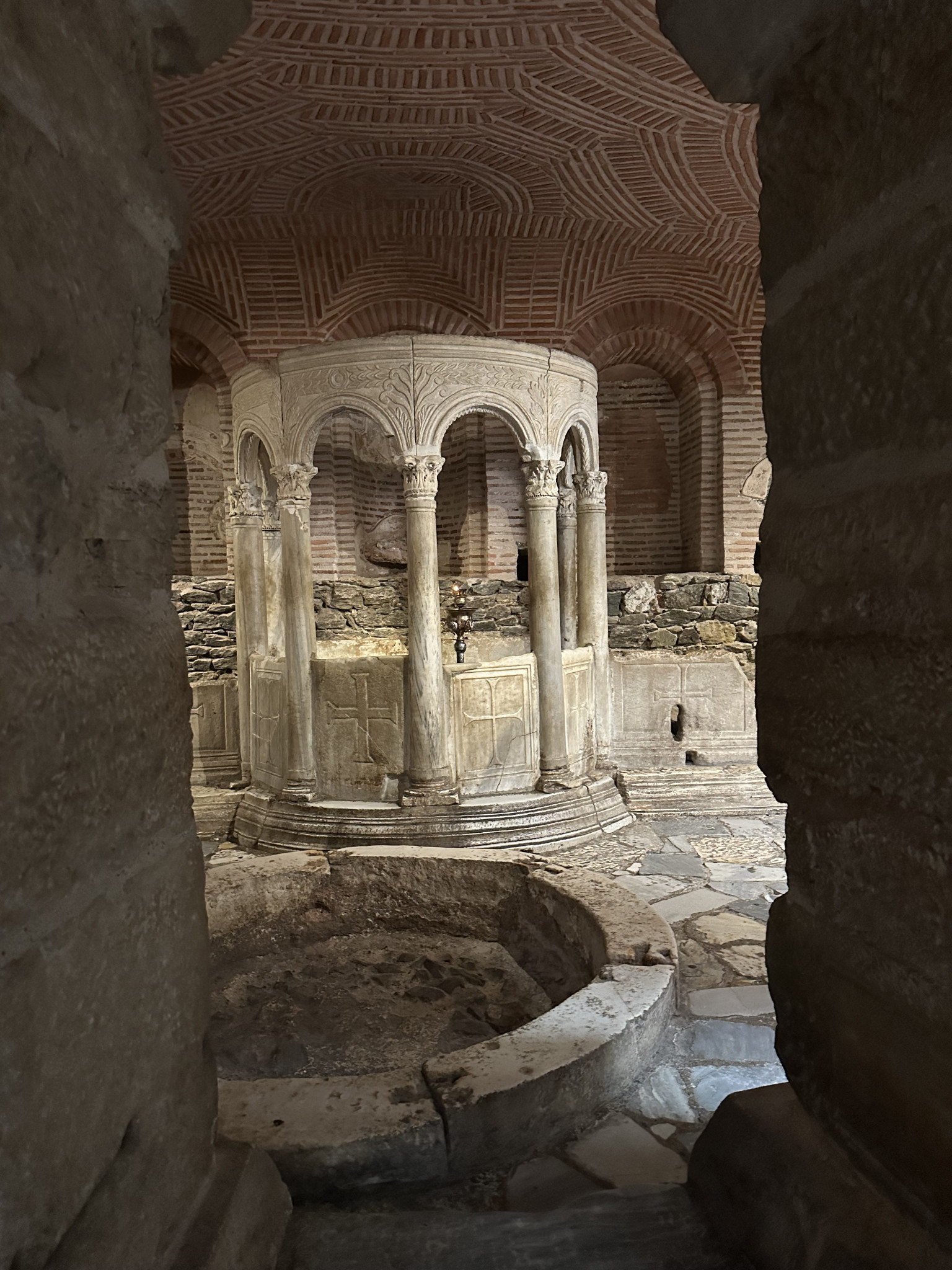 Ο ιστορικός ναός, αφιερωμένος στον πολιούχο της Θεσσαλονίκης, ξεκίνησε την πορεία του ως ένα μικρό προσευχητήριο τον 4ο αιώνα μ.Χ. Σήμερα, η είσοδος της κρύπτης του, που βρίσκεται δίπλα στον δεξιό πεσσό του ιερού βήματος, οδηγεί σε έναν χώρο βαθιάς ιστορικής και πνευματικής σημασίας: τον τόπο μαρτυρίας του Αγίου, χτισμένο σε σημείο που αποτελούσε τμήμα του μεγάλου ρωμαϊκού λουτρού της πόλης. Ένας τόπος όπου η ιστορία, η θρησκευτική πίστη και η αρχιτεκτονική κληρονομιά συναντώνται με τρόπο μοναδικό.