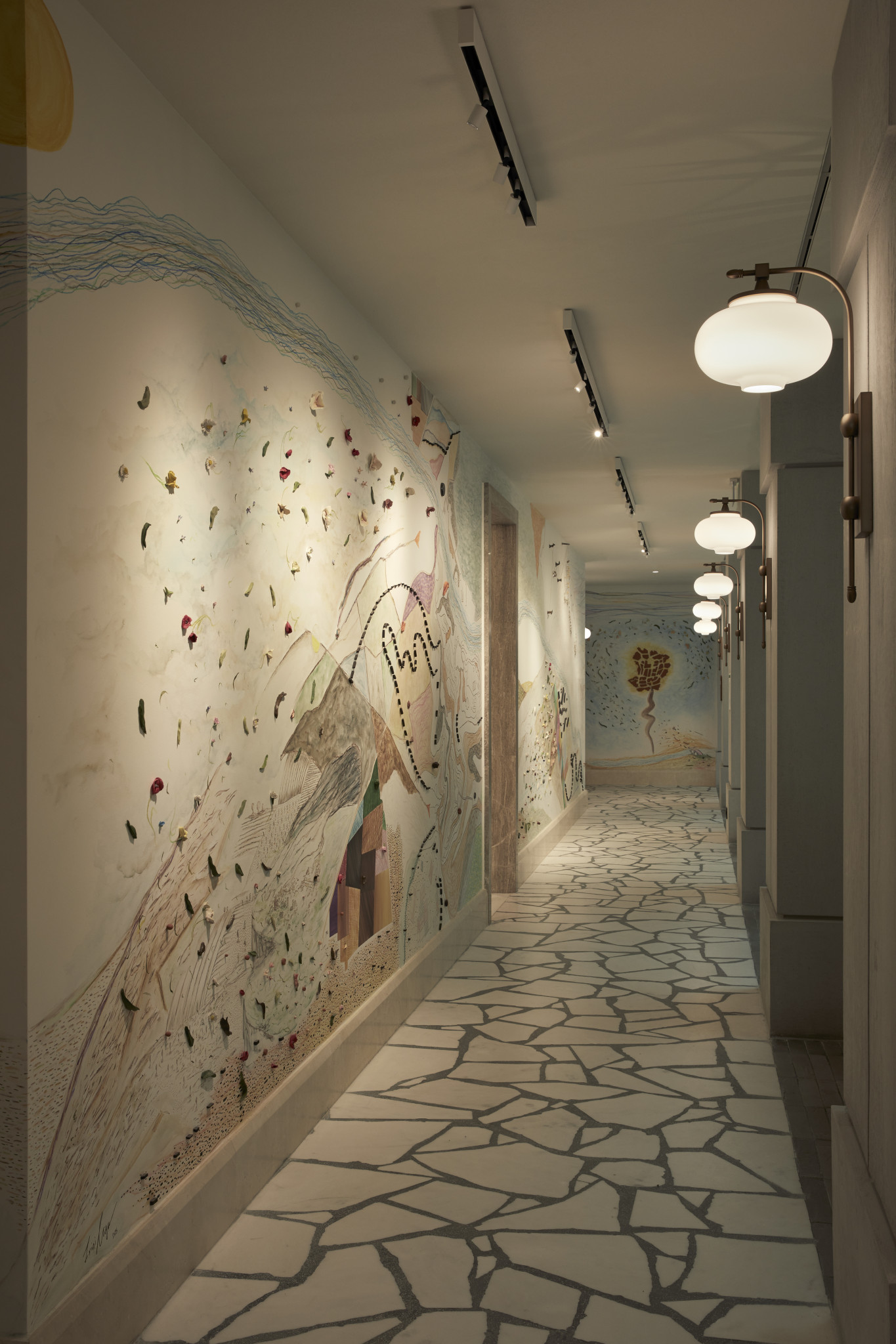 Η τέχνη αποτελεί αναπόσπαστο μέρος της ταυτότητας του House of NYNN και ενσωματώνεται στον χώρο ως ενεργό στοιχείο της εμπειρίας. Ξεχωρίζει η μνημειακή ταπισερί του Κωστή Βελώνη, εμπνευσμένη από την ιστορική πτώση μετεωρίτη στο Ensisheim το 1492, η οποία μεταφράζει μια ζωγραφική σύνθεση σε υφαντό έργο μεγάλης κλίμακας, μέσα από παραδοσιακές τεχνικές που διατηρούν ζωντανή τη χειροτεχνική γνώση. Στον διάδρομο, η τοιχογραφία “The Garden of Memories” της Ειρήνης Μίγα μετατρέπει τον χώρο σε μια αφήγηση που συνδέει τη μνήμη της Αθήνας με το παρόν, μέσα από φυσικά υλικά, κεραμικά στοιχεία και αναφορές στον Ίλισό. Παράλληλα, ο Ανδρέας Αγγελιδάκης, με το έργο “Memorabilia from Another Dimension”, επανερμηνεύει την εικόνα του Hilton ως μια φαντασιακή καρτ ποστάλ, σχολιάζοντας τη σχέση της πόλης με την Ίστορία και τον σύγχρονο υπερτουρισμό.